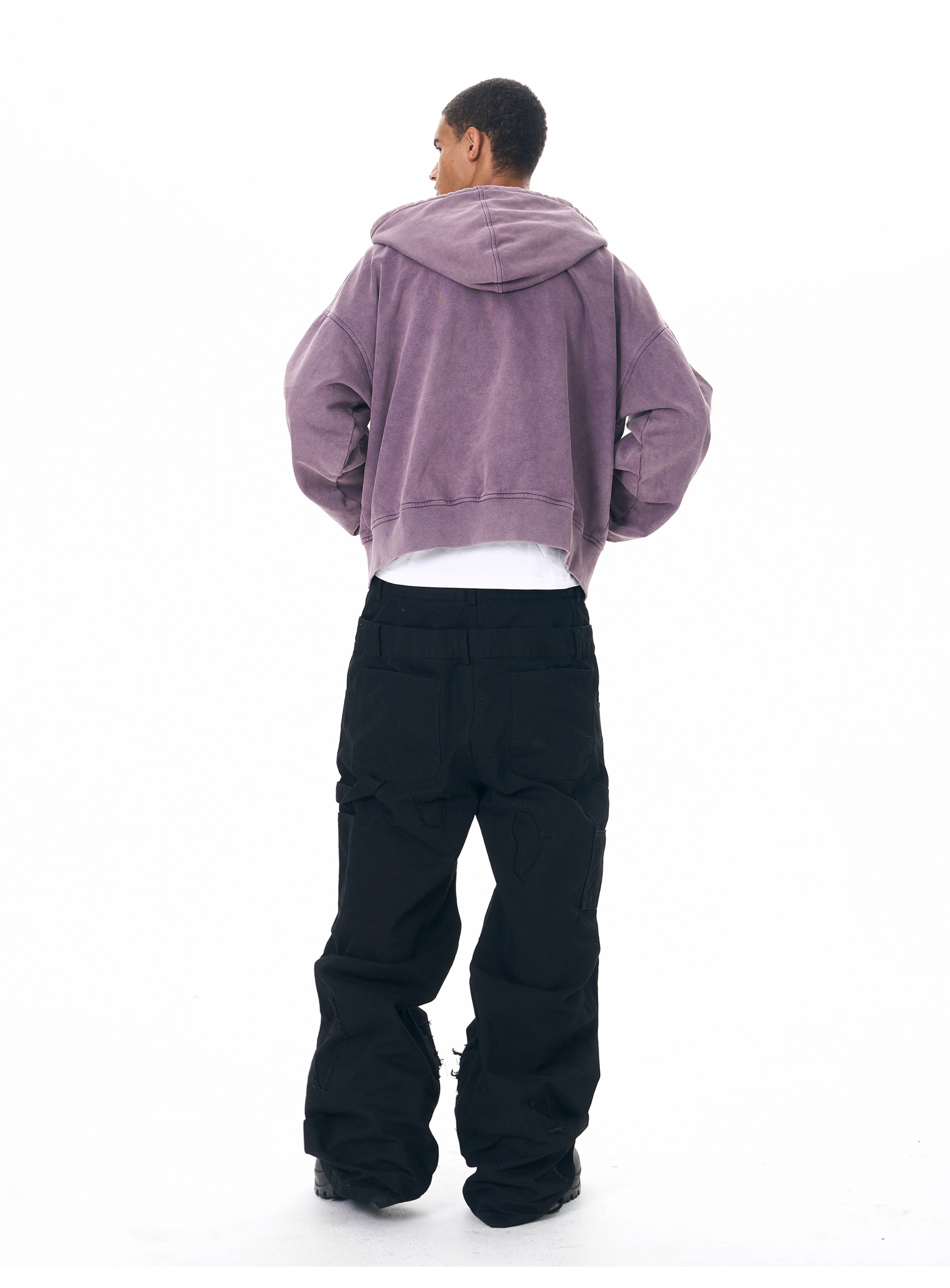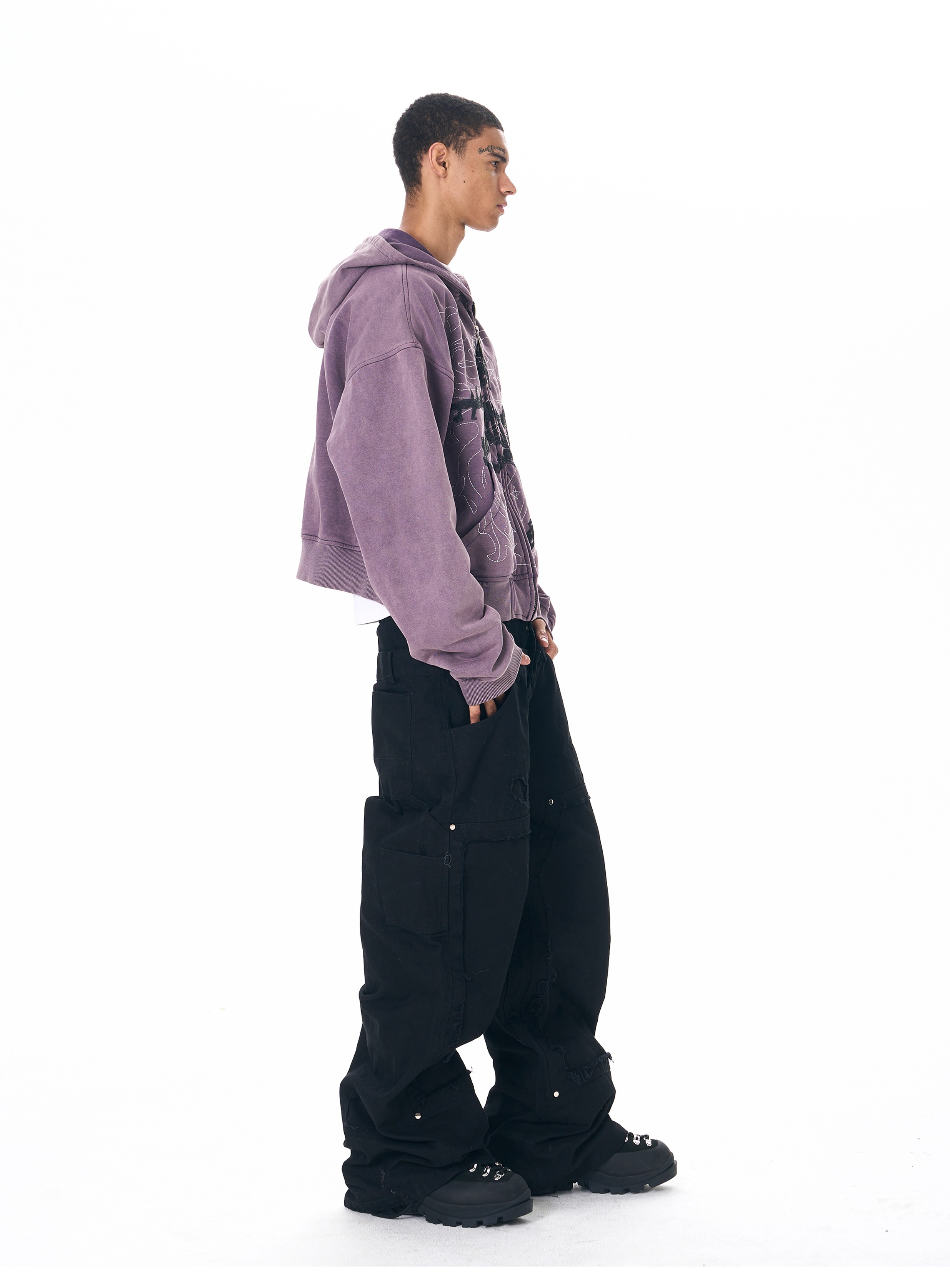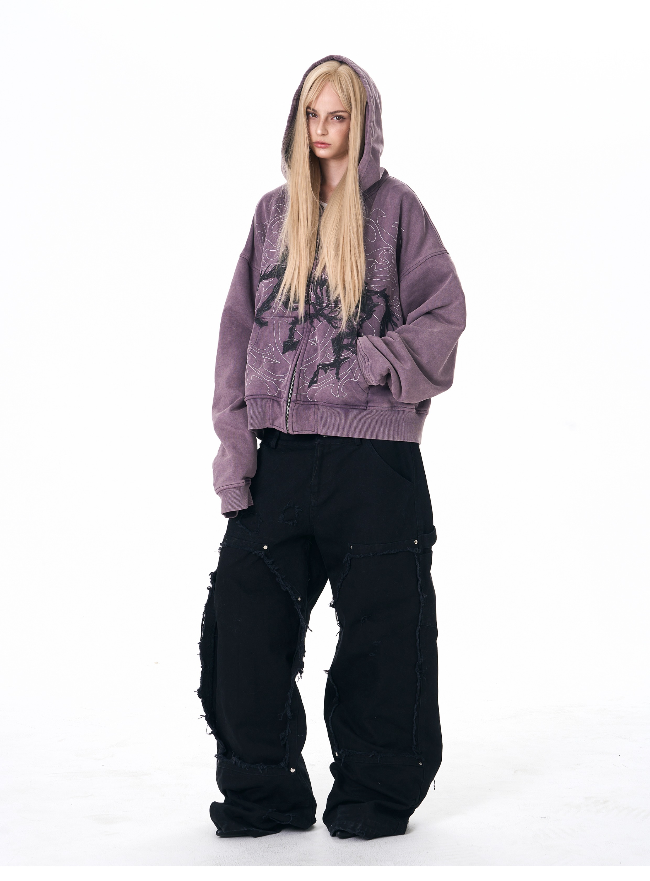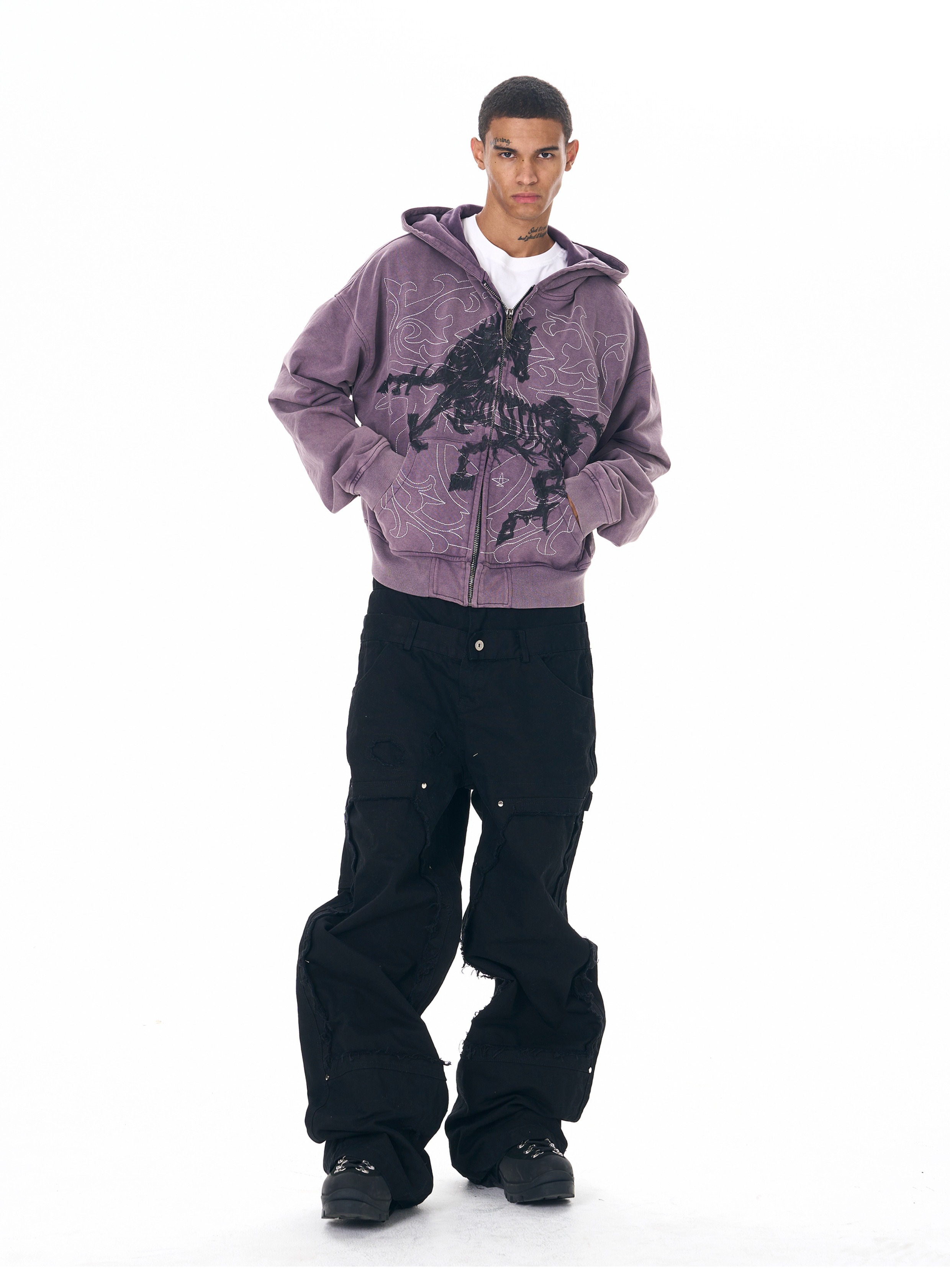 Fourth3ex 25FW 手繪刺綉戰馬連帽衛衣外套男秋季水洗做舊帽衫