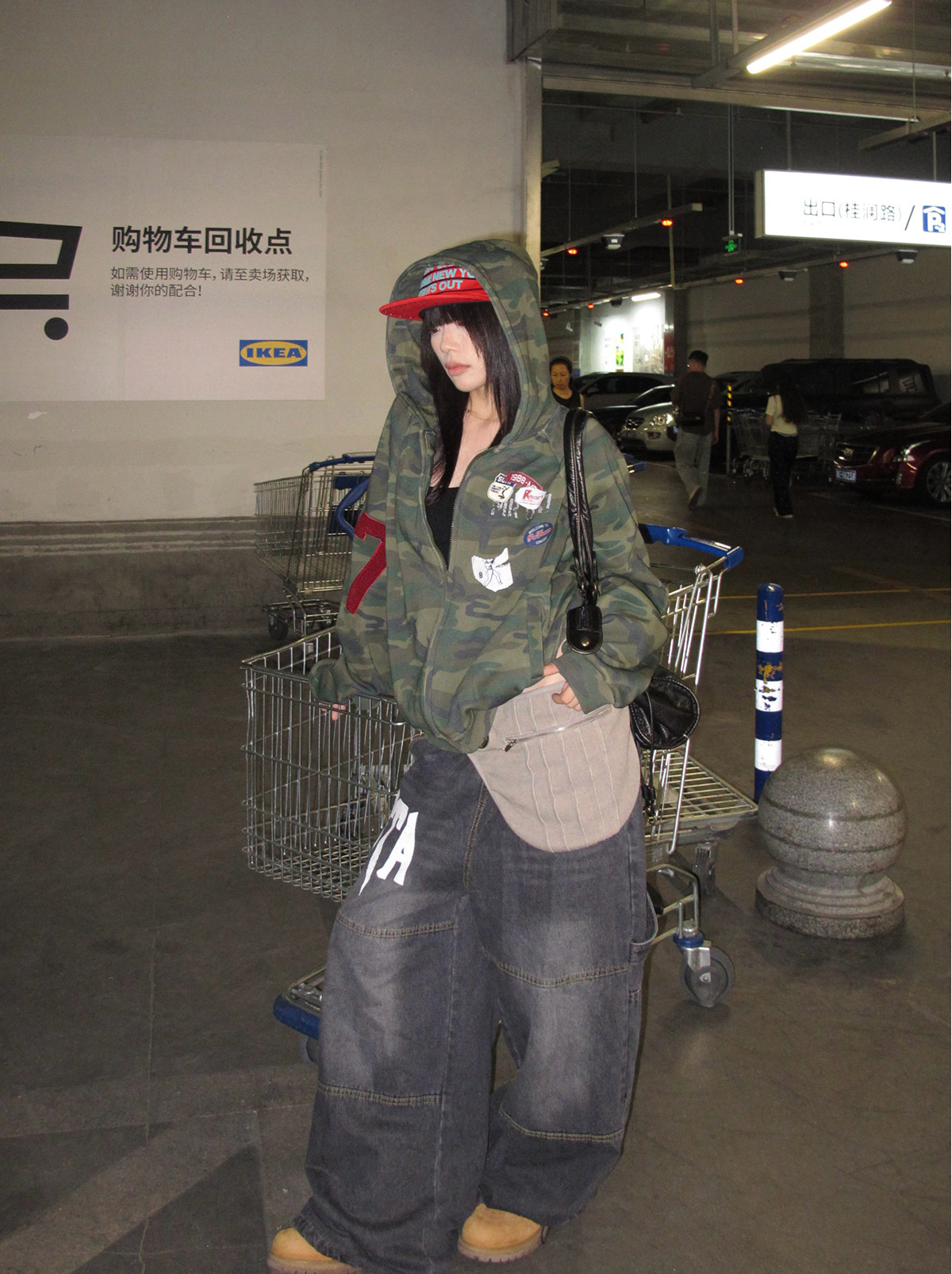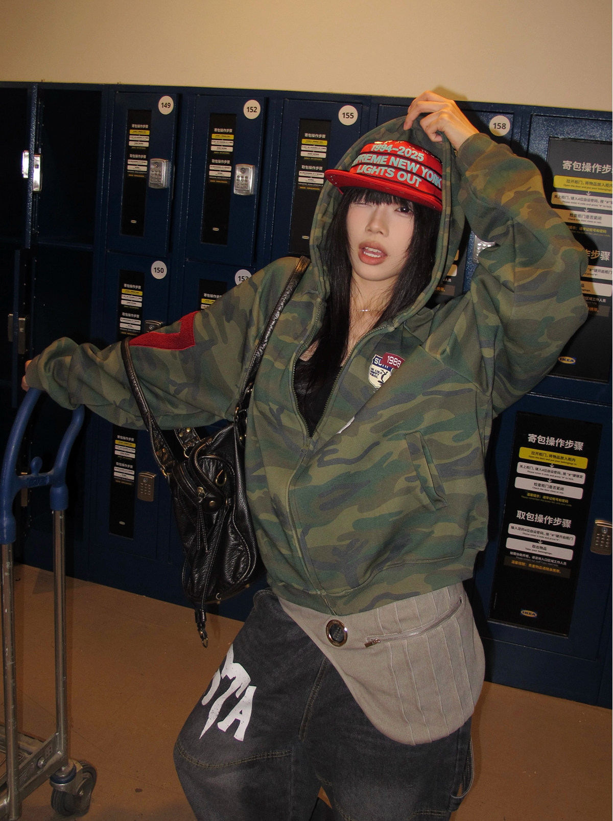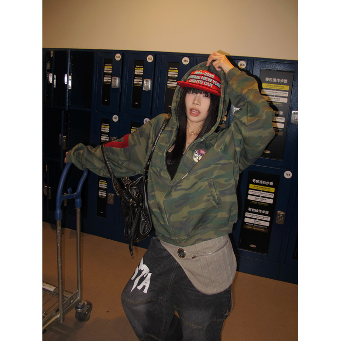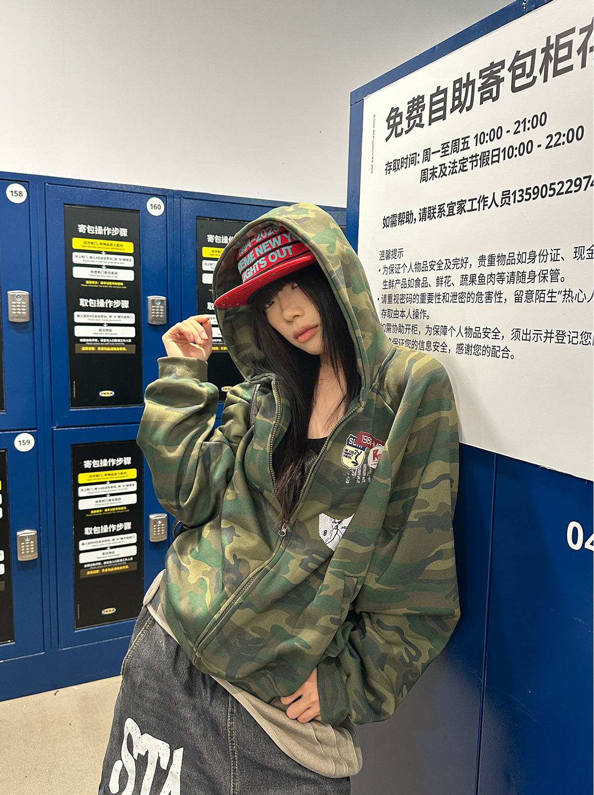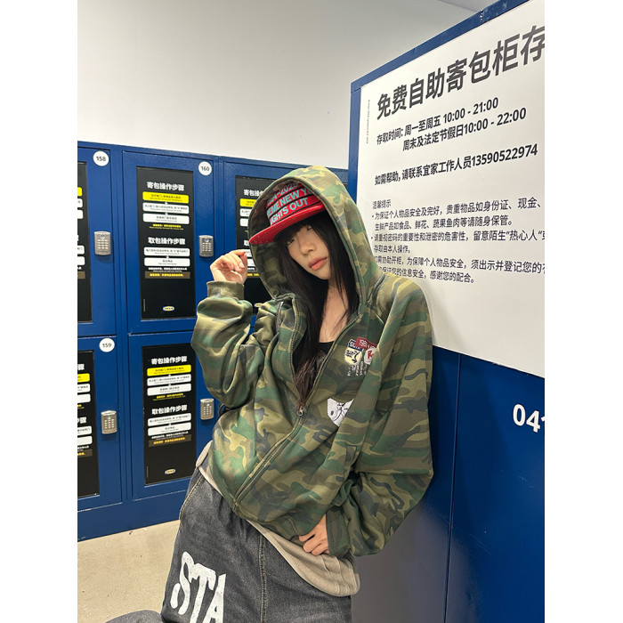 EAHO 美式潮牌迷彩加絨開衫連帽衛衣男女秋冬寬松休閒百搭帽衫