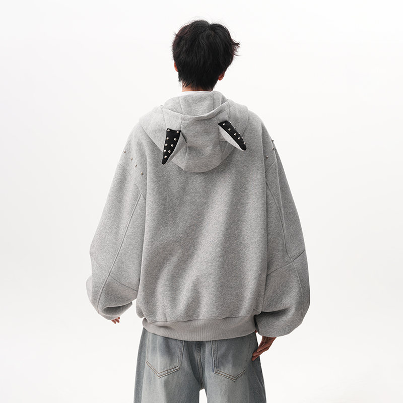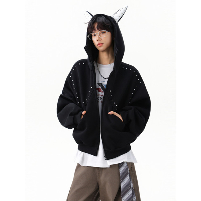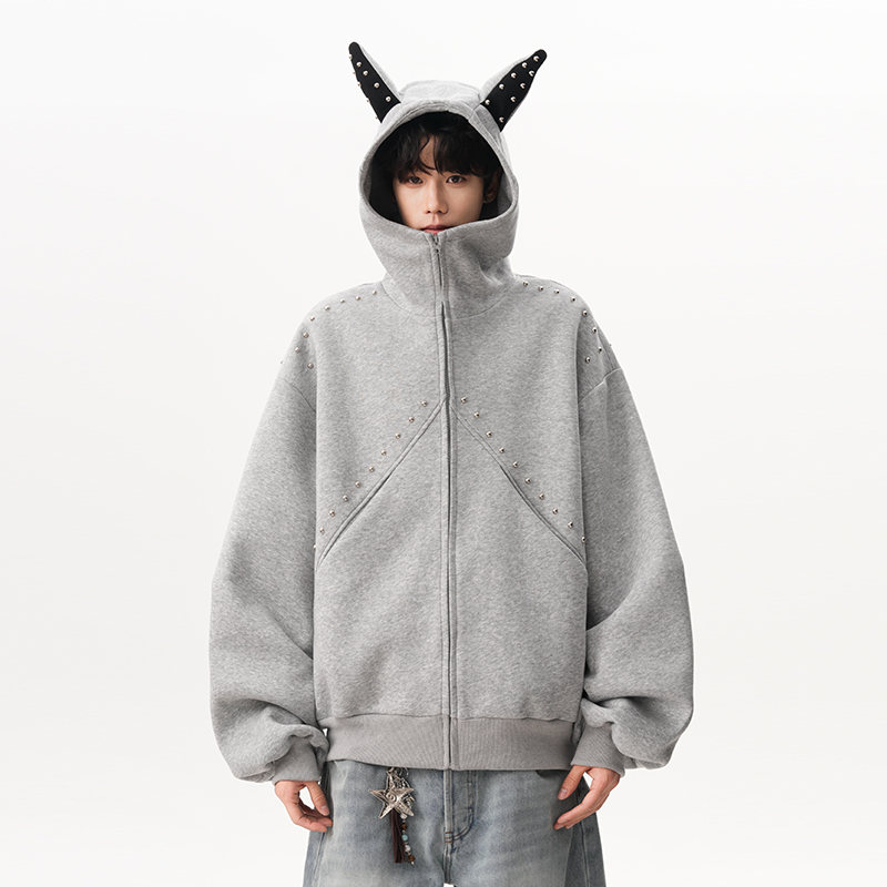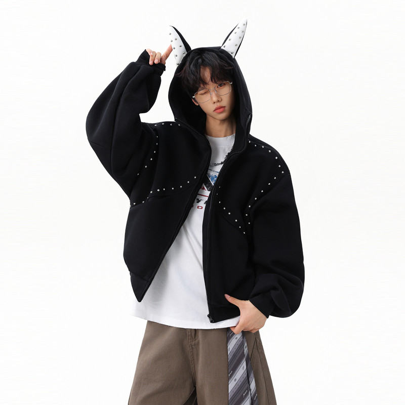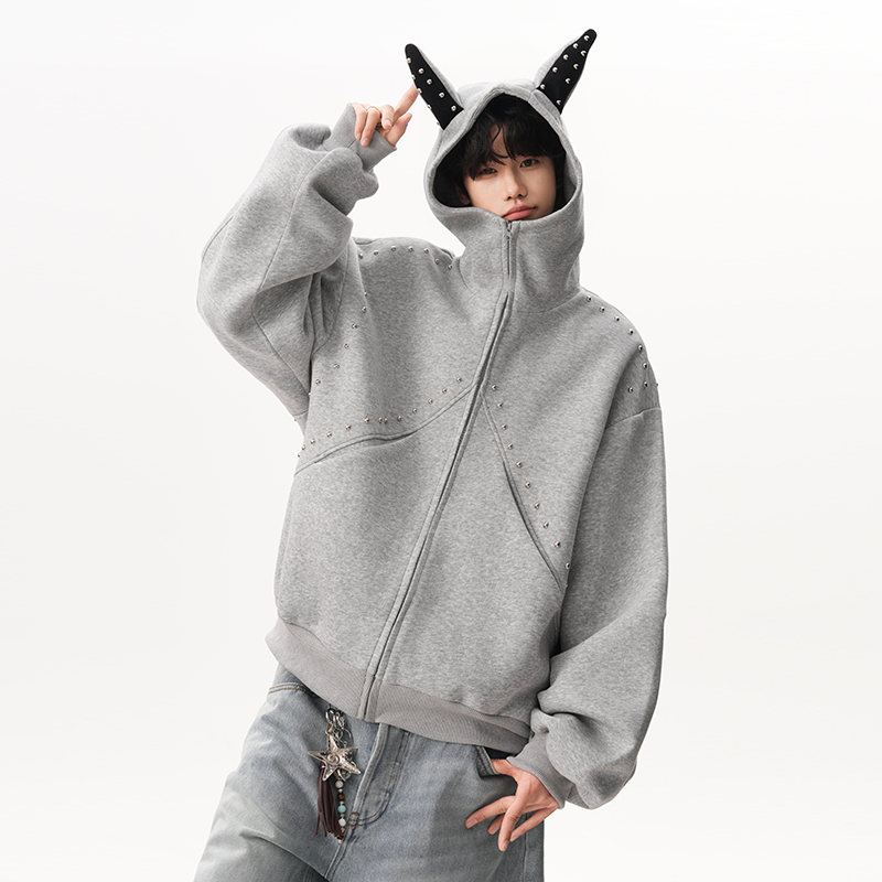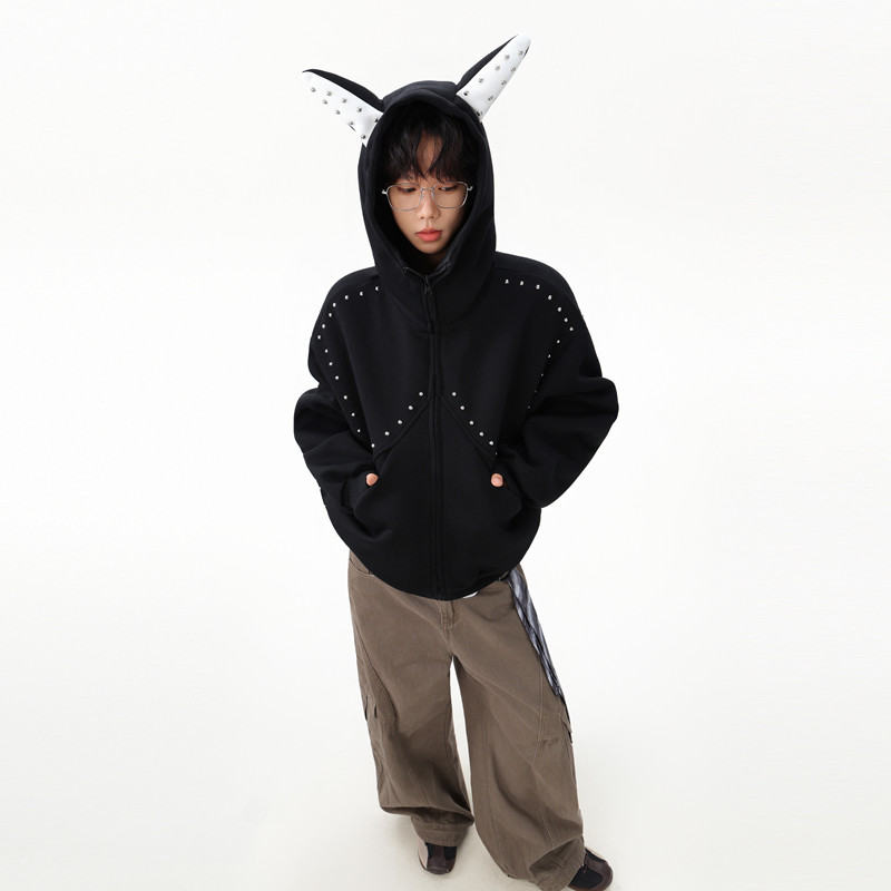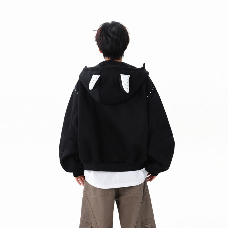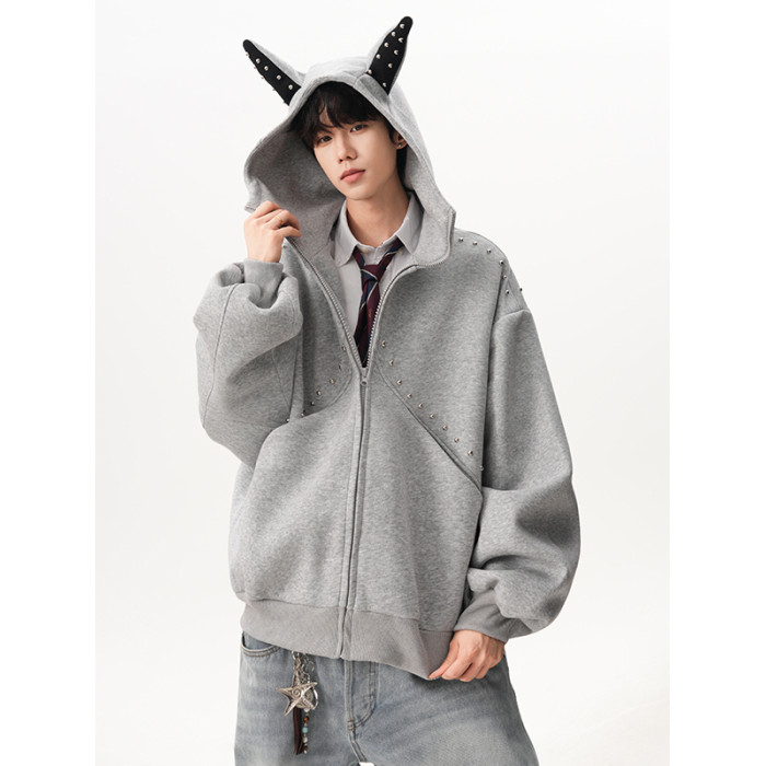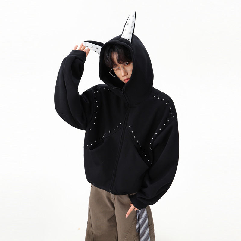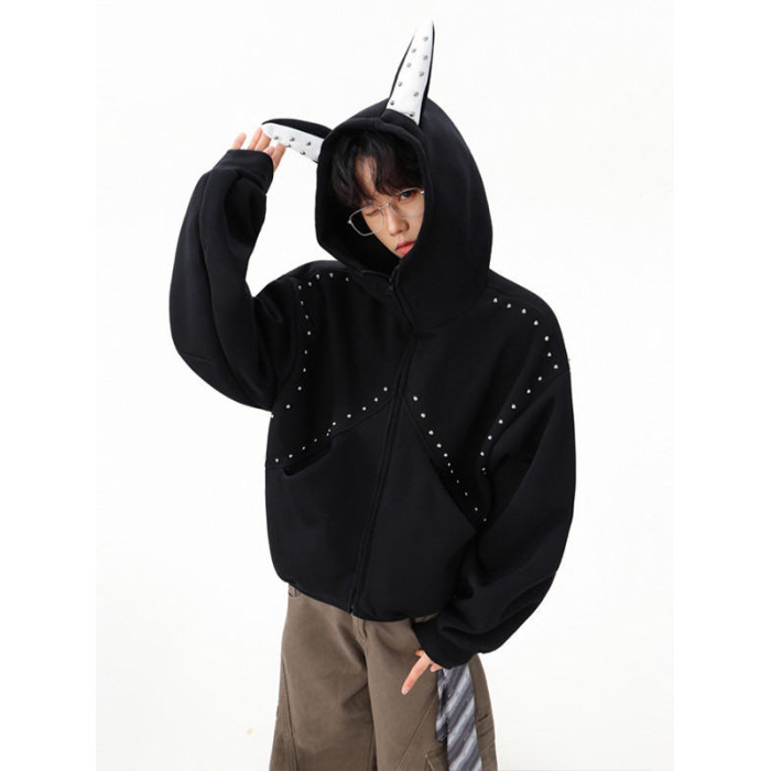 設計感鉚釘拼接杜賓犬耳連帽衛衣男女秋季潮小衆百搭重磅情侶外套