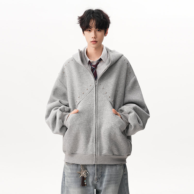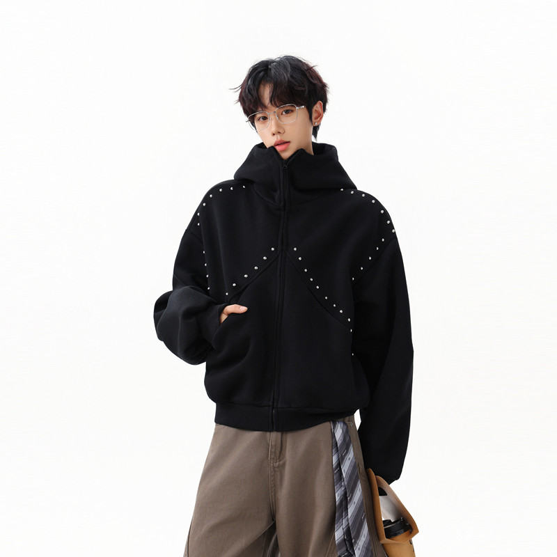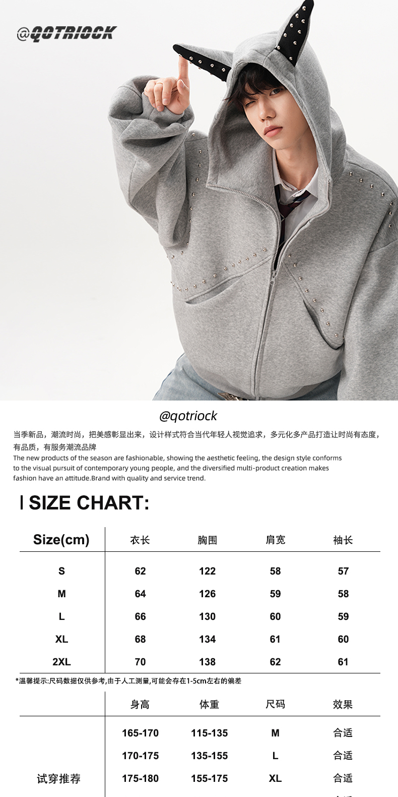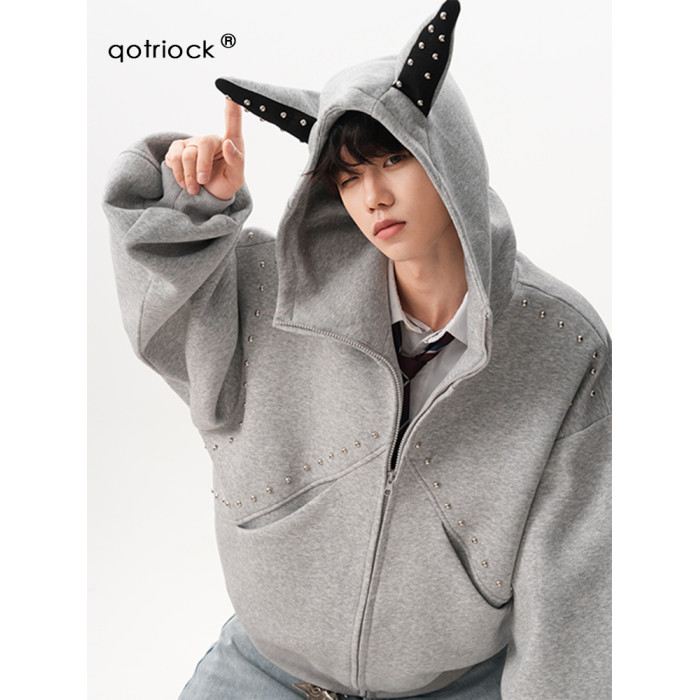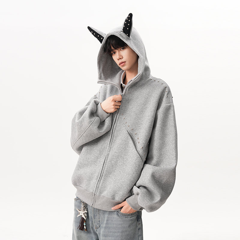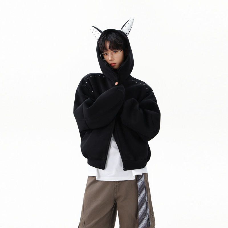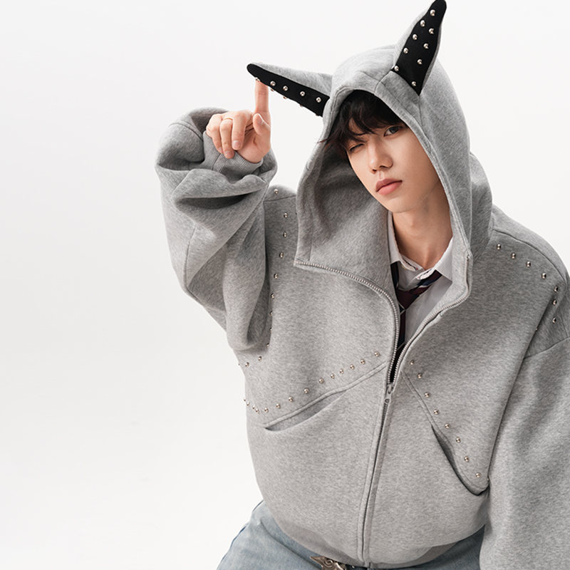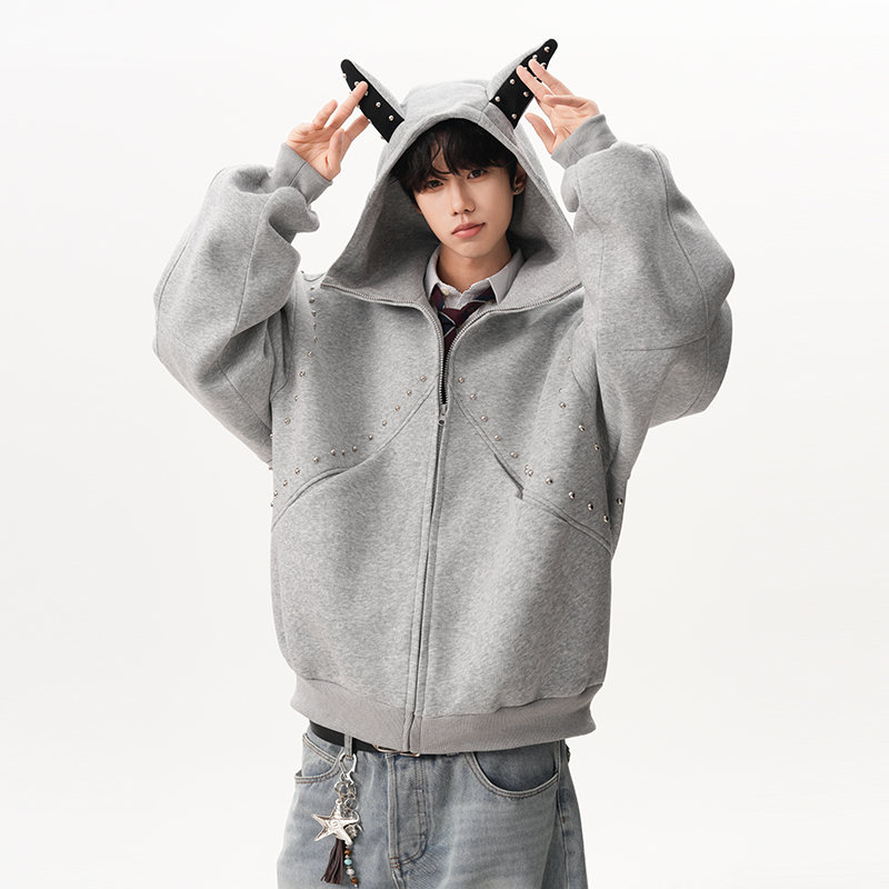 設計感鉚釘拼接杜賓犬耳連帽衛衣男女秋季潮小衆百搭重磅情侶外套