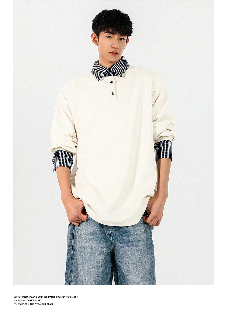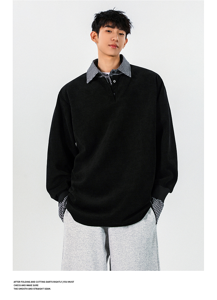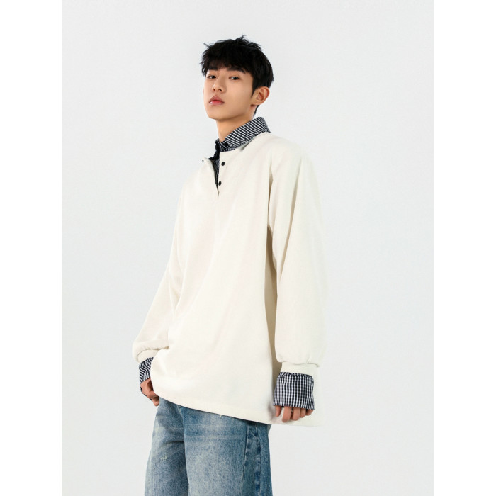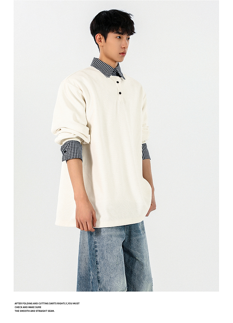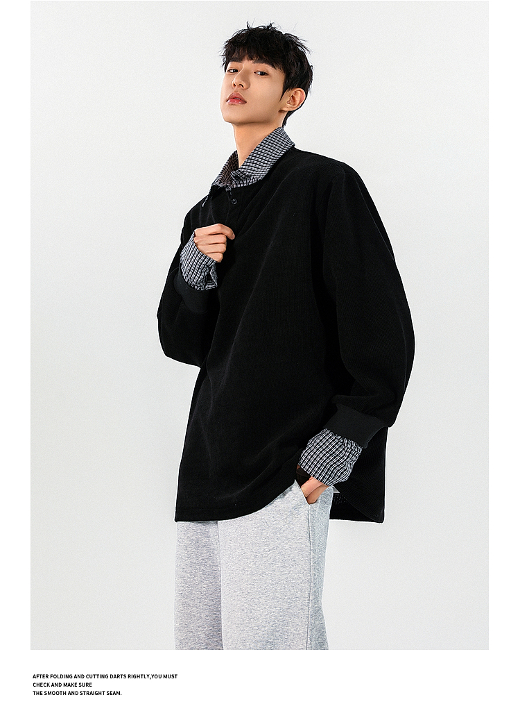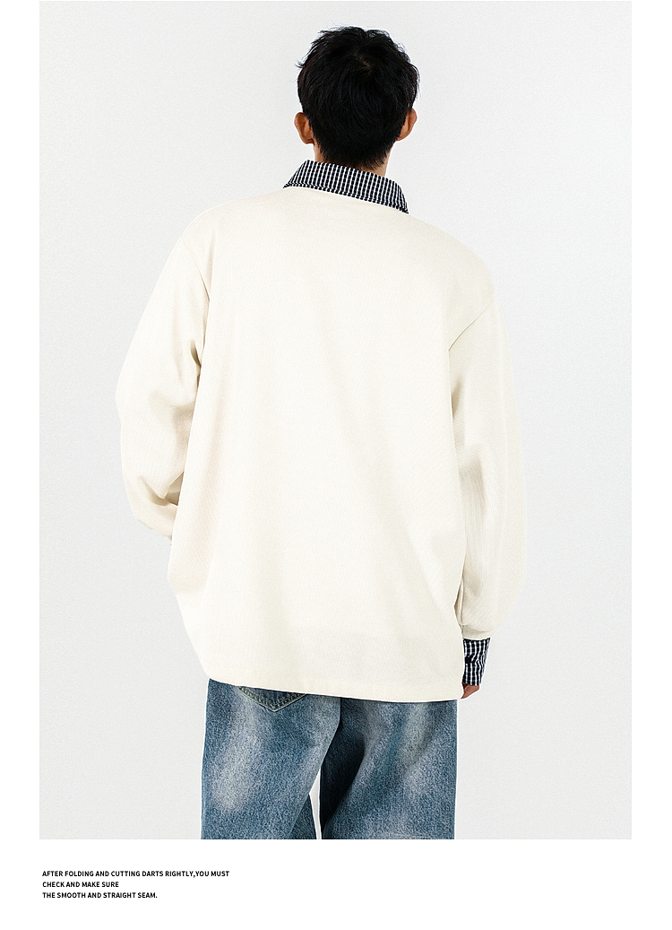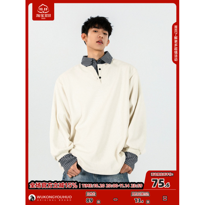 悟空有貨潮牌格子假兩件拼接翻領衛衣男復古寬松情侶百搭POLO上衣