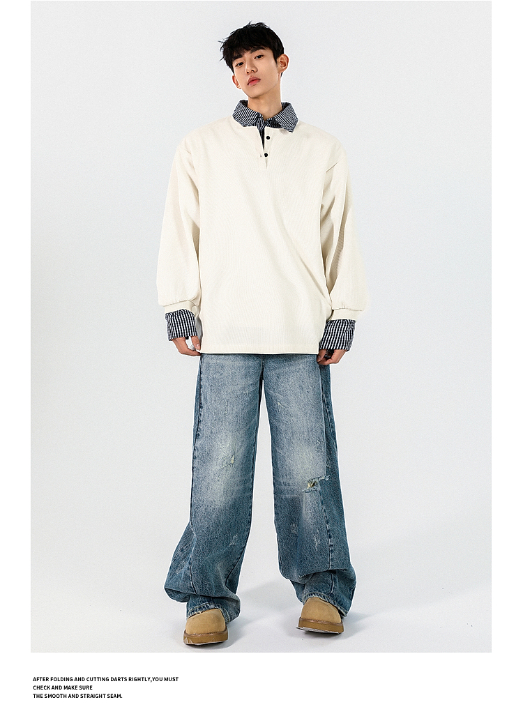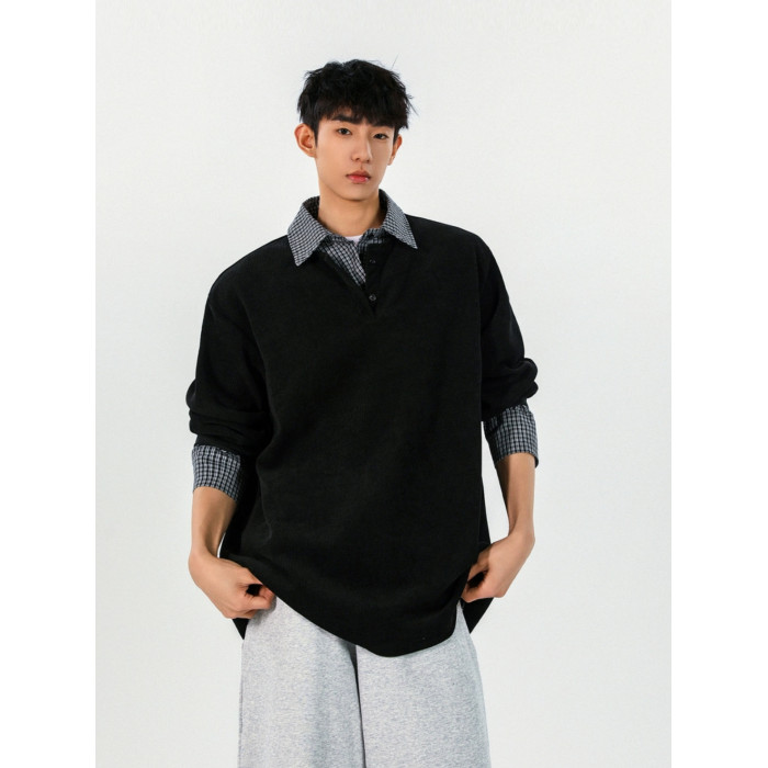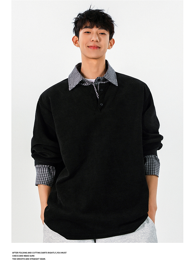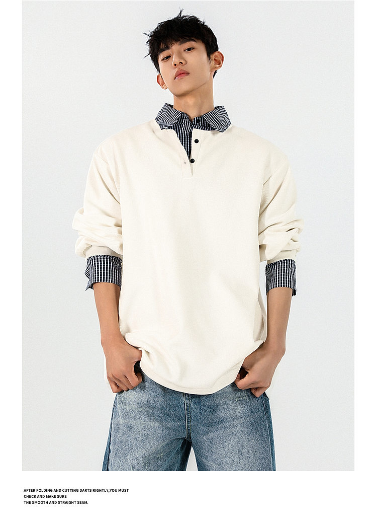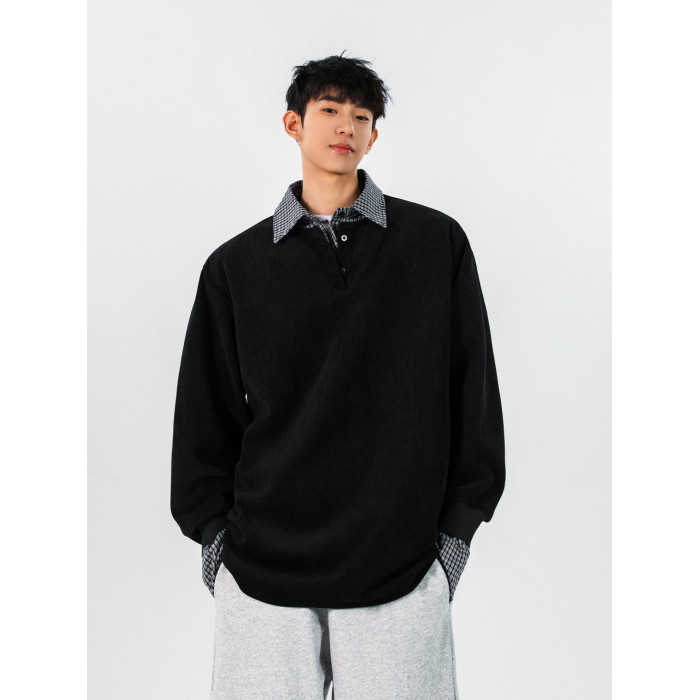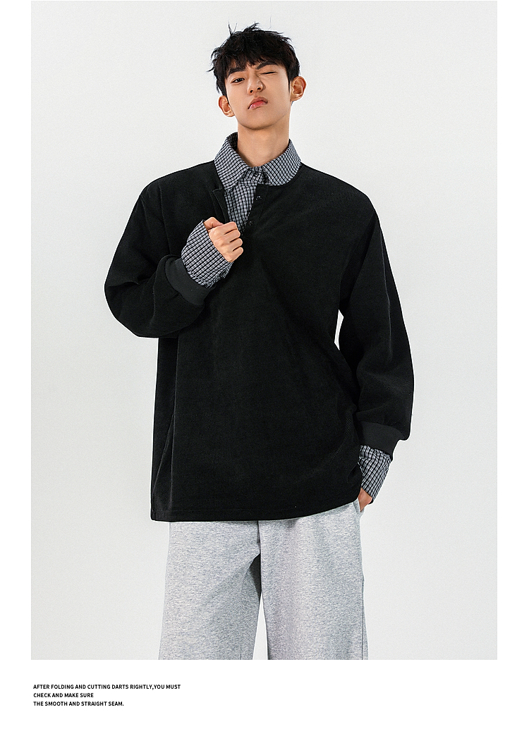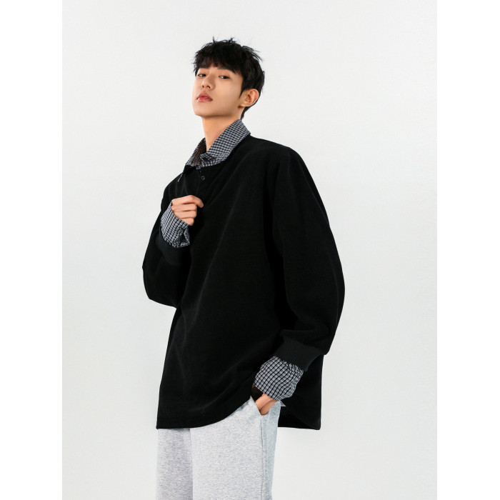 悟空有貨潮牌格子假兩件拼接翻領衛衣男復古寬松情侶百搭POLO上衣