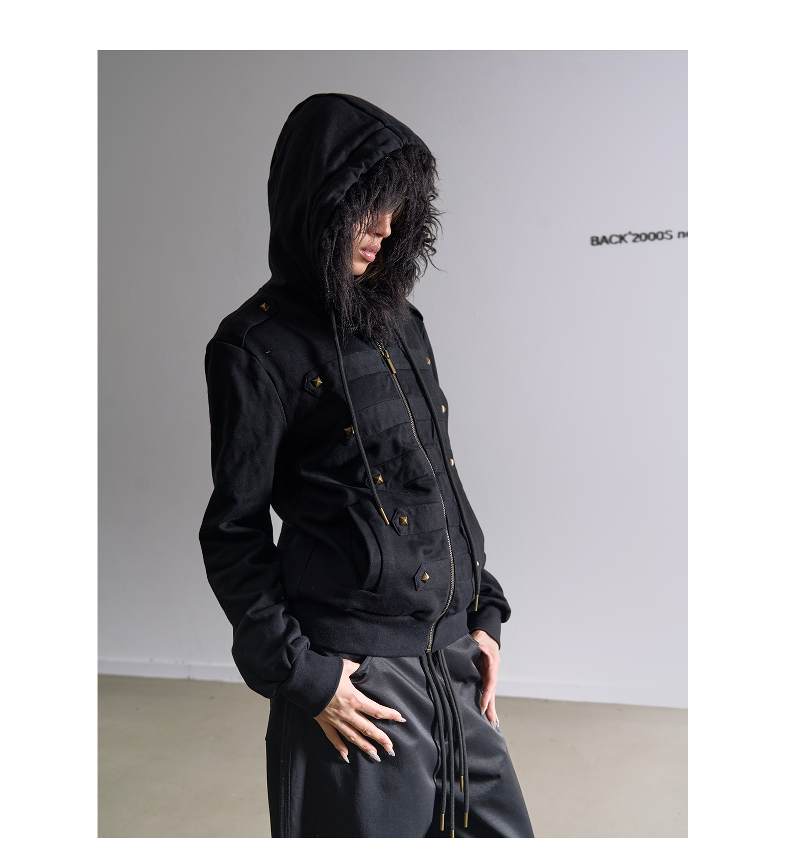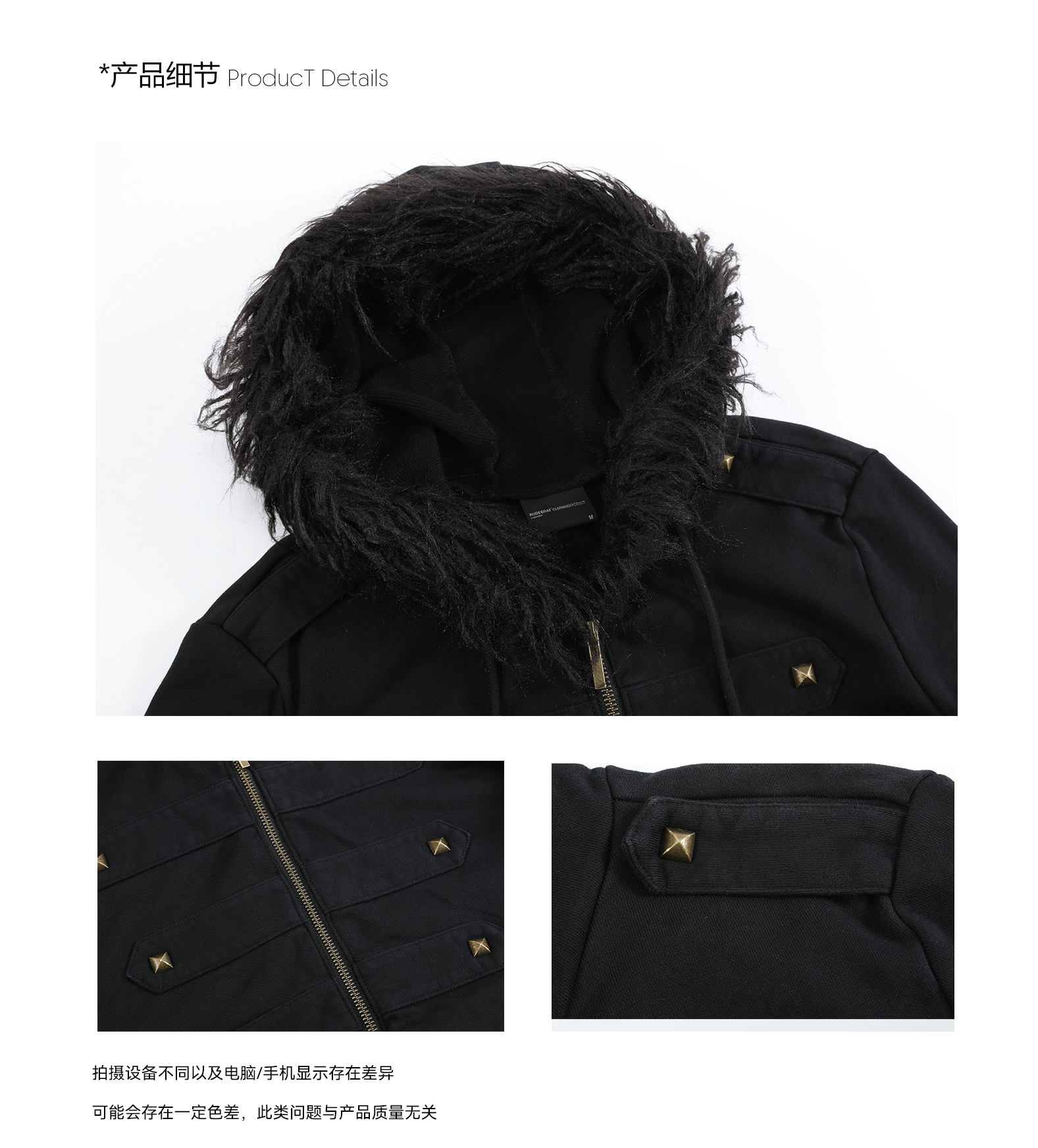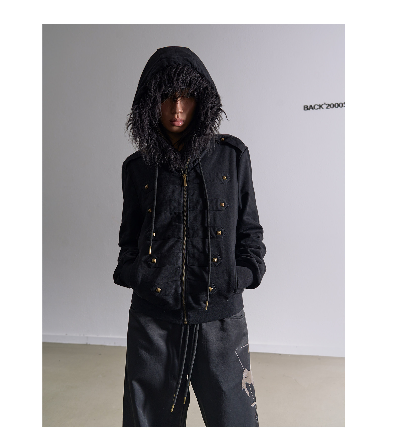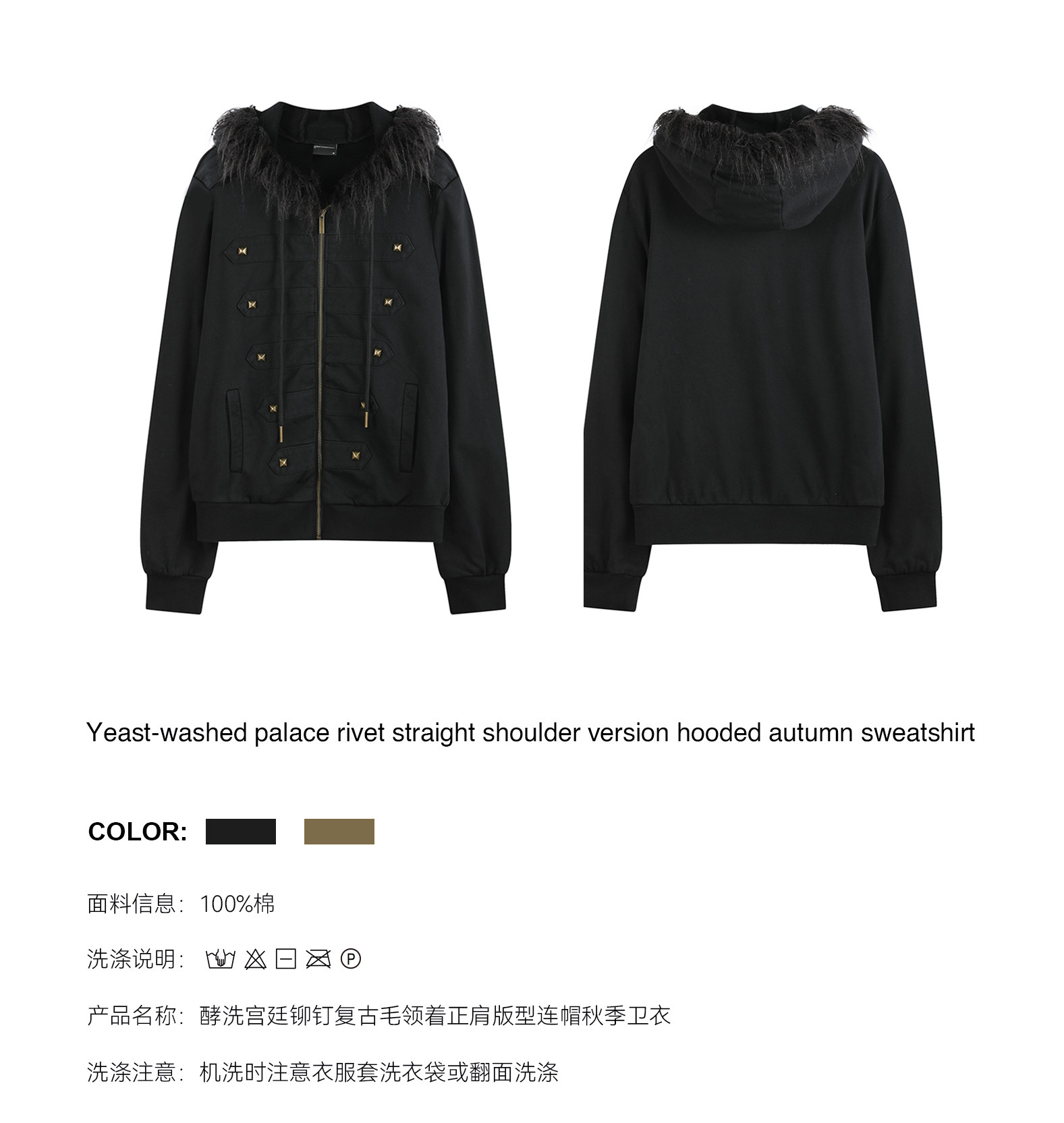 noEmosen(noE)酵洗宮廷鉚釘復古毛領著正肩版型連帽秋季衛衣
