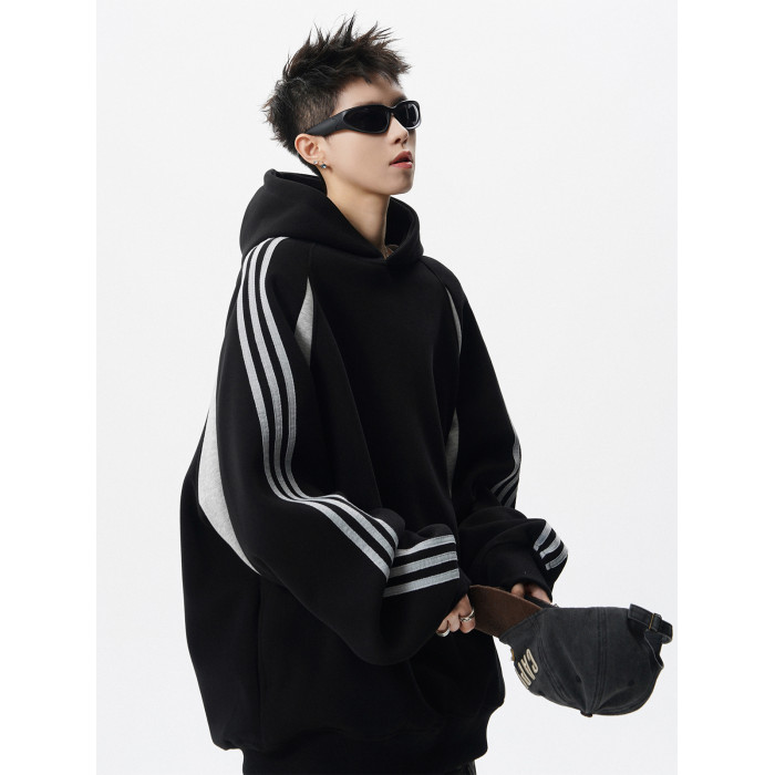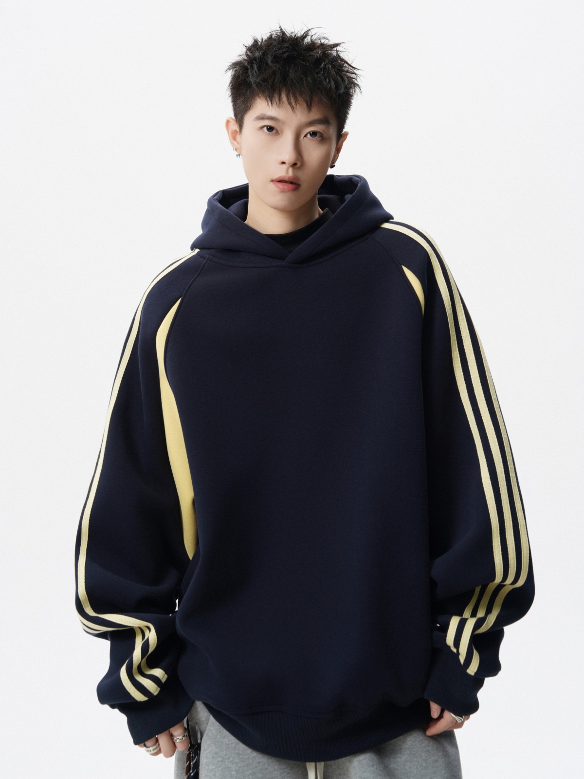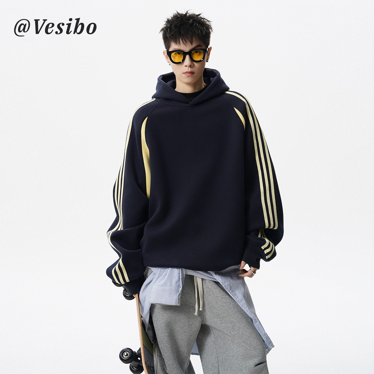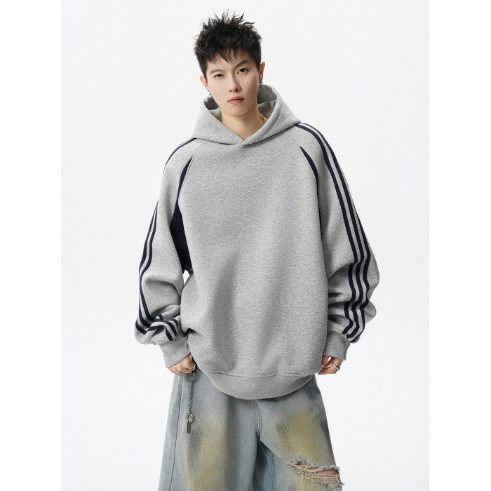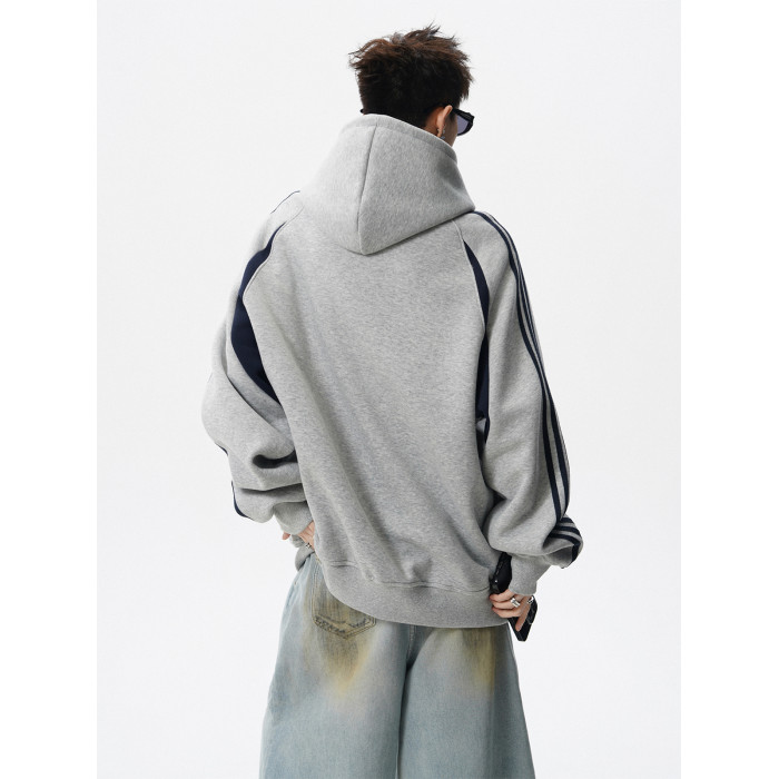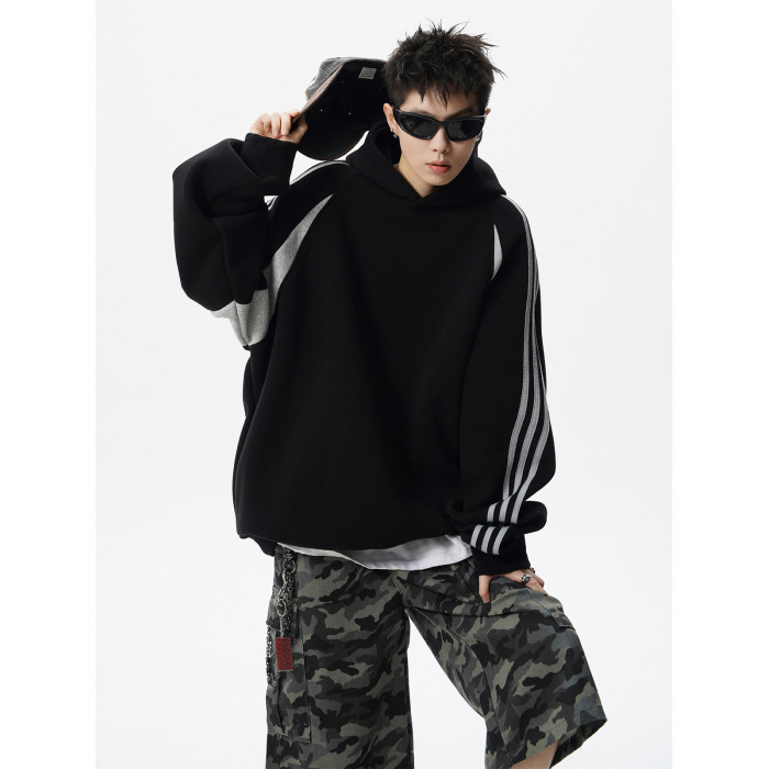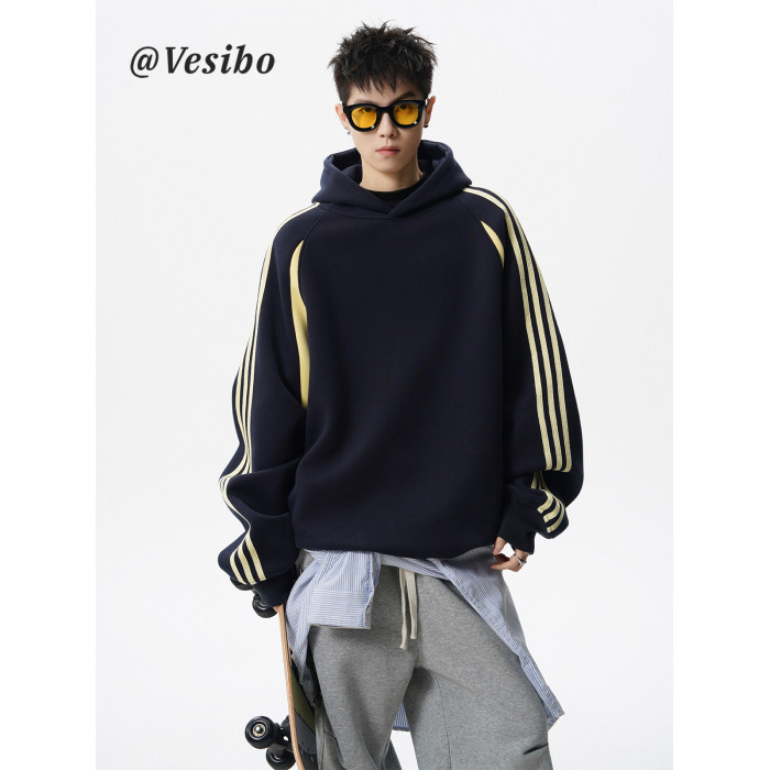 美式潮牌拼色連帽衛衣男款秋季復古寬松休閒上衣高街條紋運動帽衫