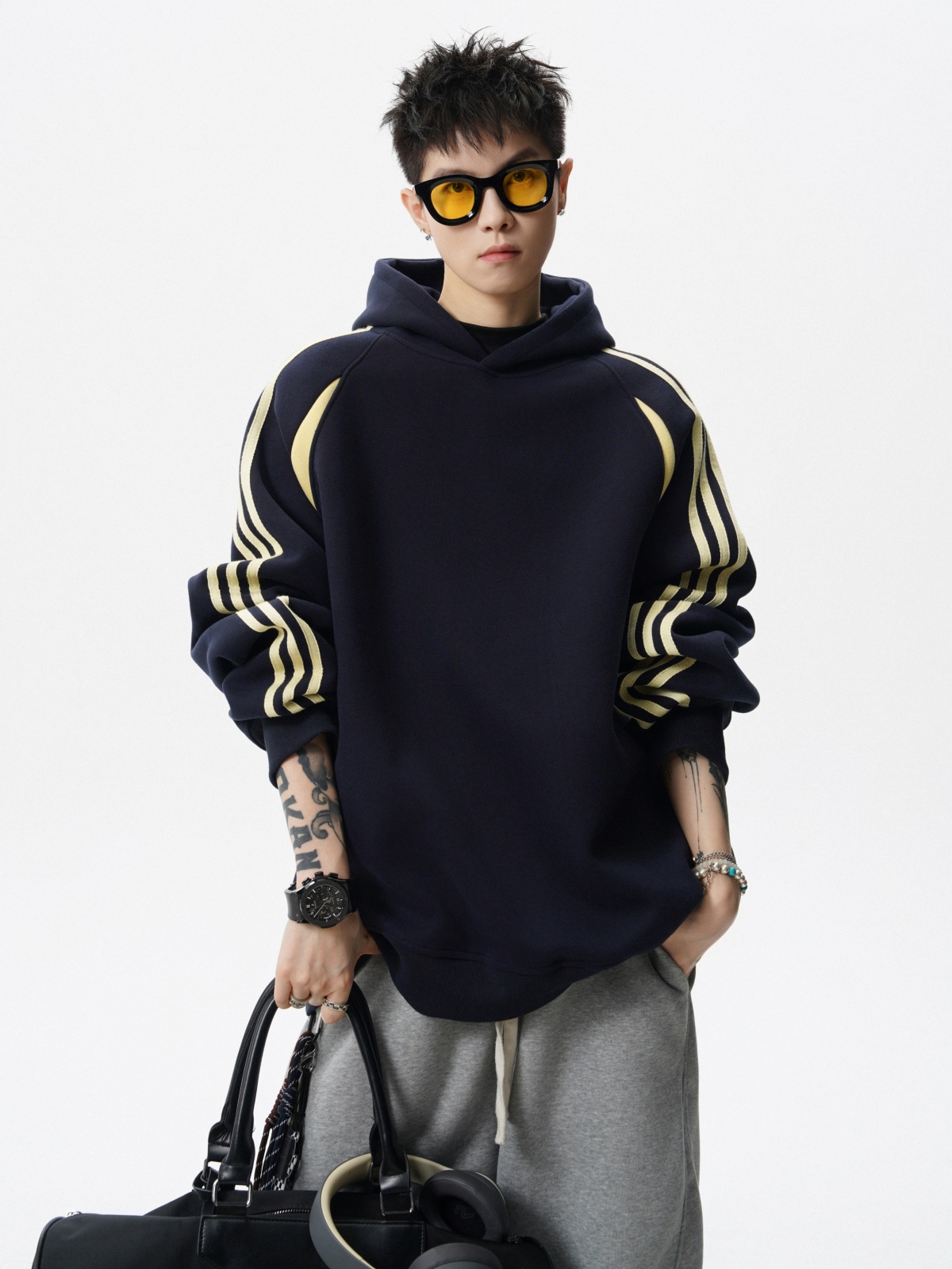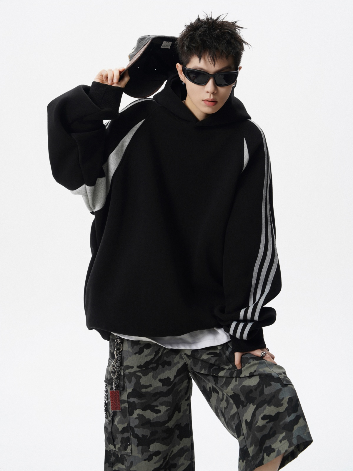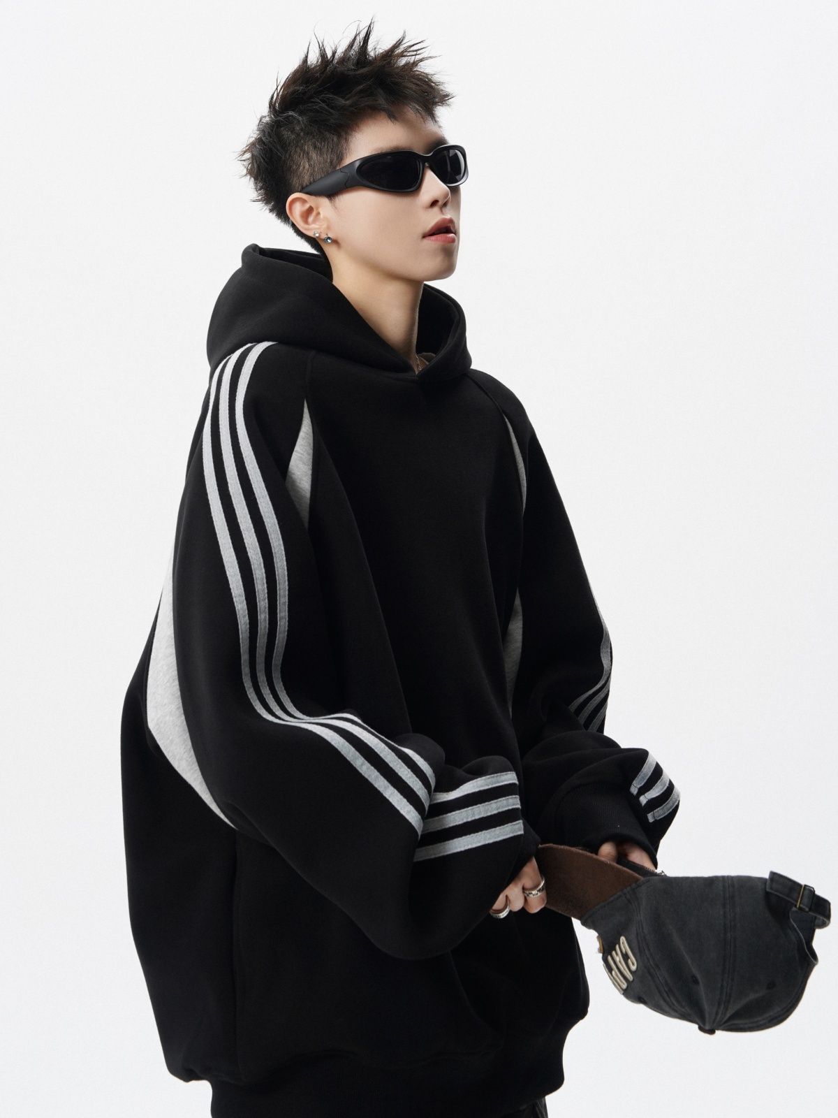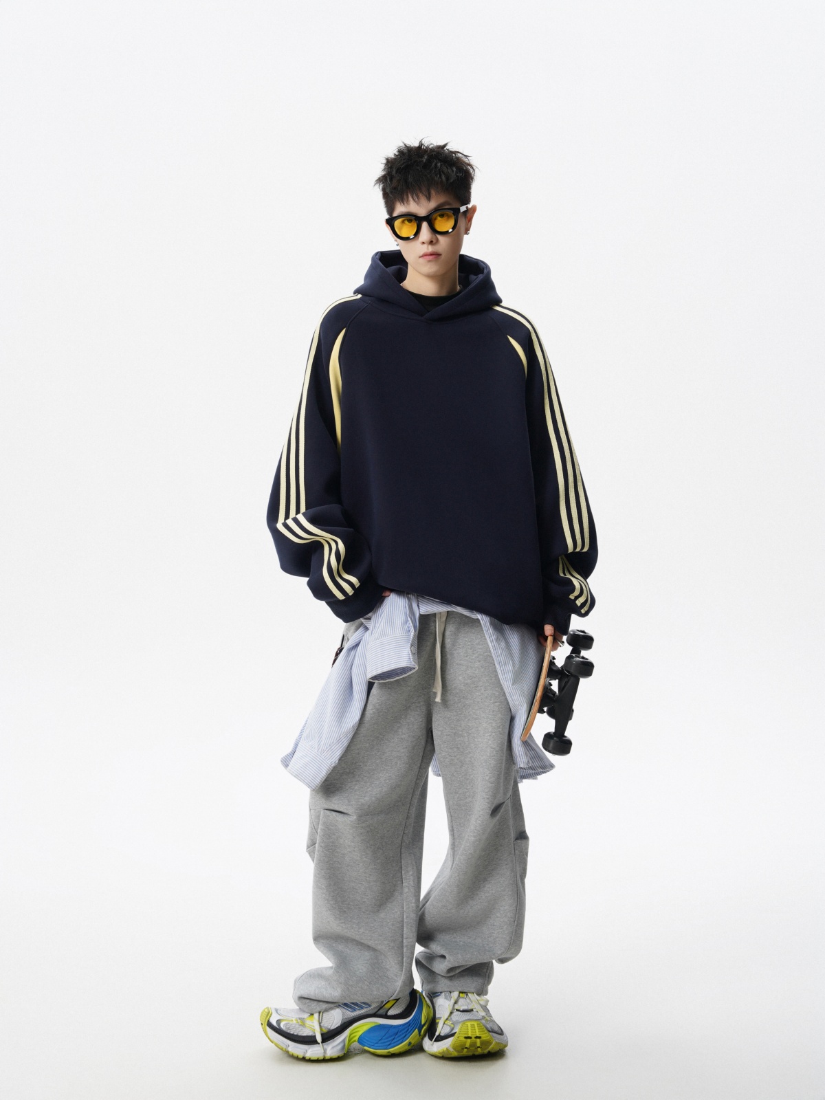 美式潮牌拼色連帽衛衣男款秋季復古寬松休閒上衣高街條紋運動帽衫
