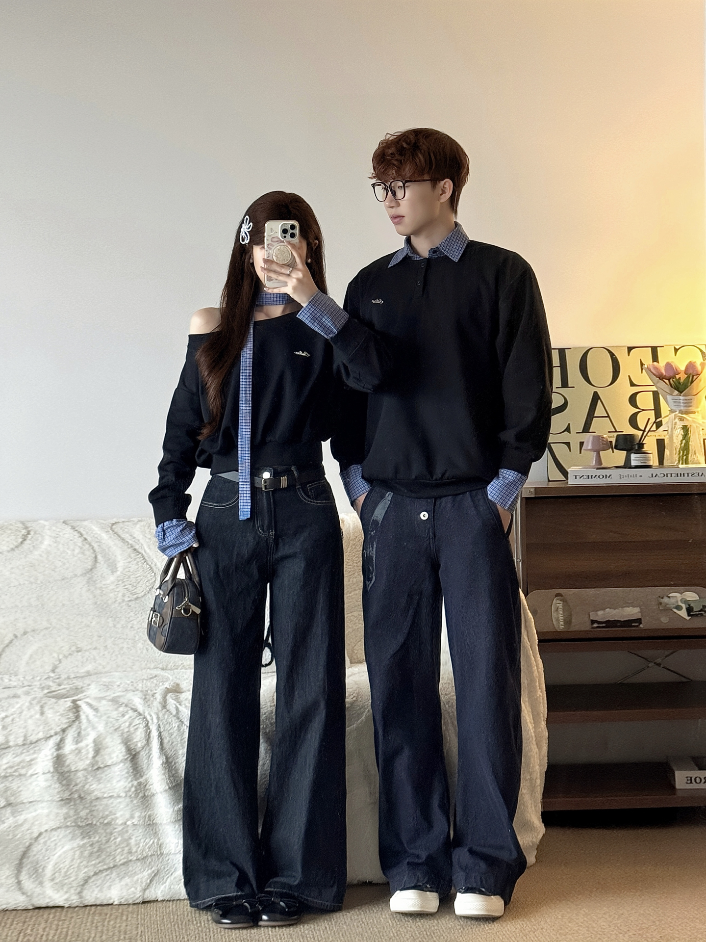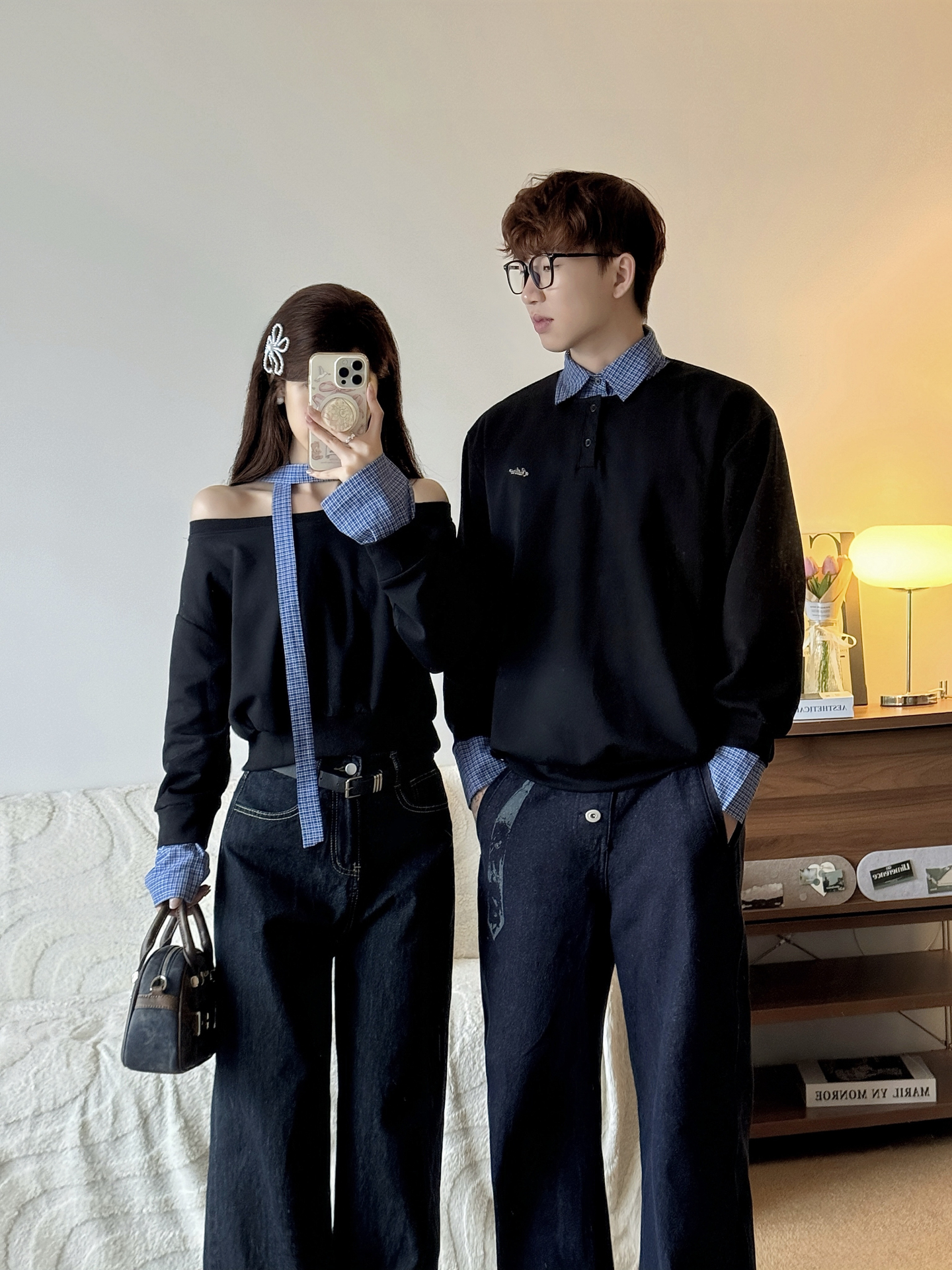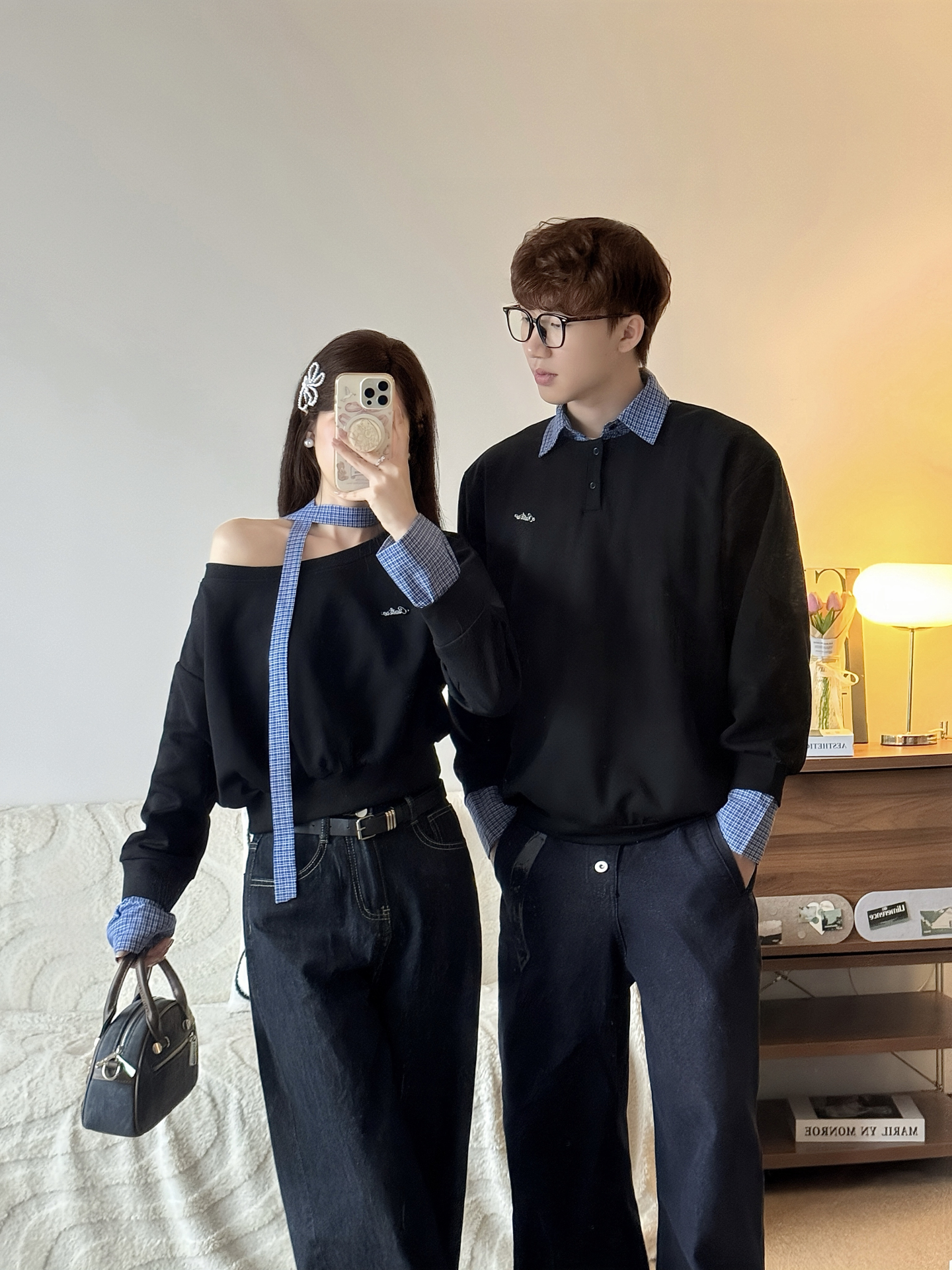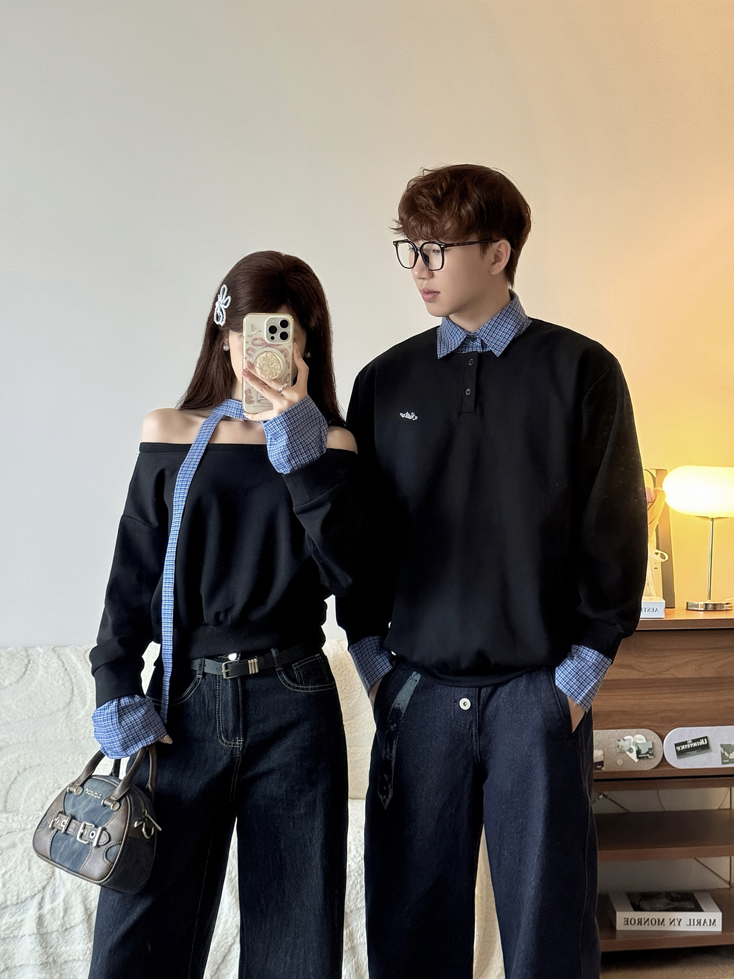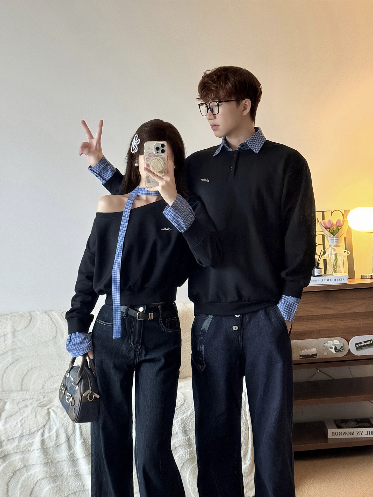 假兩件拼接衛衣秋季2025新款韓版長袖小衆露肩情侶裝一長一短上衣