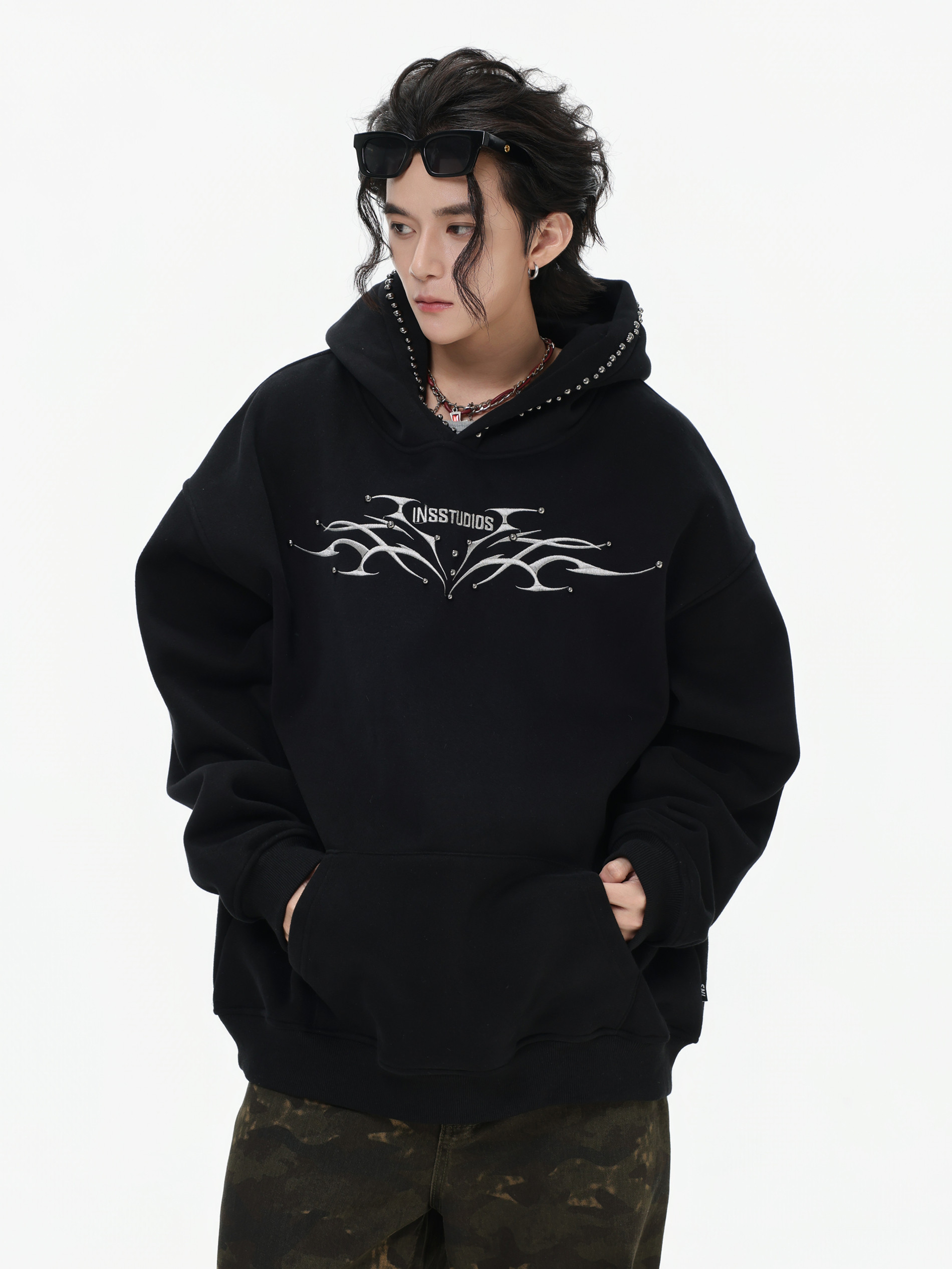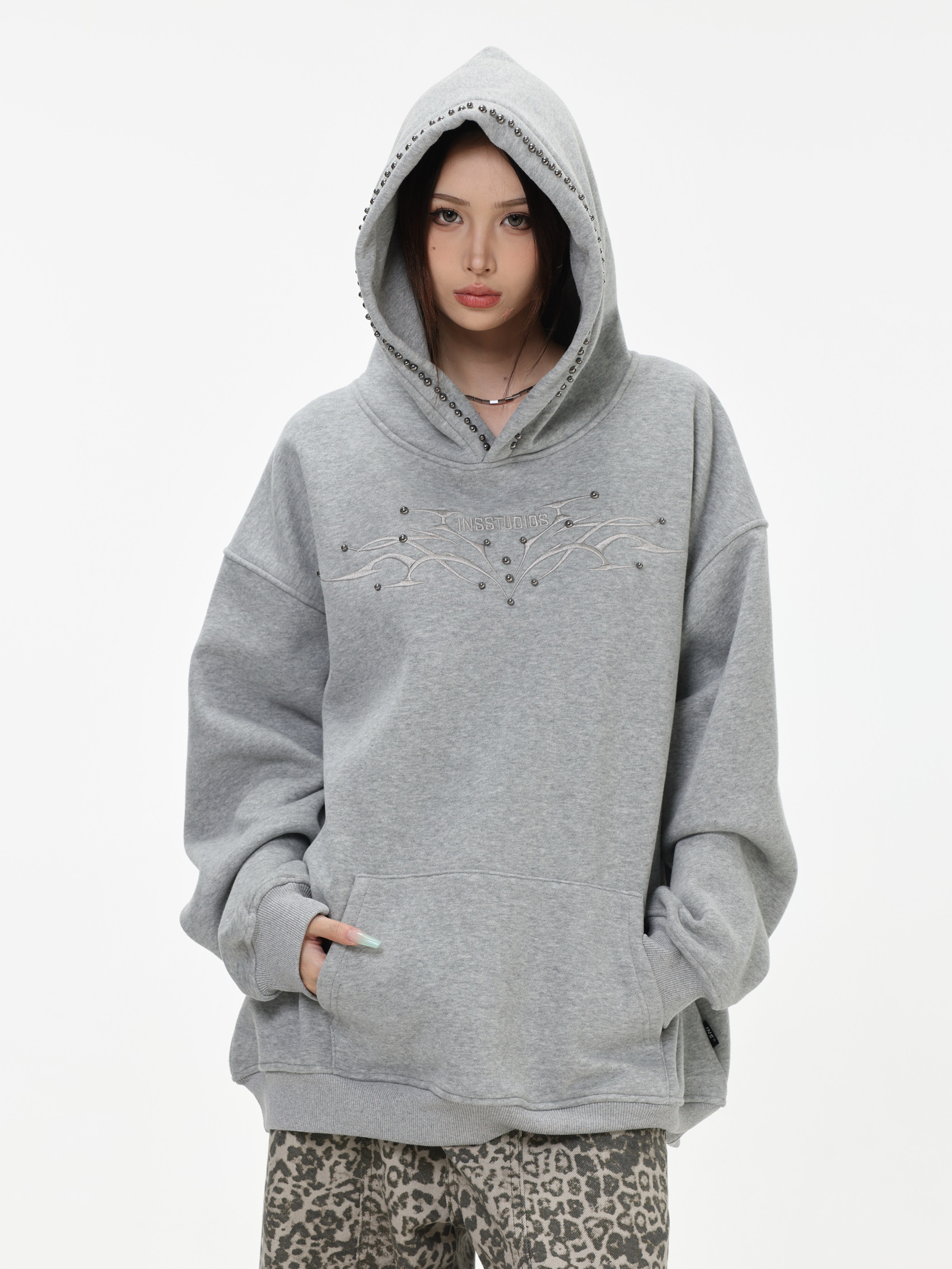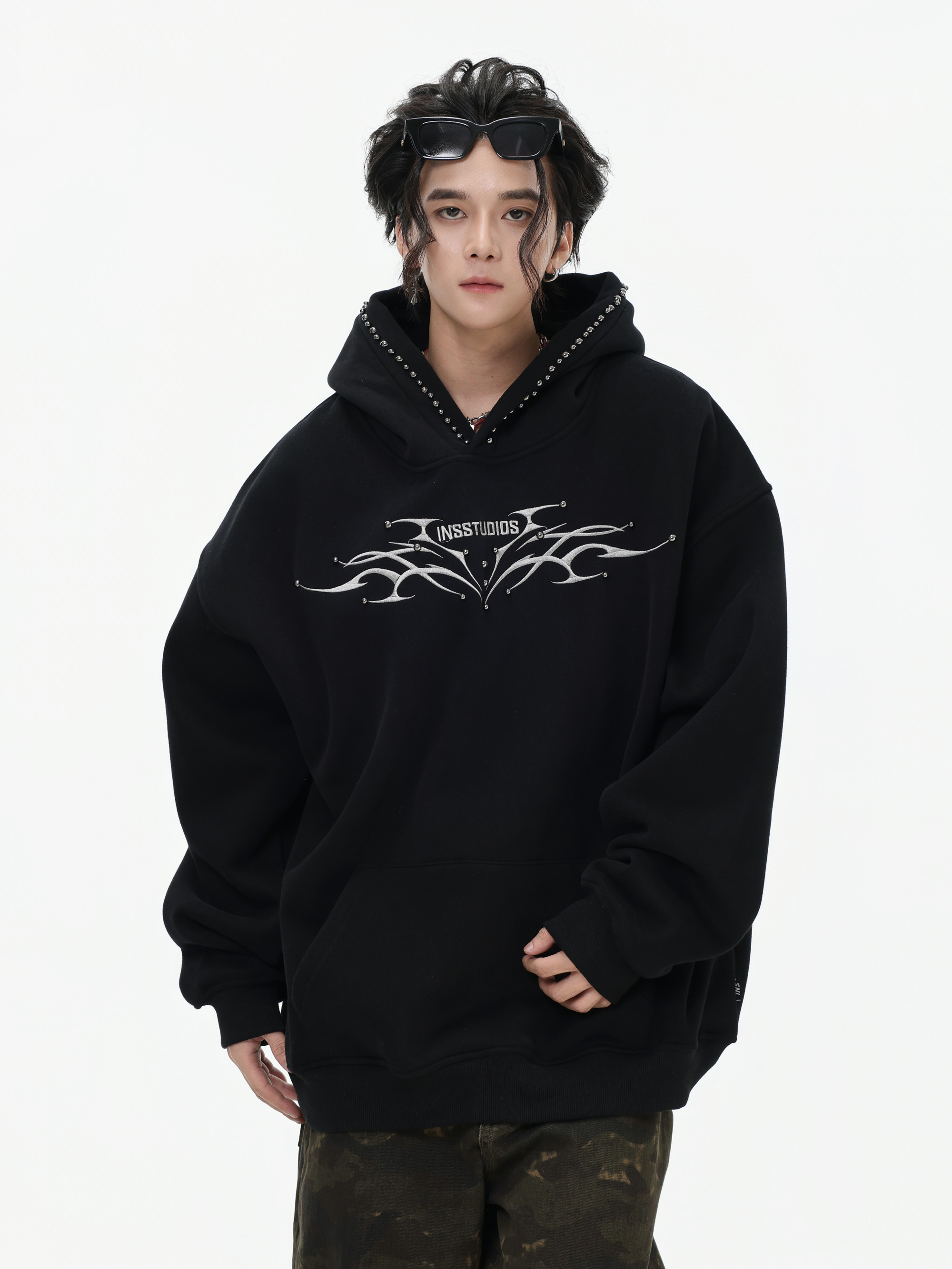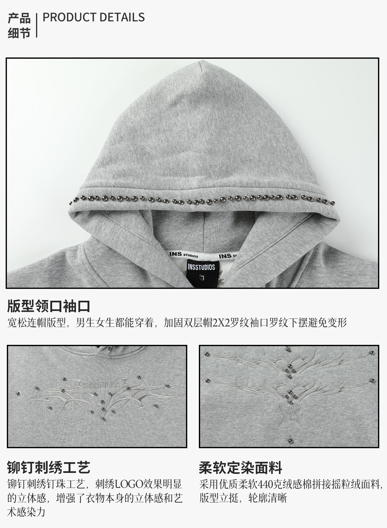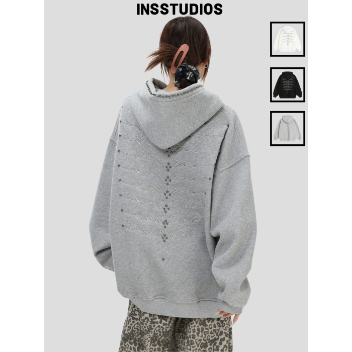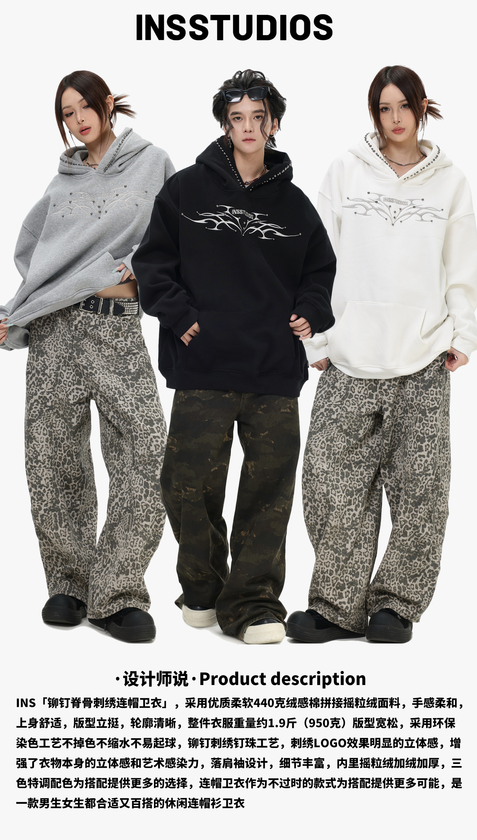 INSstudios 國潮情侶美式「鉚釘脊骨刺綉連帽衛衣」寬鬆加絨帽衫