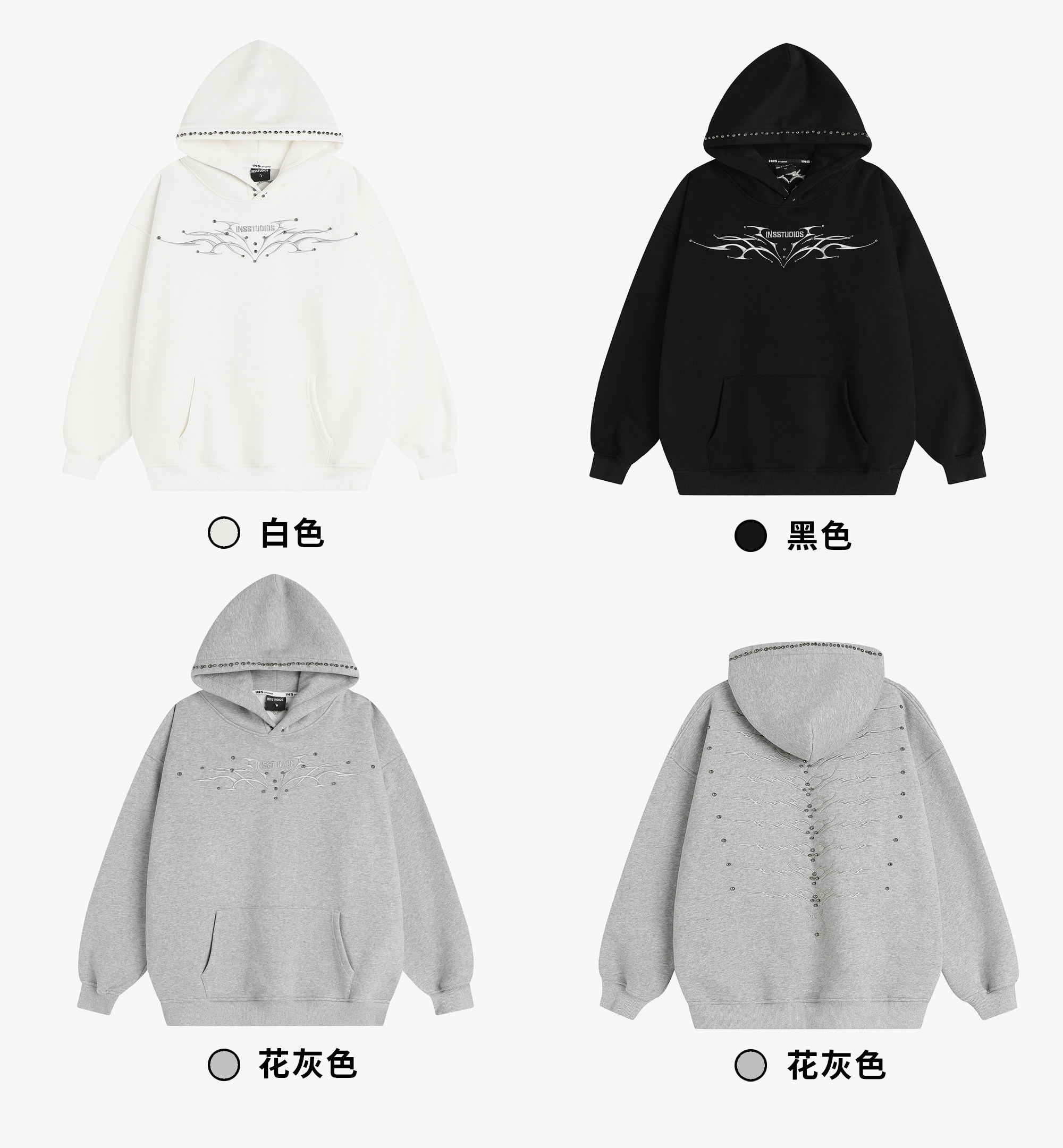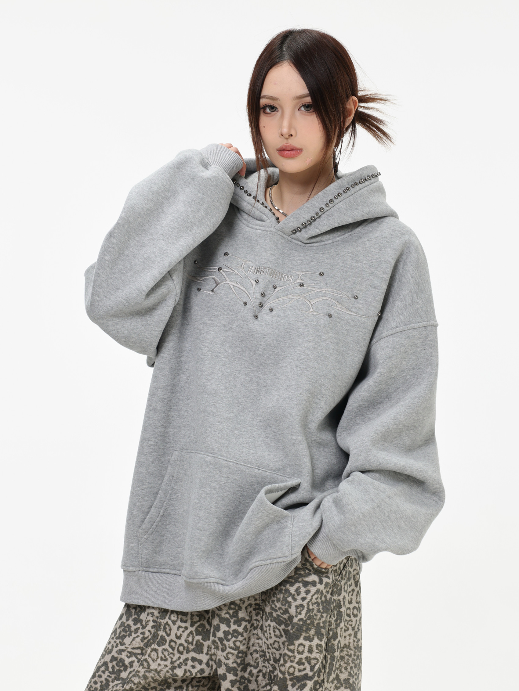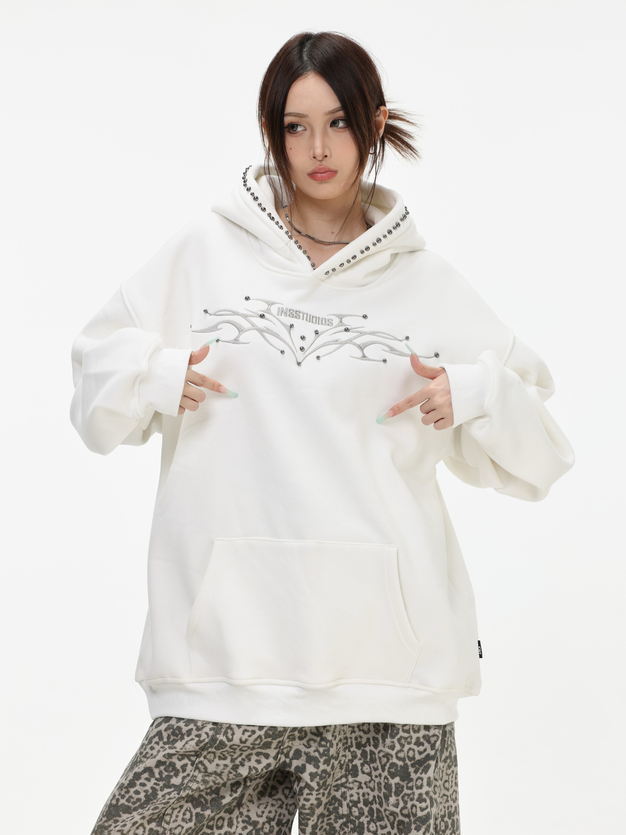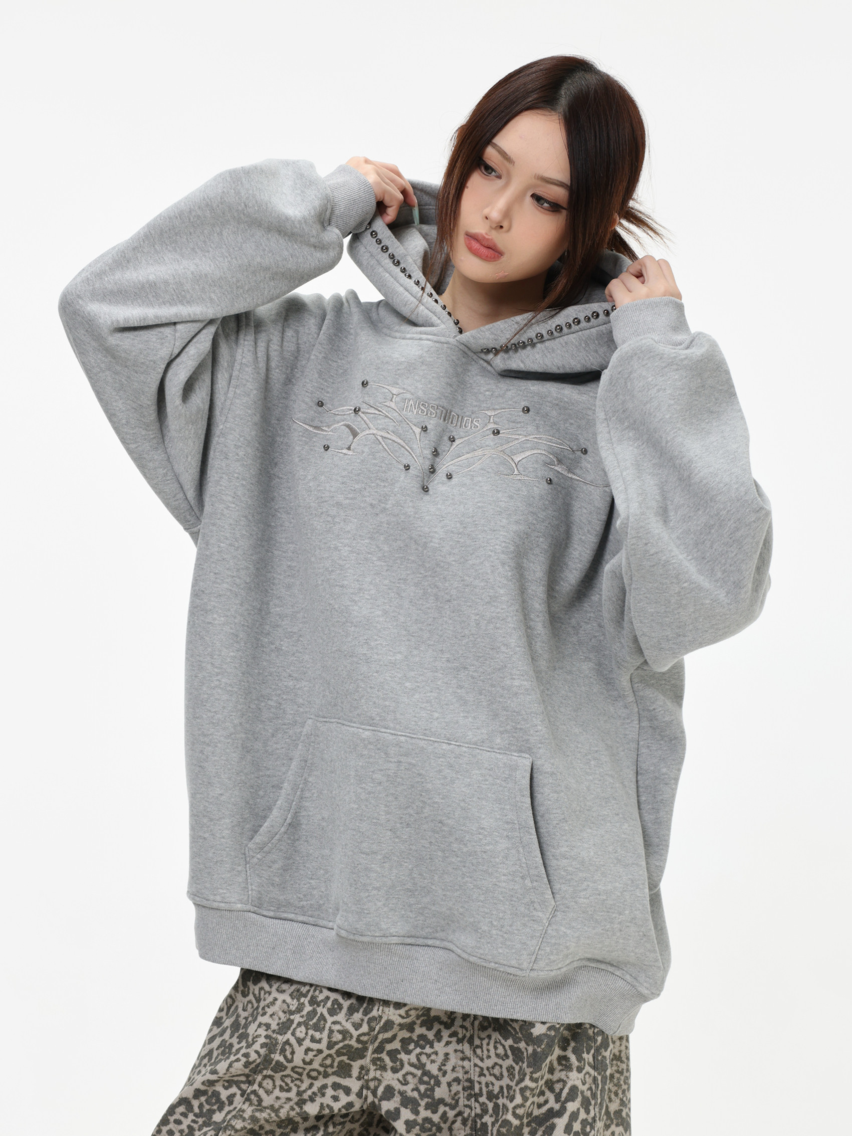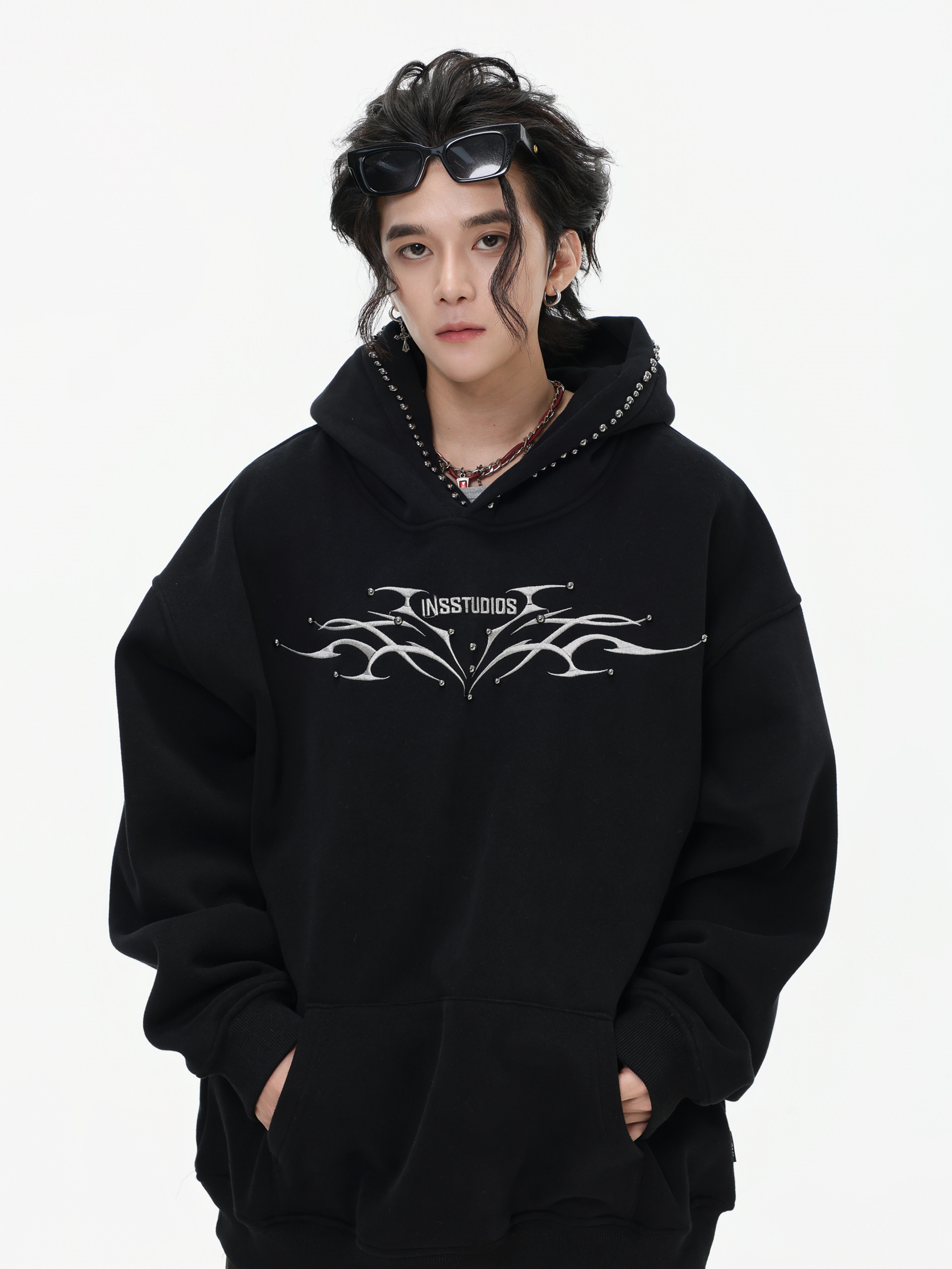 INSstudios 國潮情侶美式「鉚釘脊骨刺綉連帽衛衣」寬鬆加絨帽衫
