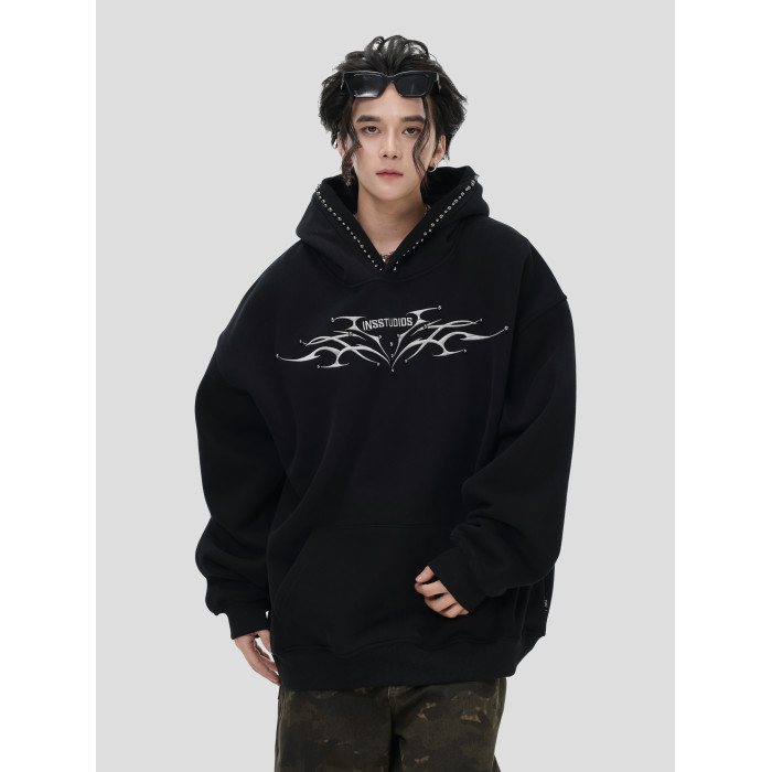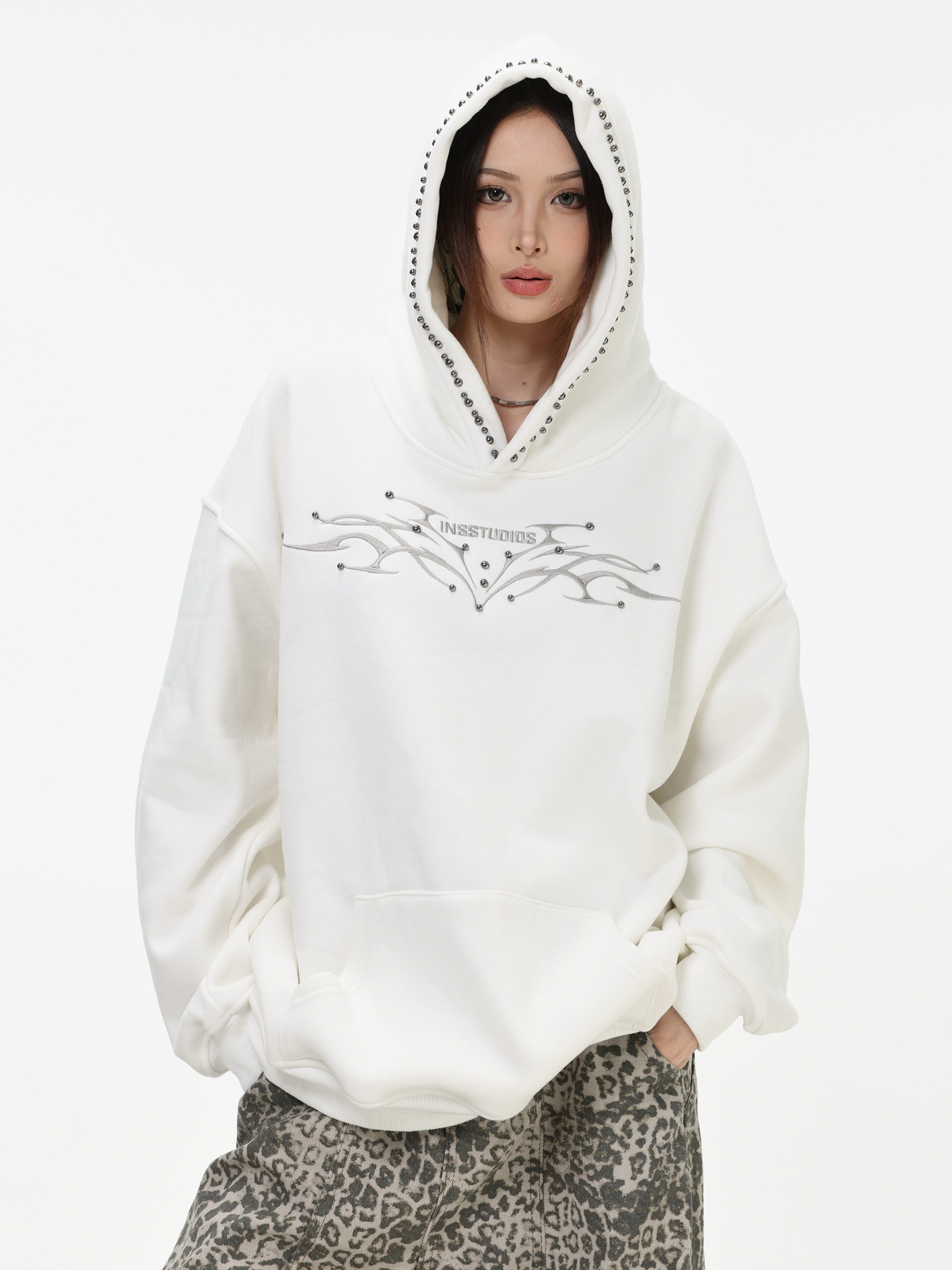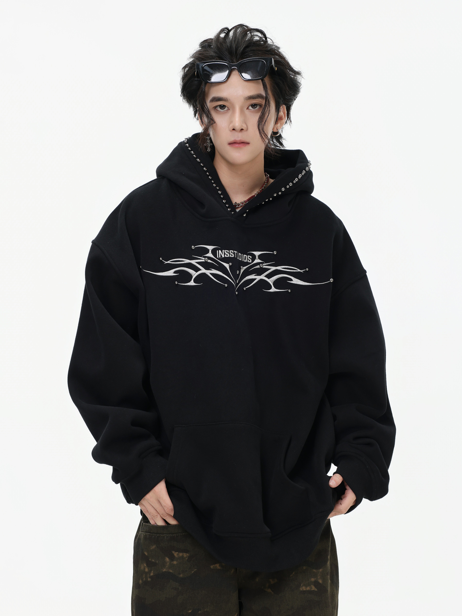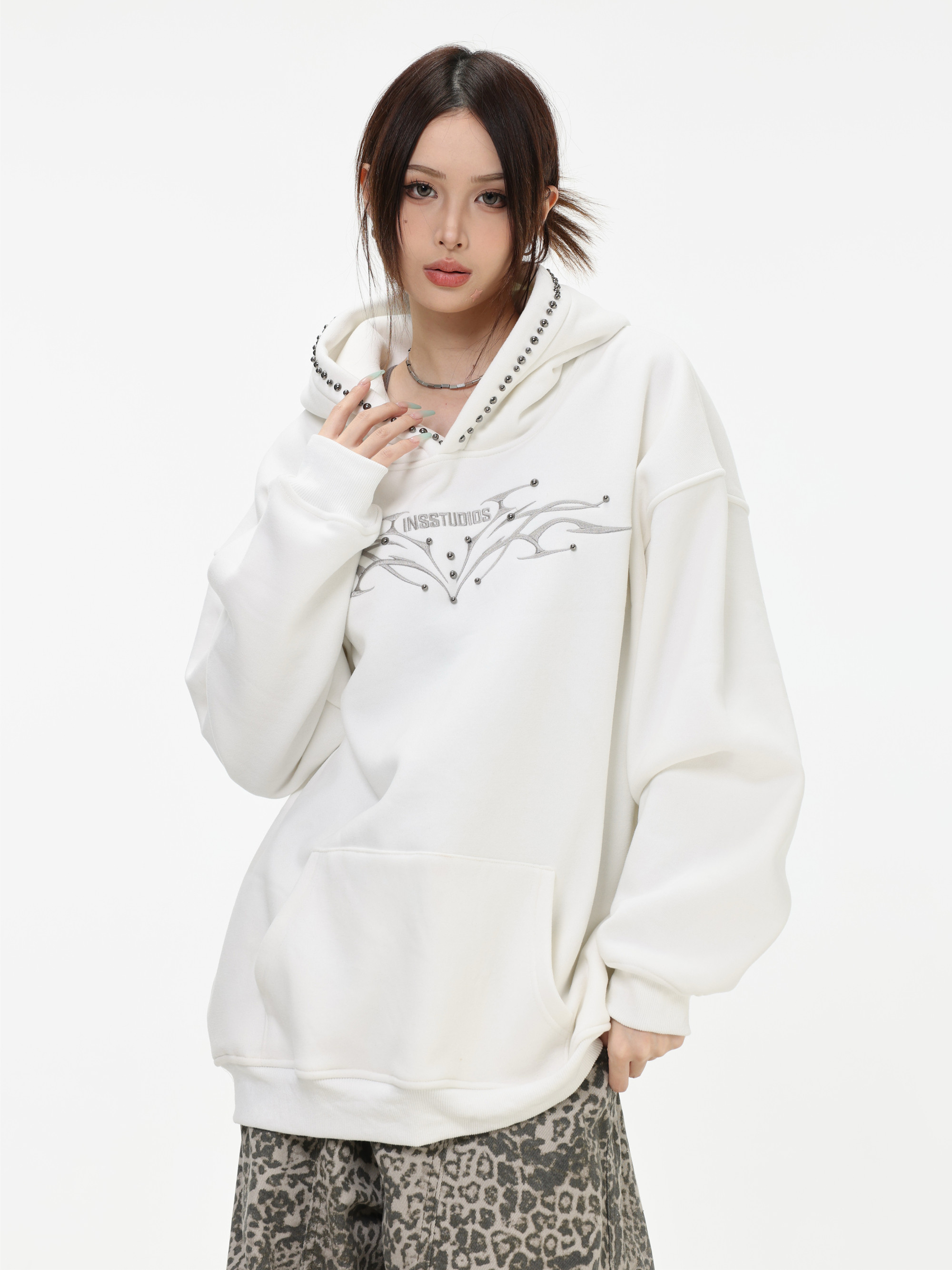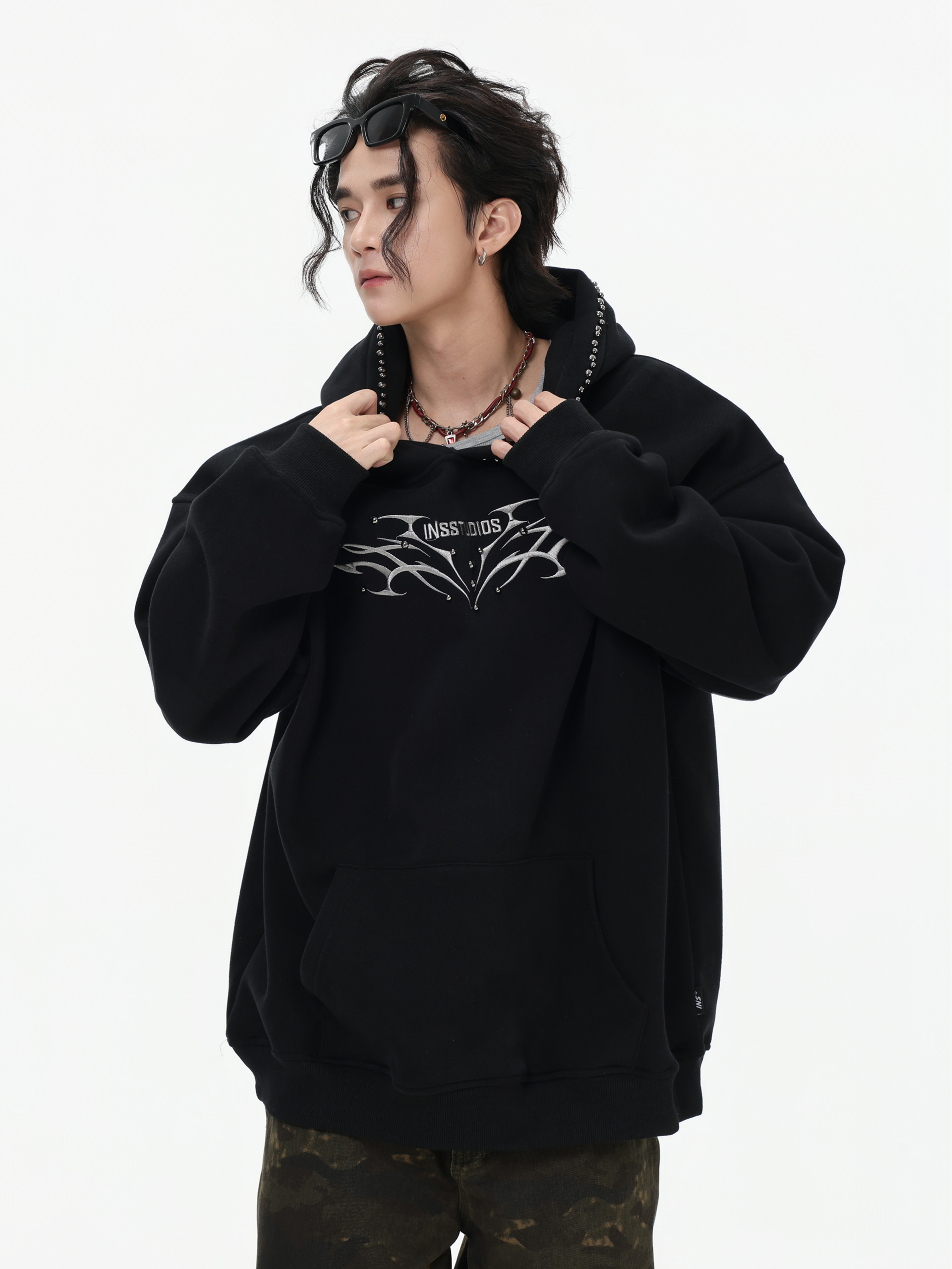 INSstudios 國潮情侶美式「鉚釘脊骨刺綉連帽衛衣」寬鬆加絨帽衫