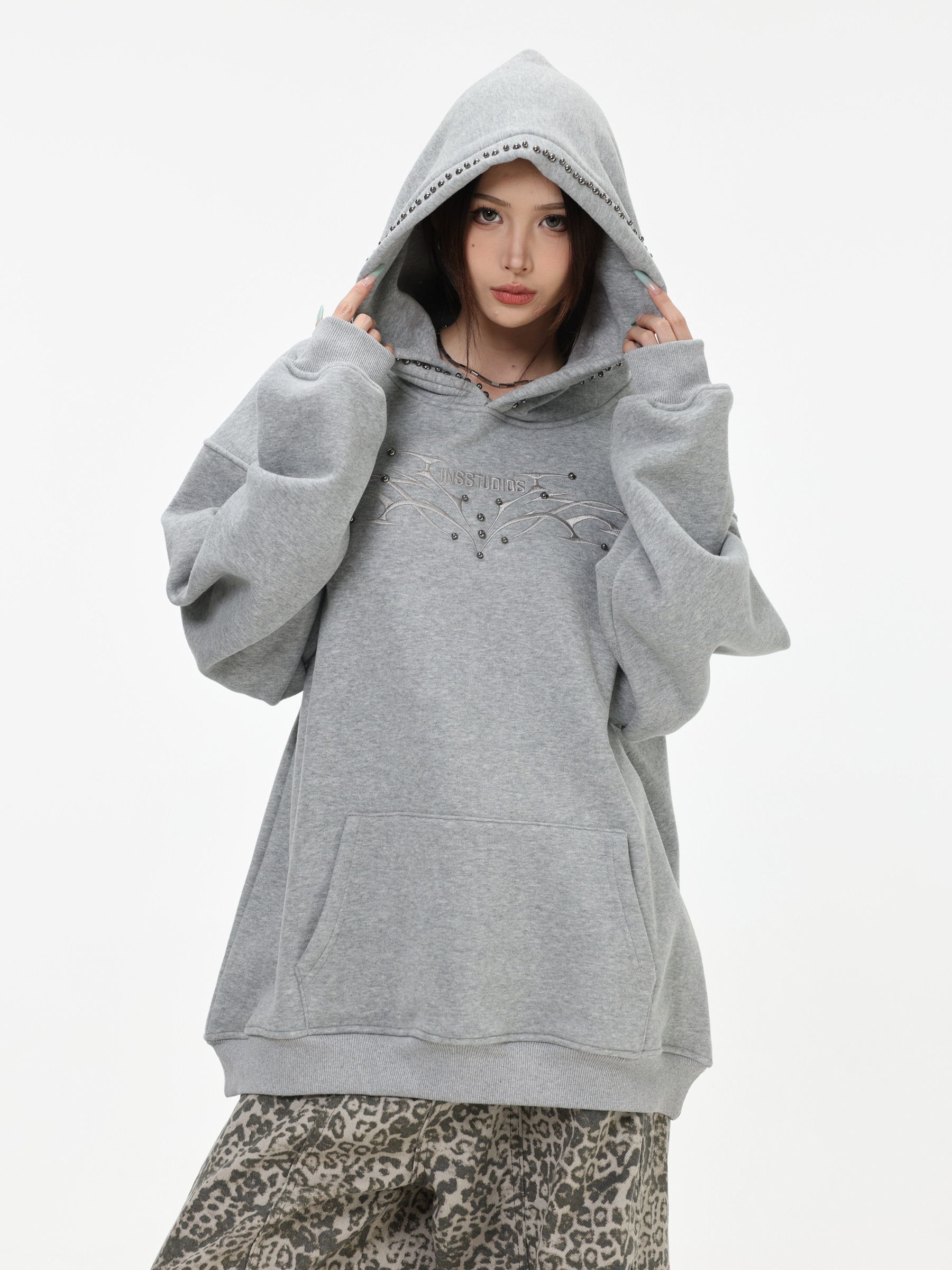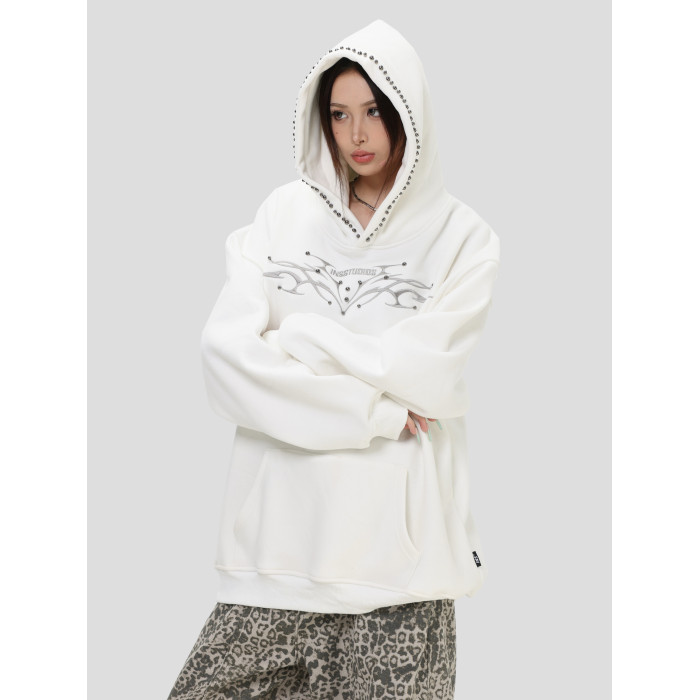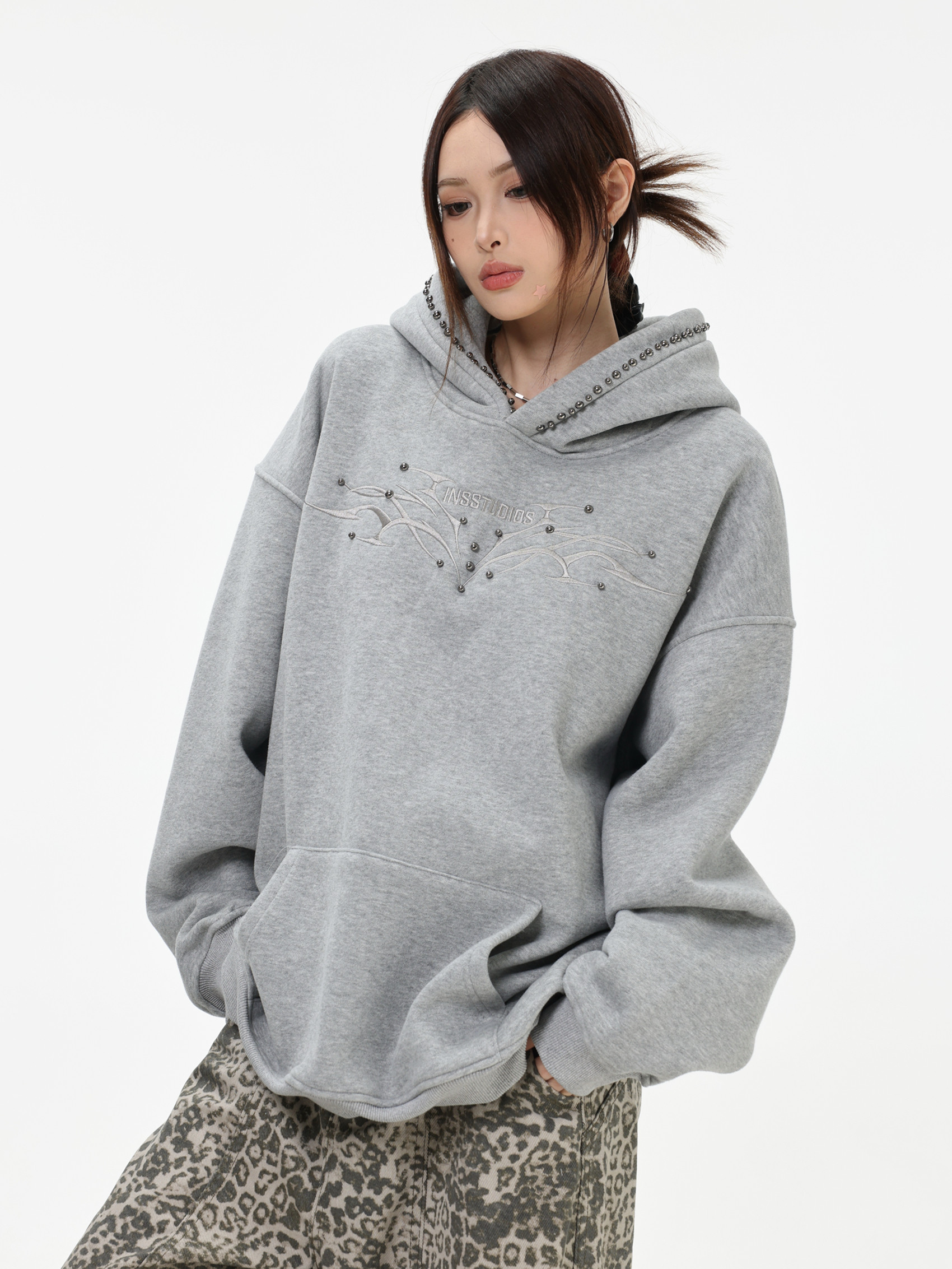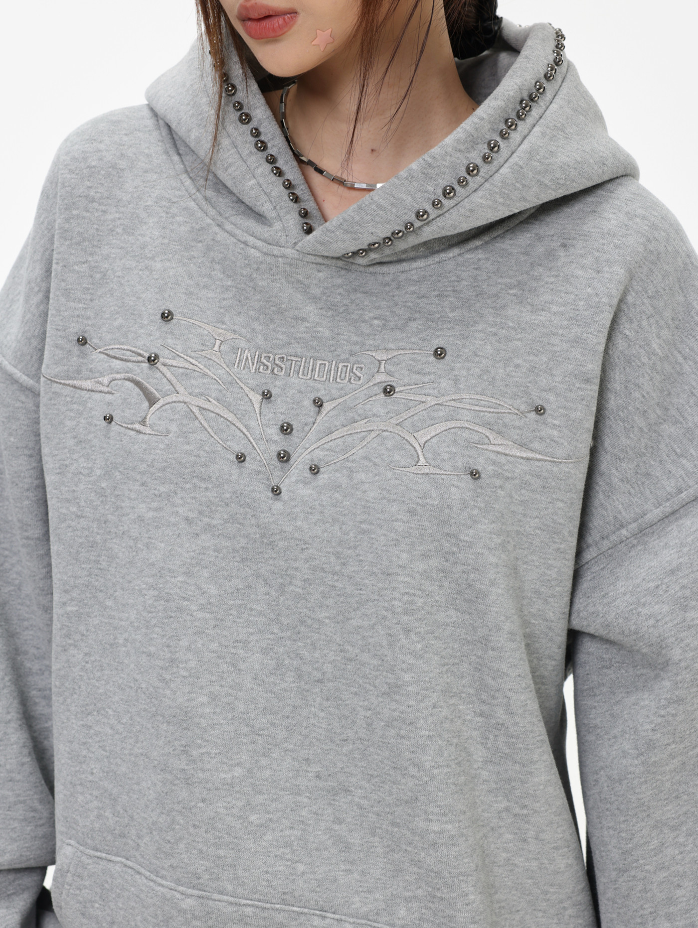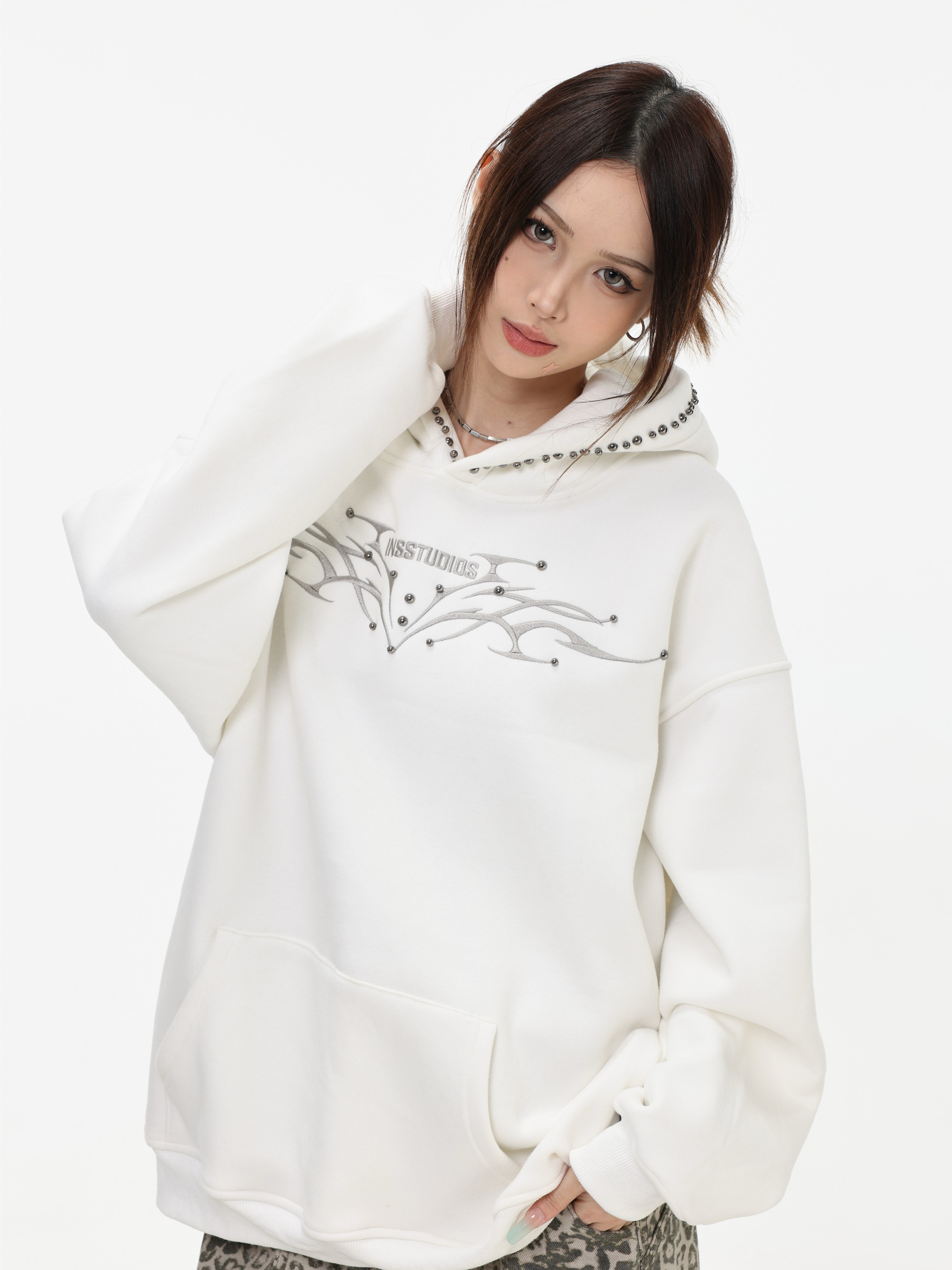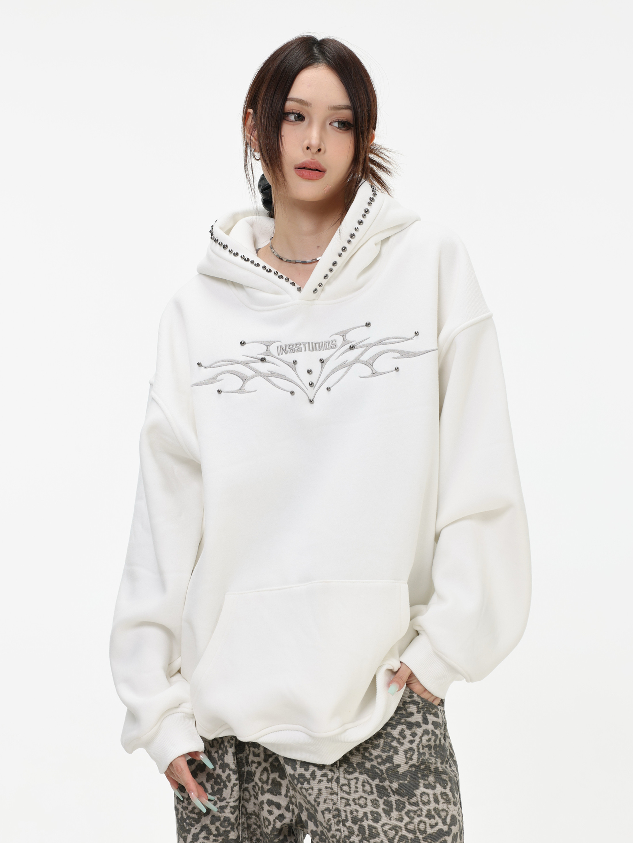 INSstudios 國潮情侶美式「鉚釘脊骨刺綉連帽衛衣」寬鬆加絨帽衫
