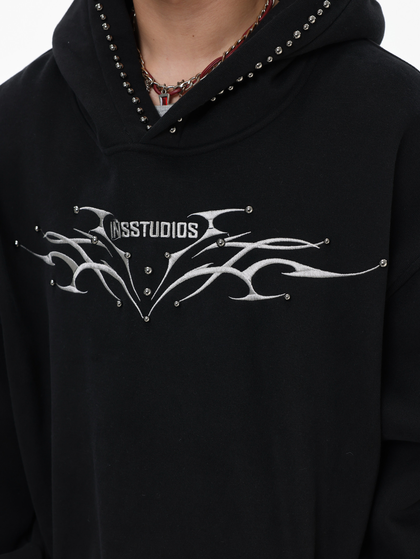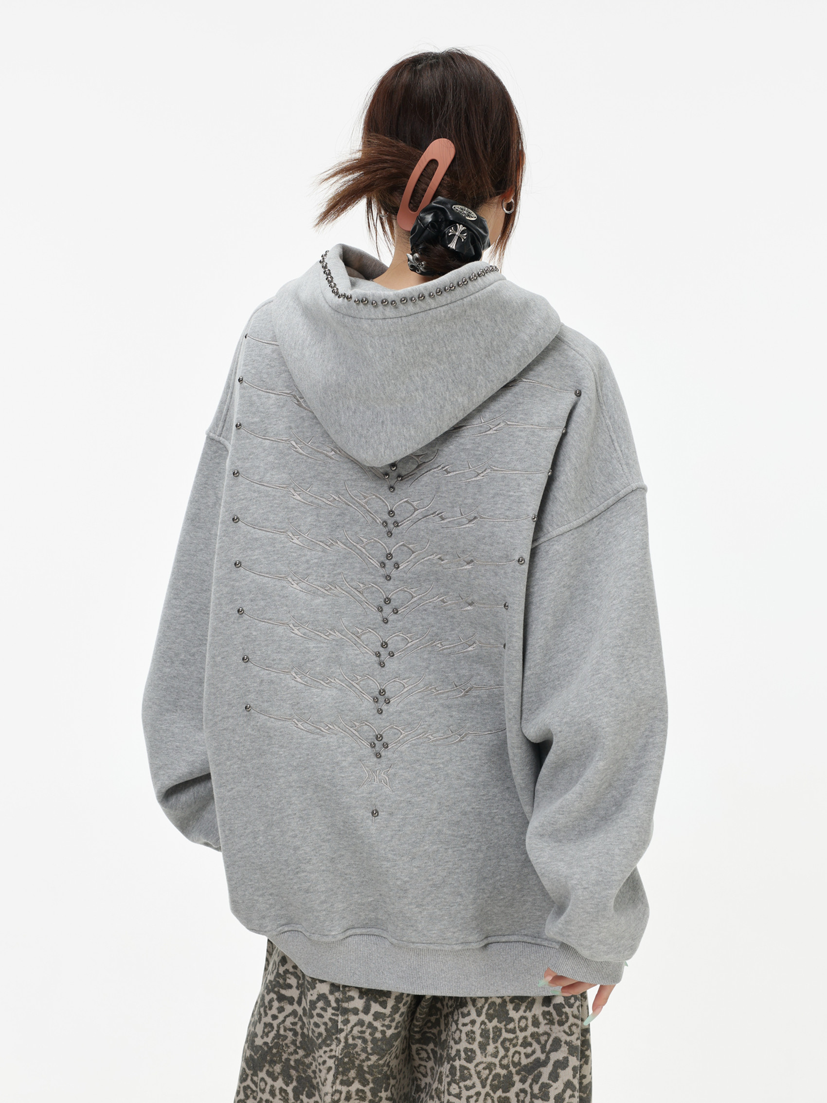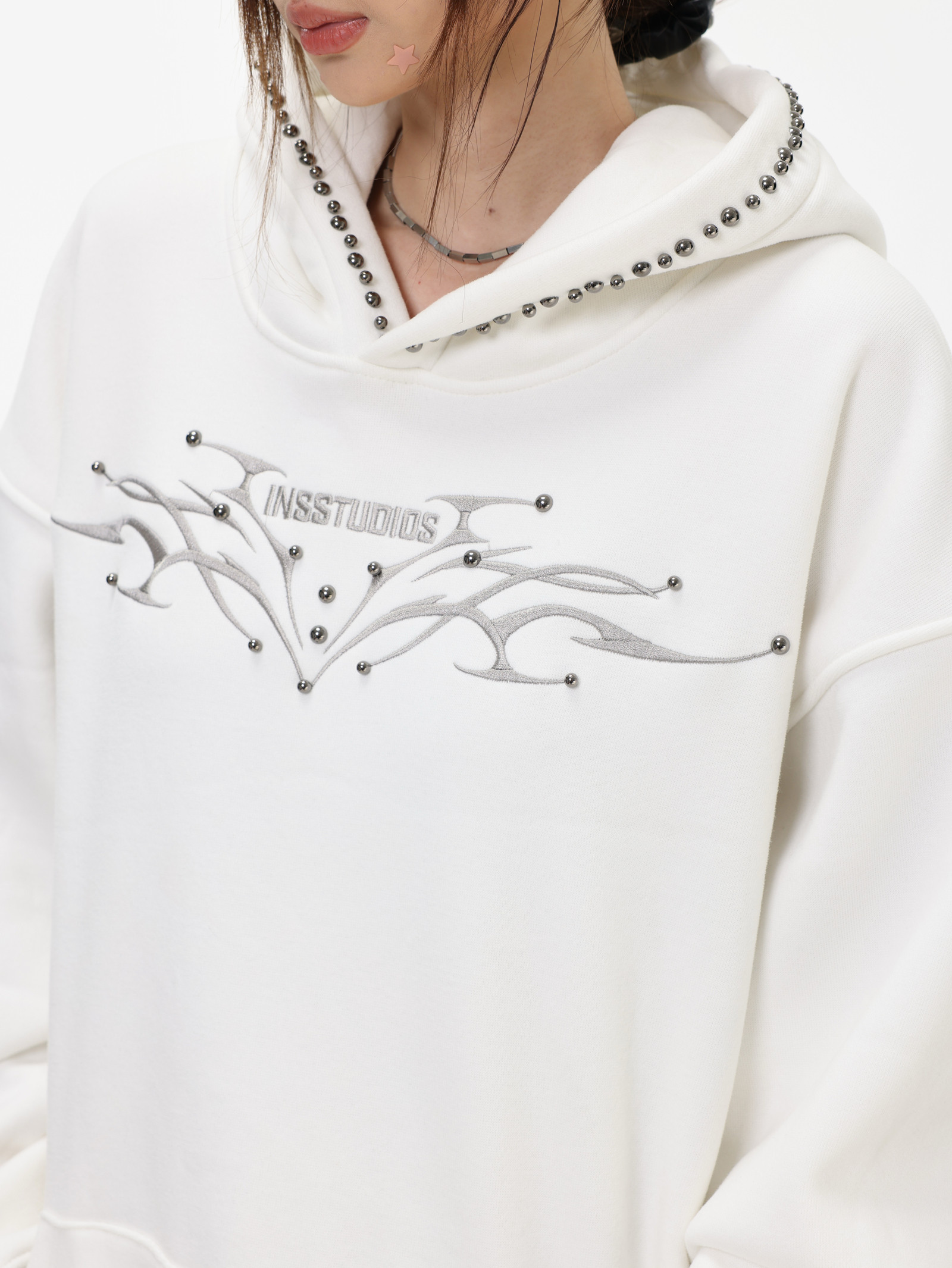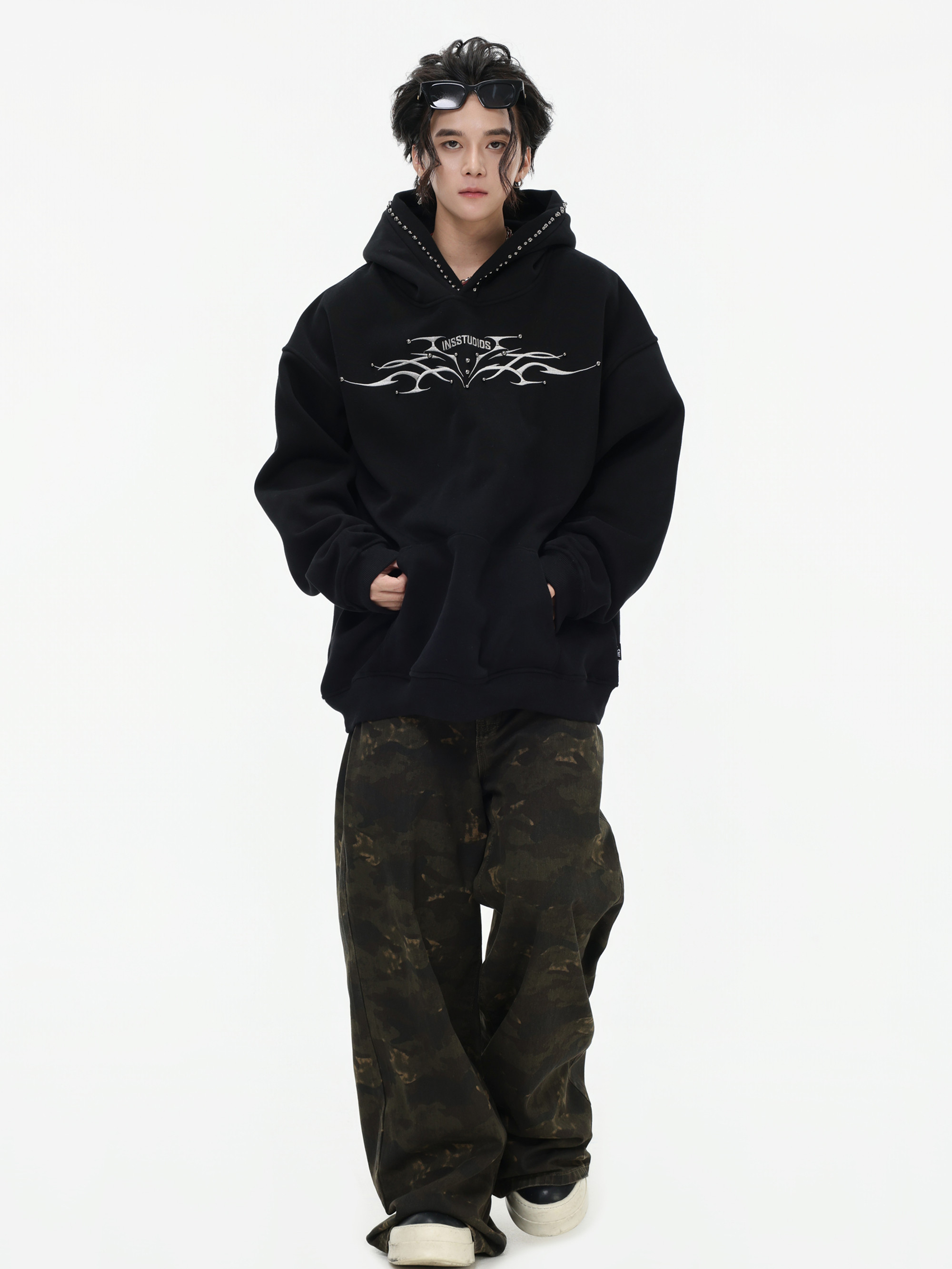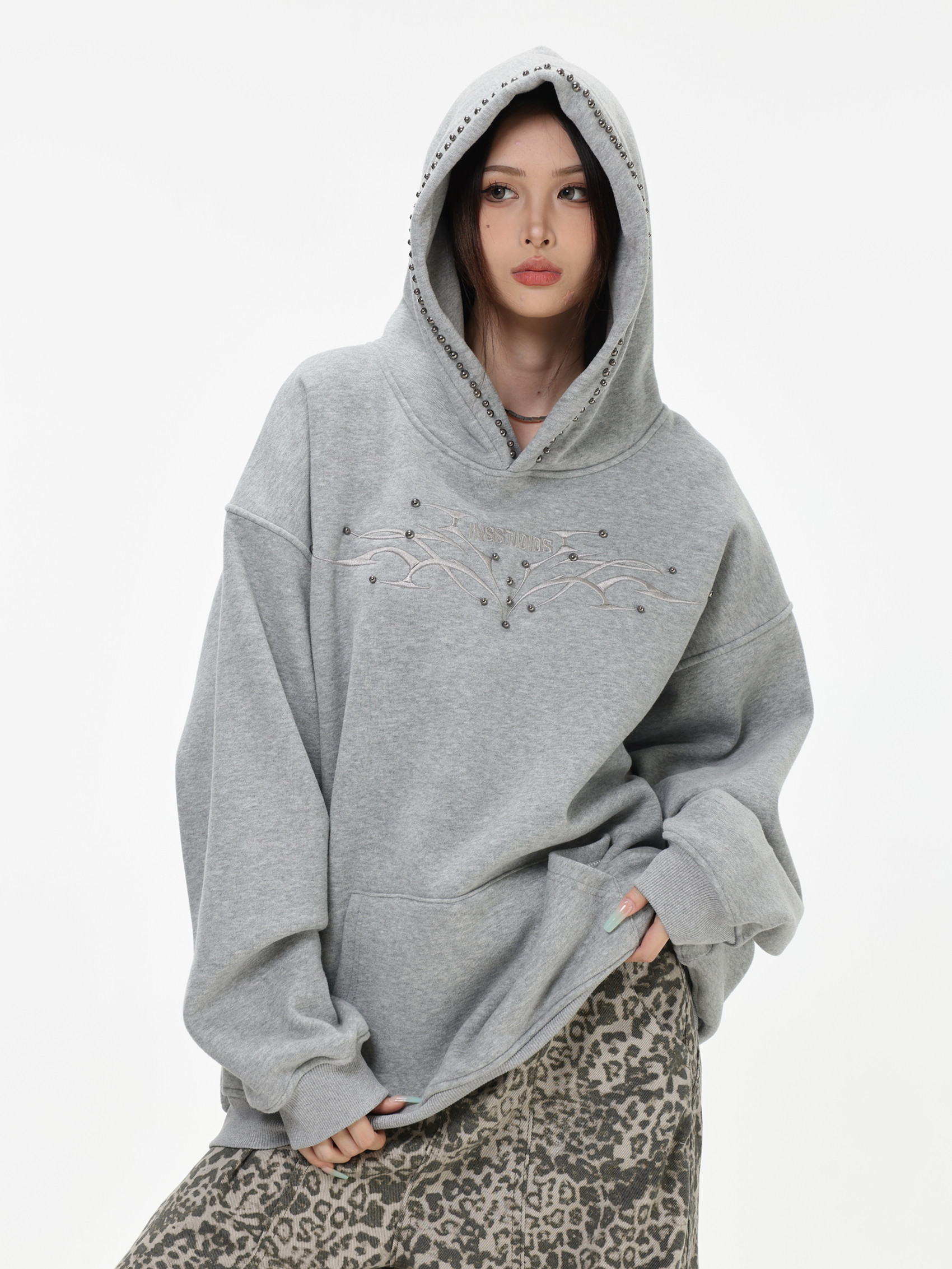 INSstudios 國潮情侶美式「鉚釘脊骨刺綉連帽衛衣」寬鬆加絨帽衫
