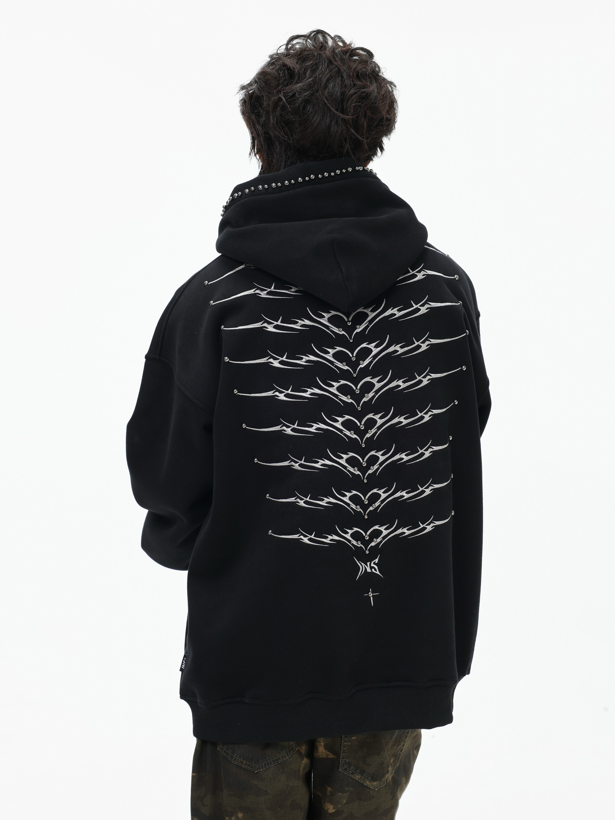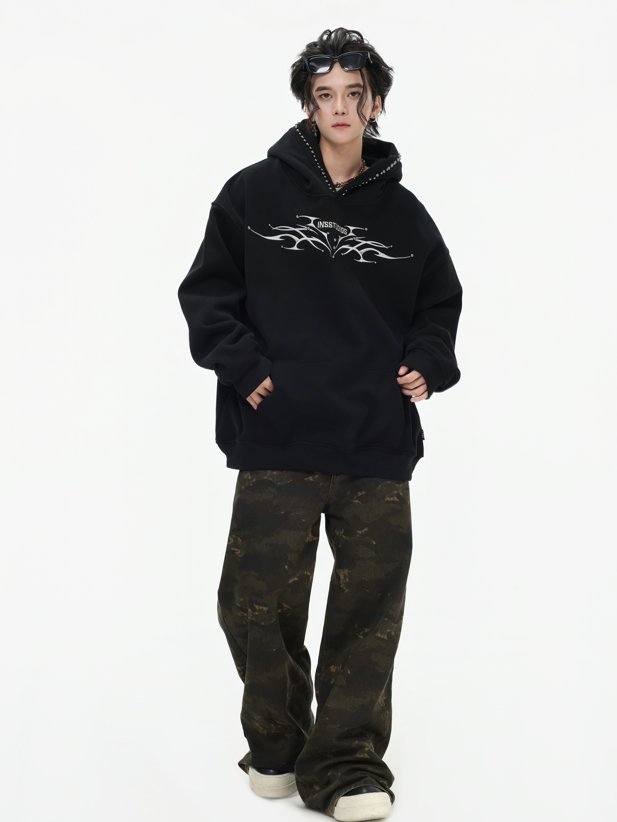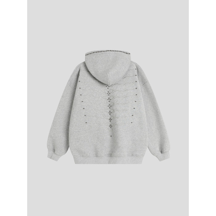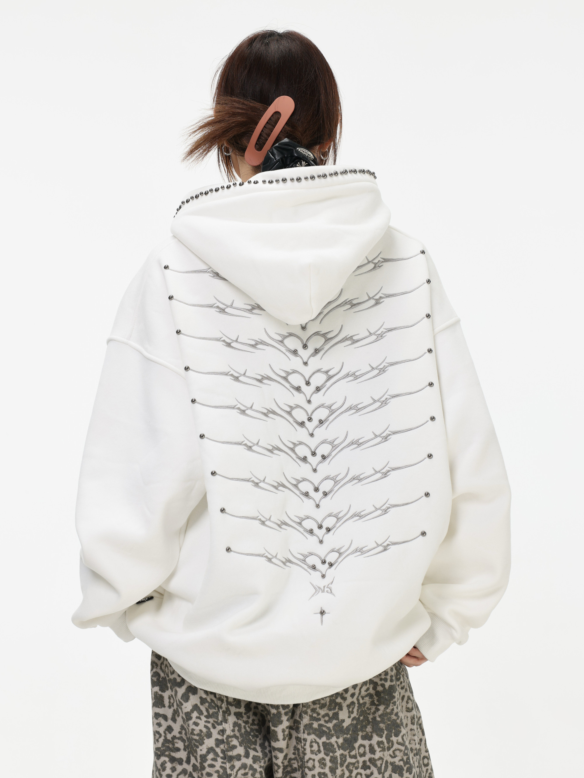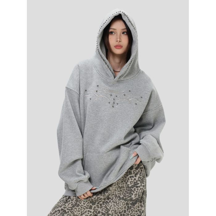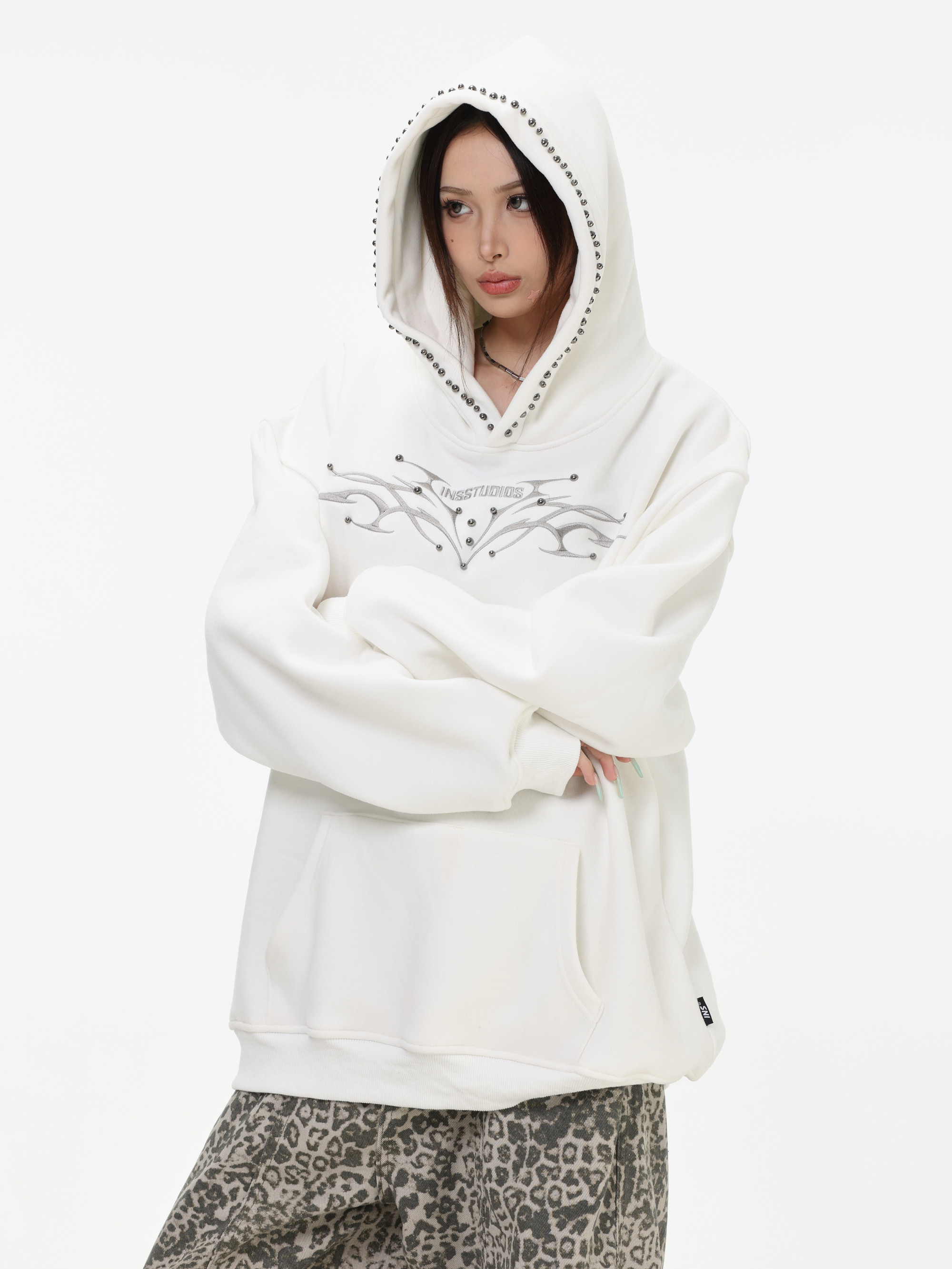 INSstudios 國潮情侶美式「鉚釘脊骨刺綉連帽衛衣」寬鬆加絨帽衫