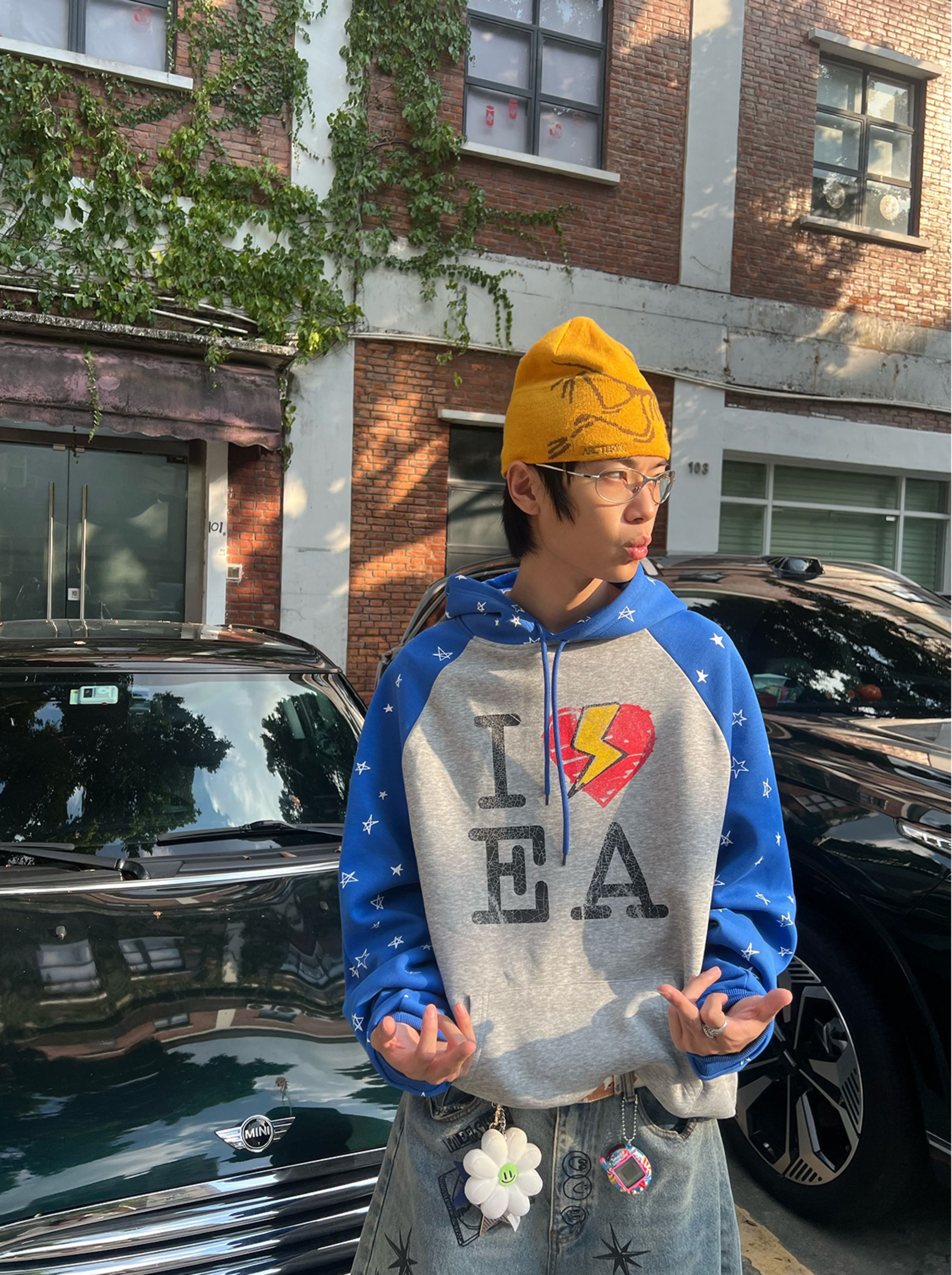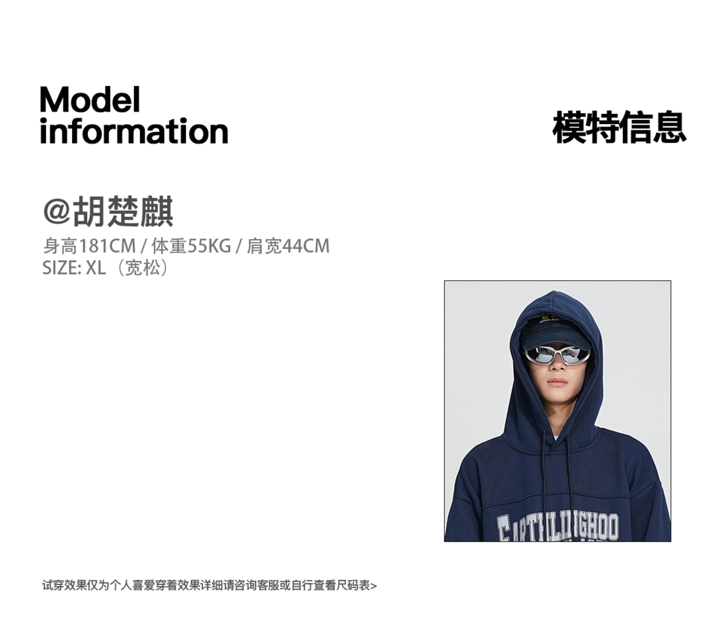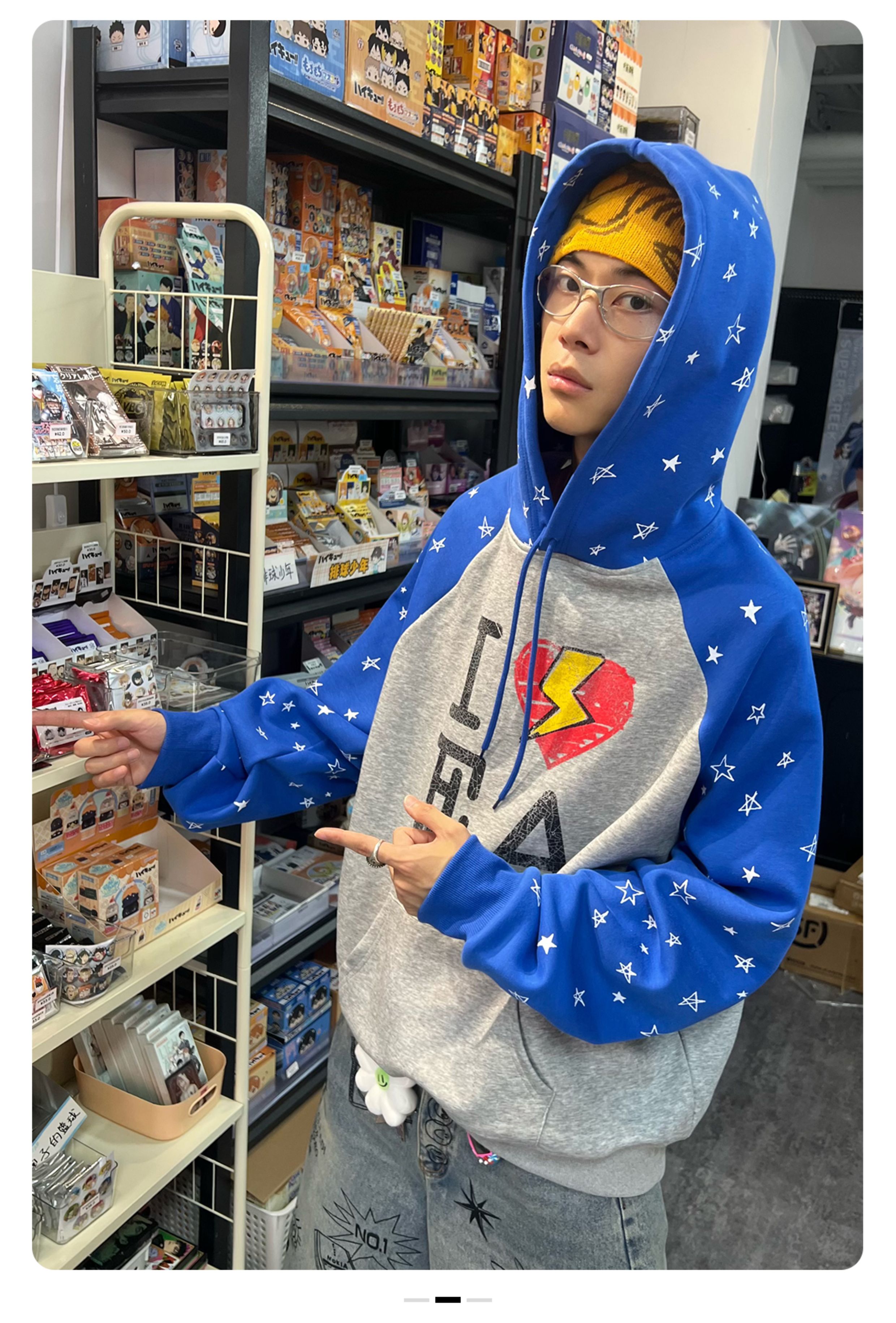 EAHO自製美式字母印花拼色連帽衛衣男女春秋寬松休閒百搭套頭帽衫