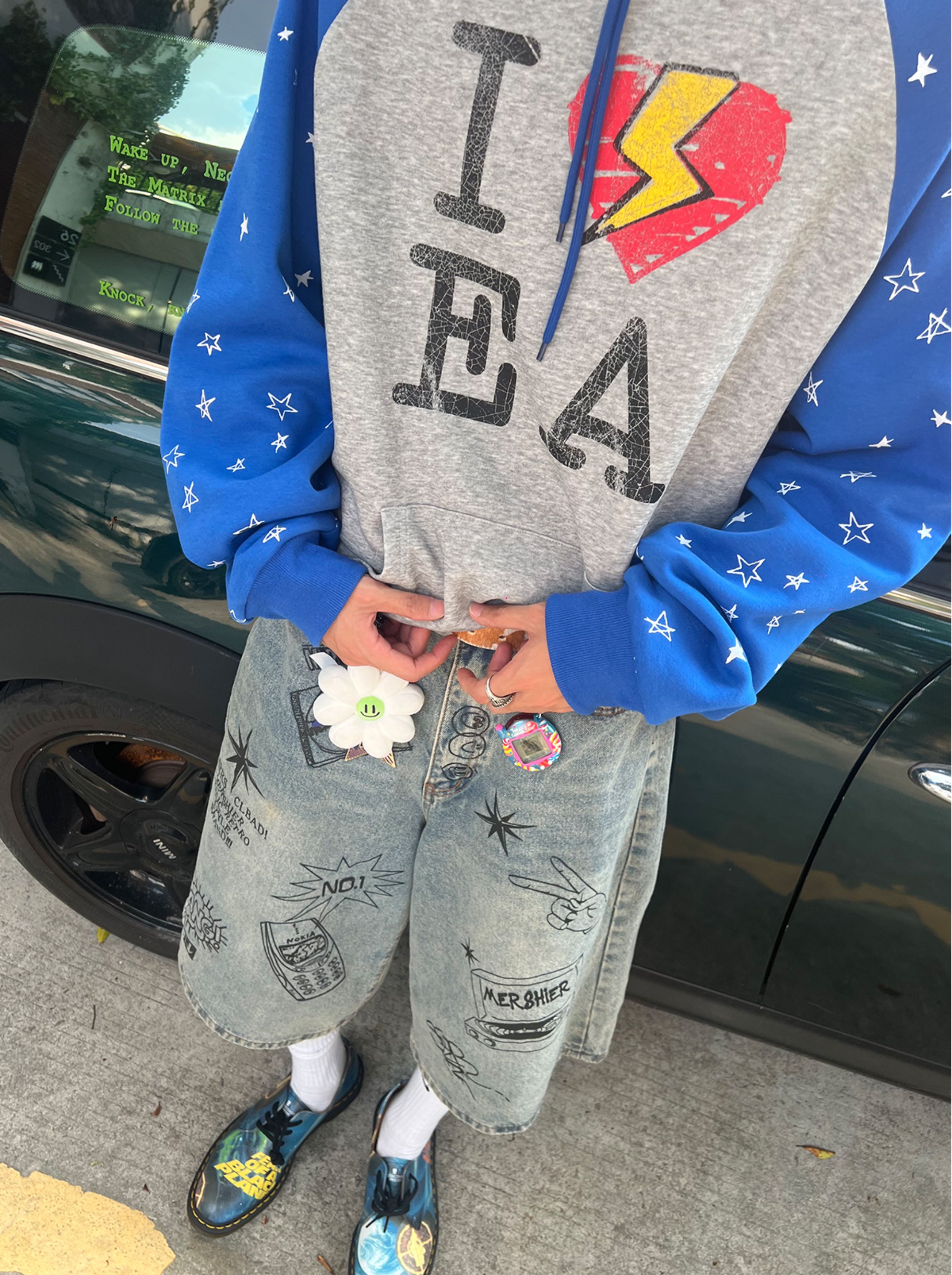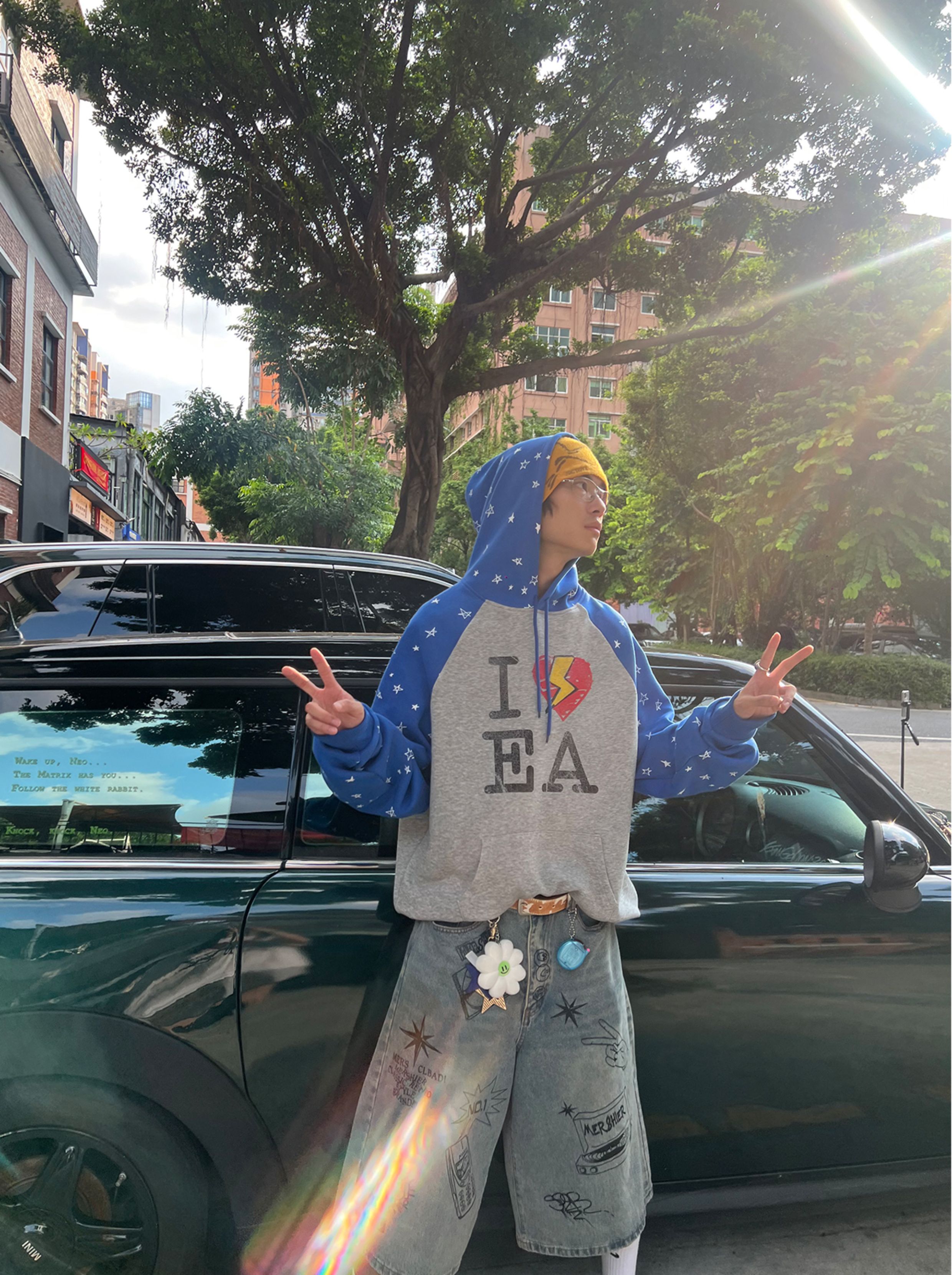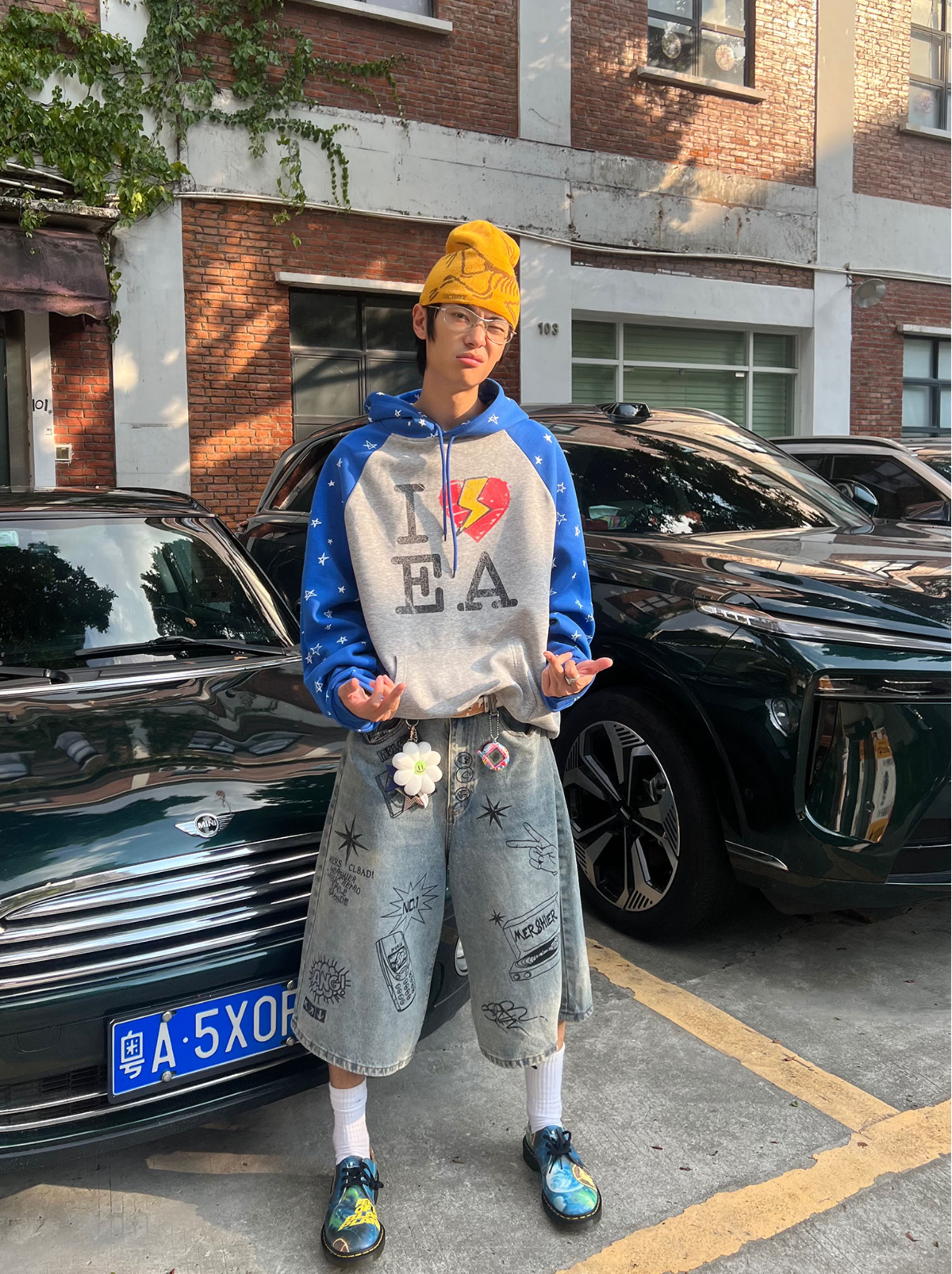 EAHO自製美式字母印花拼色連帽衛衣男女春秋寬松休閒百搭套頭帽衫