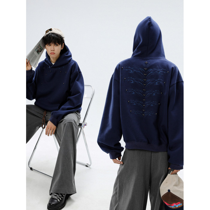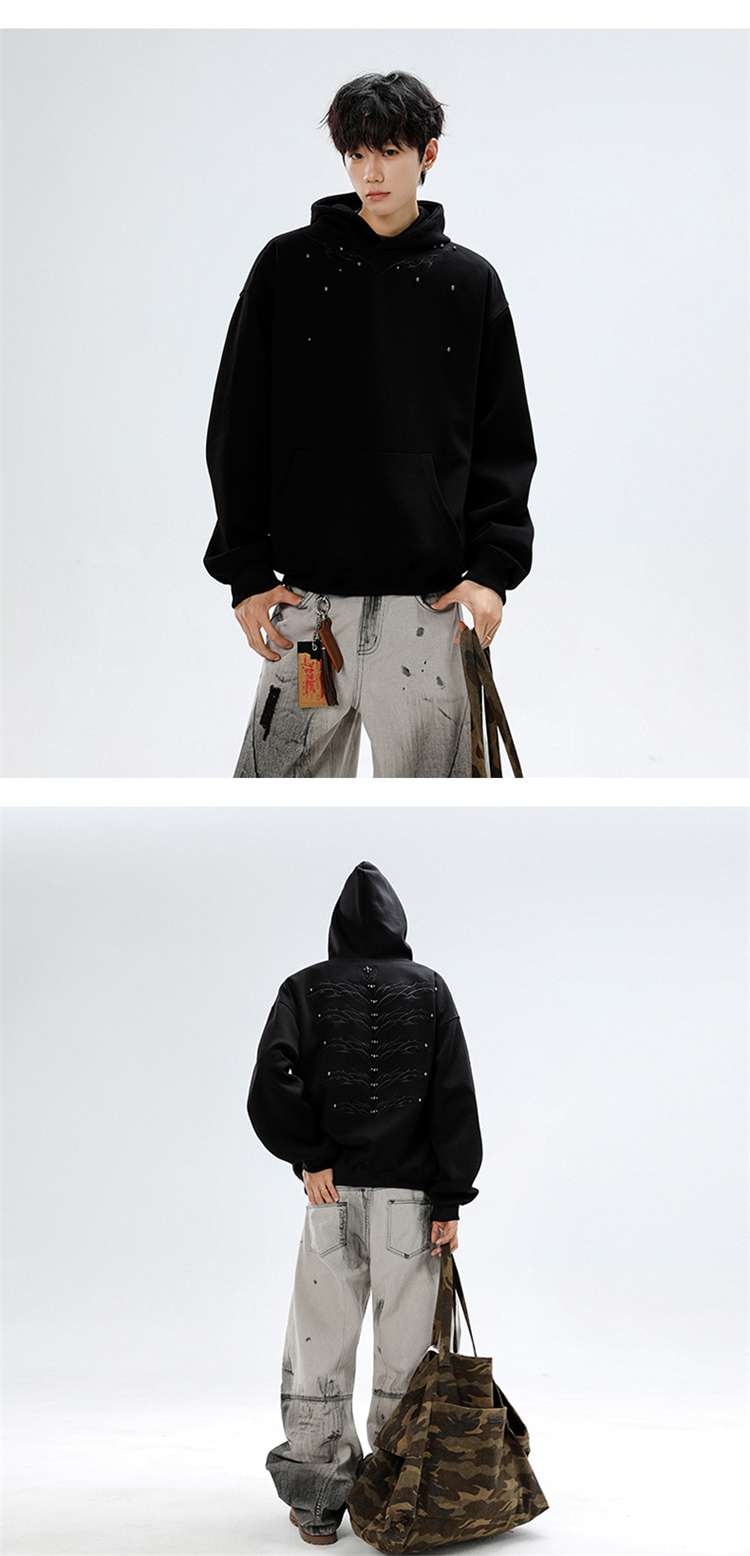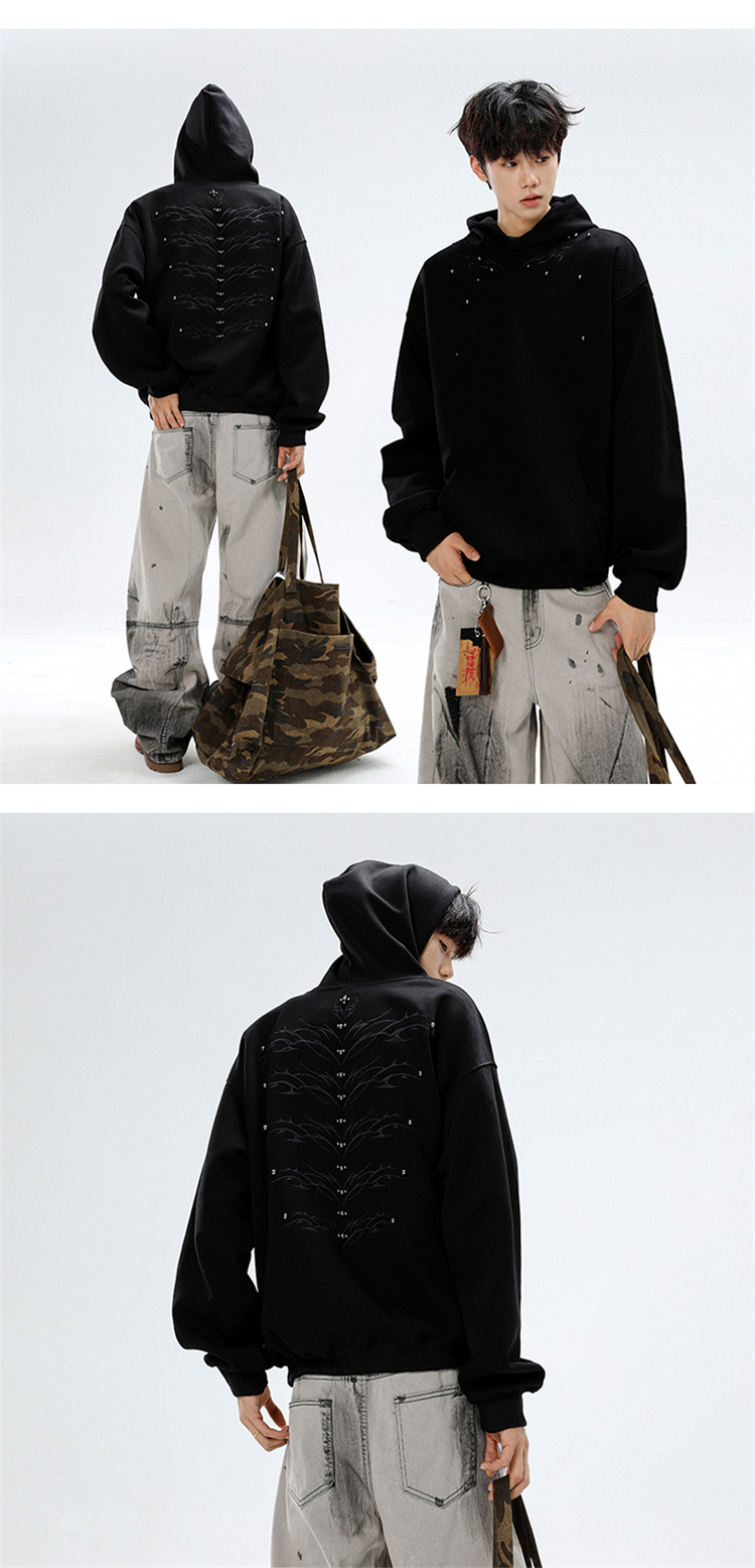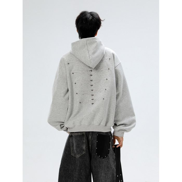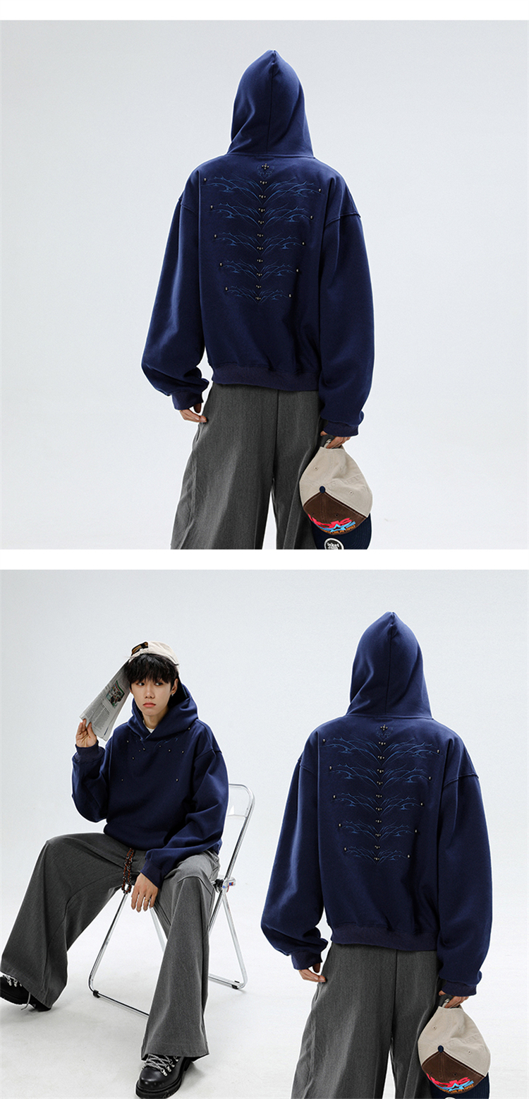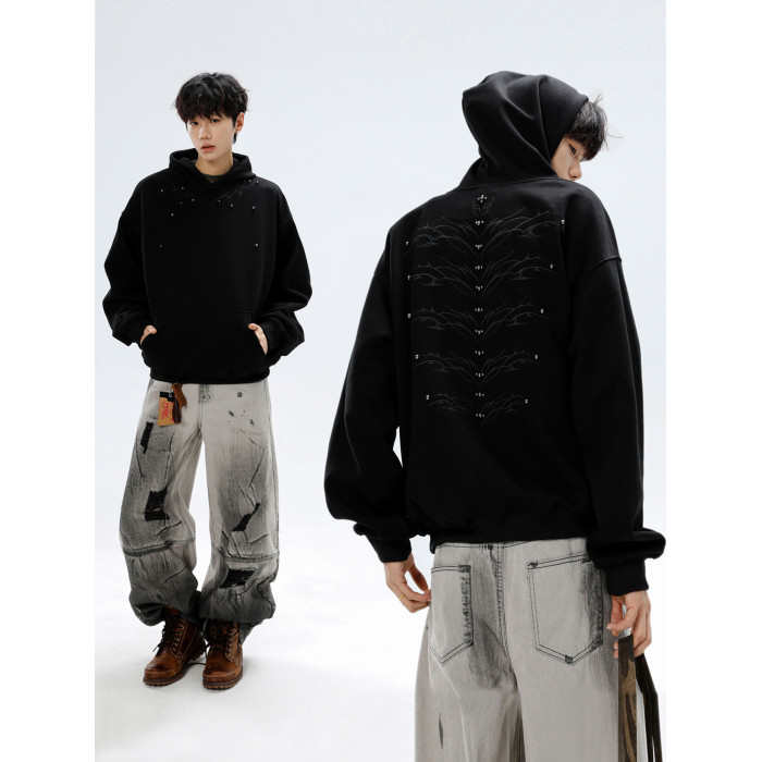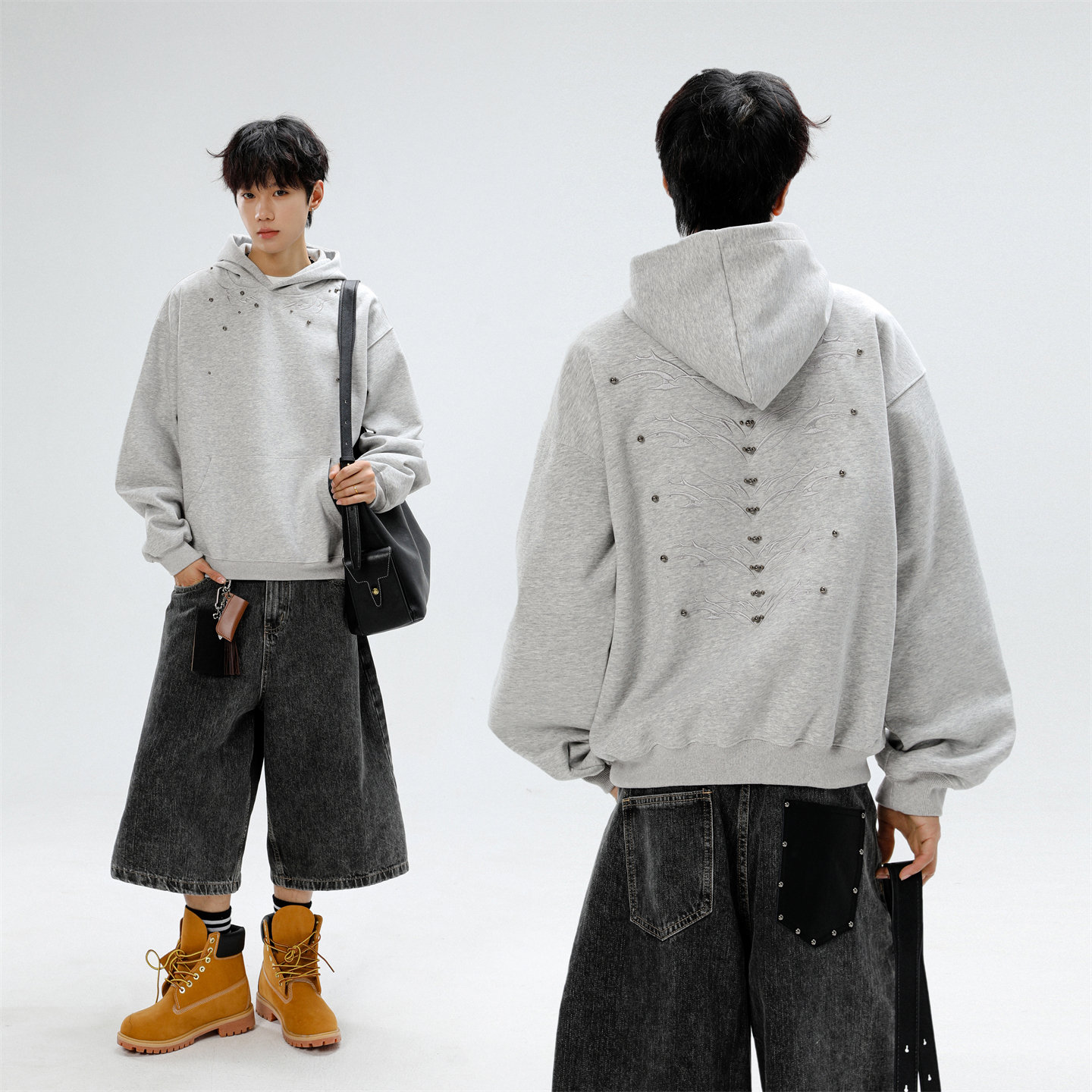 美式小衆脊骨釘珠刺綉連帽衛衣男款春秋季高街復古寬松設計感上衣