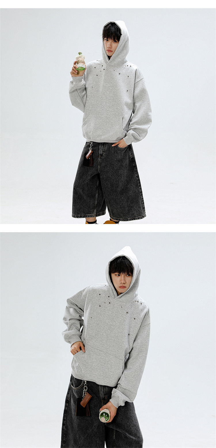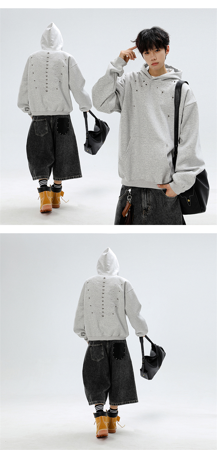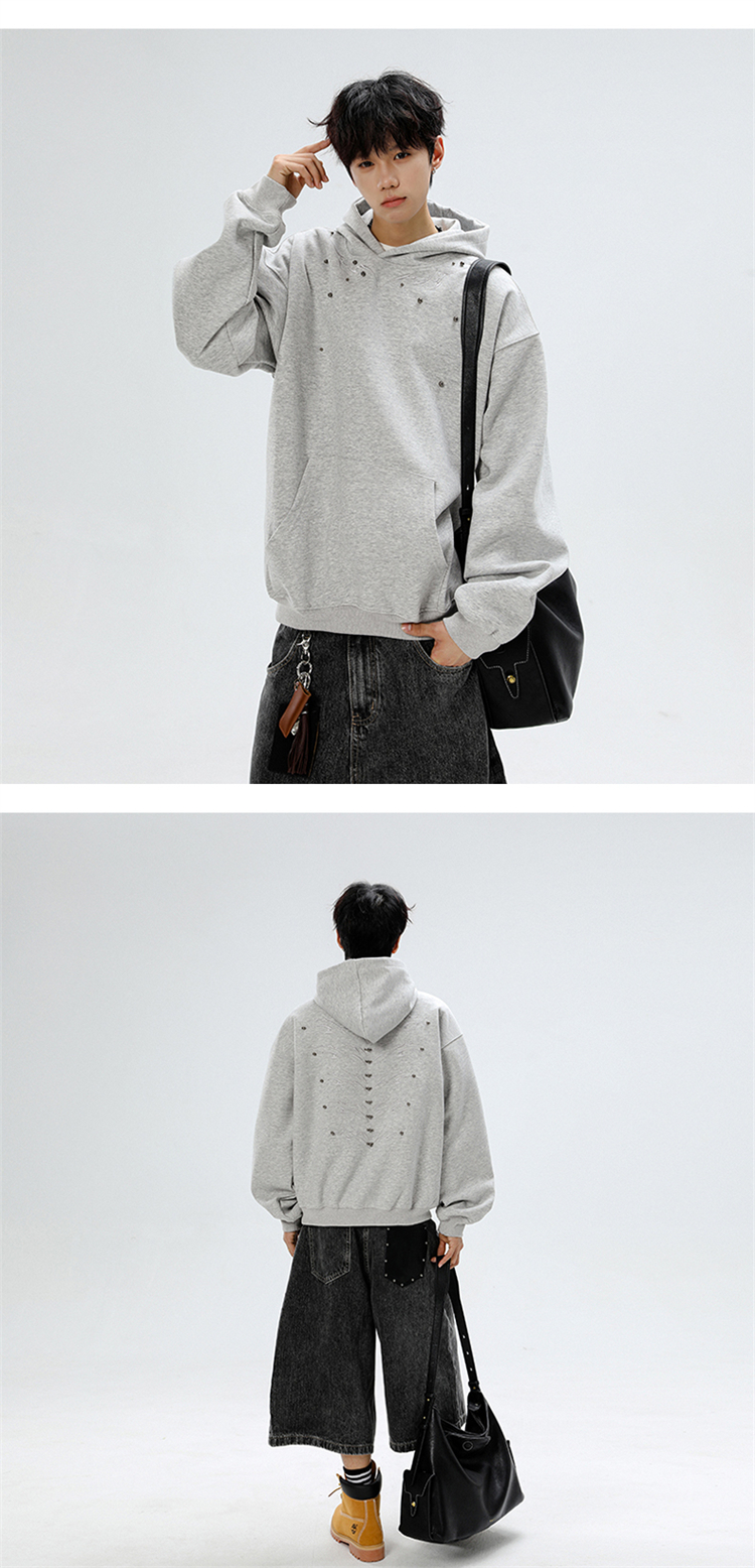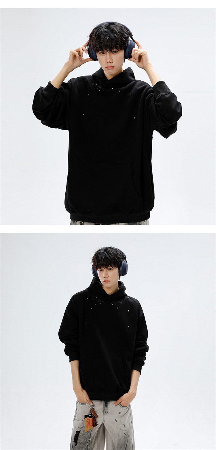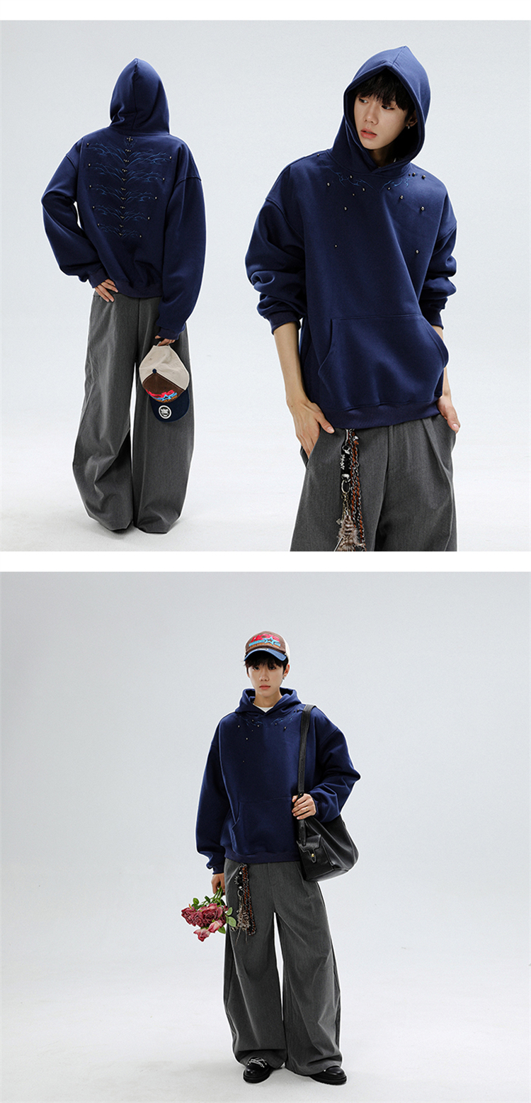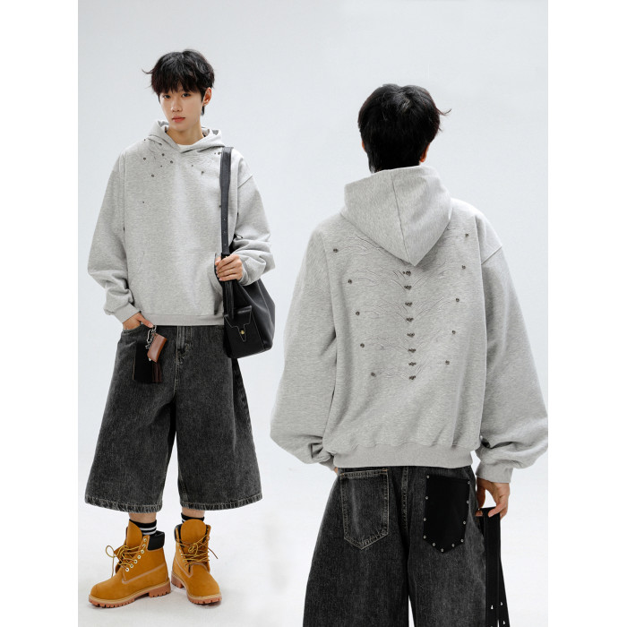 美式小衆脊骨釘珠刺綉連帽衛衣男款春秋季高街復古寬松設計感上衣