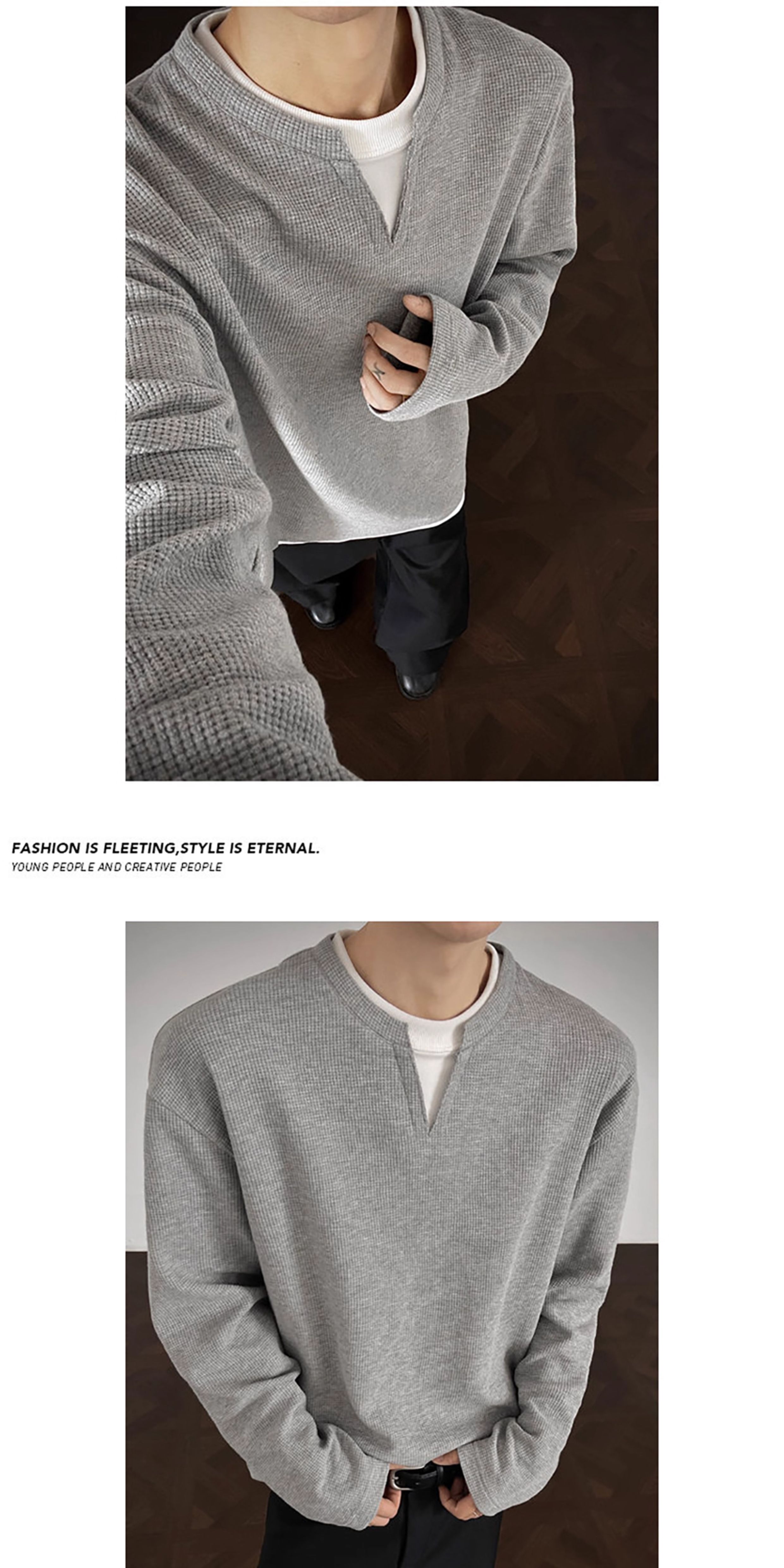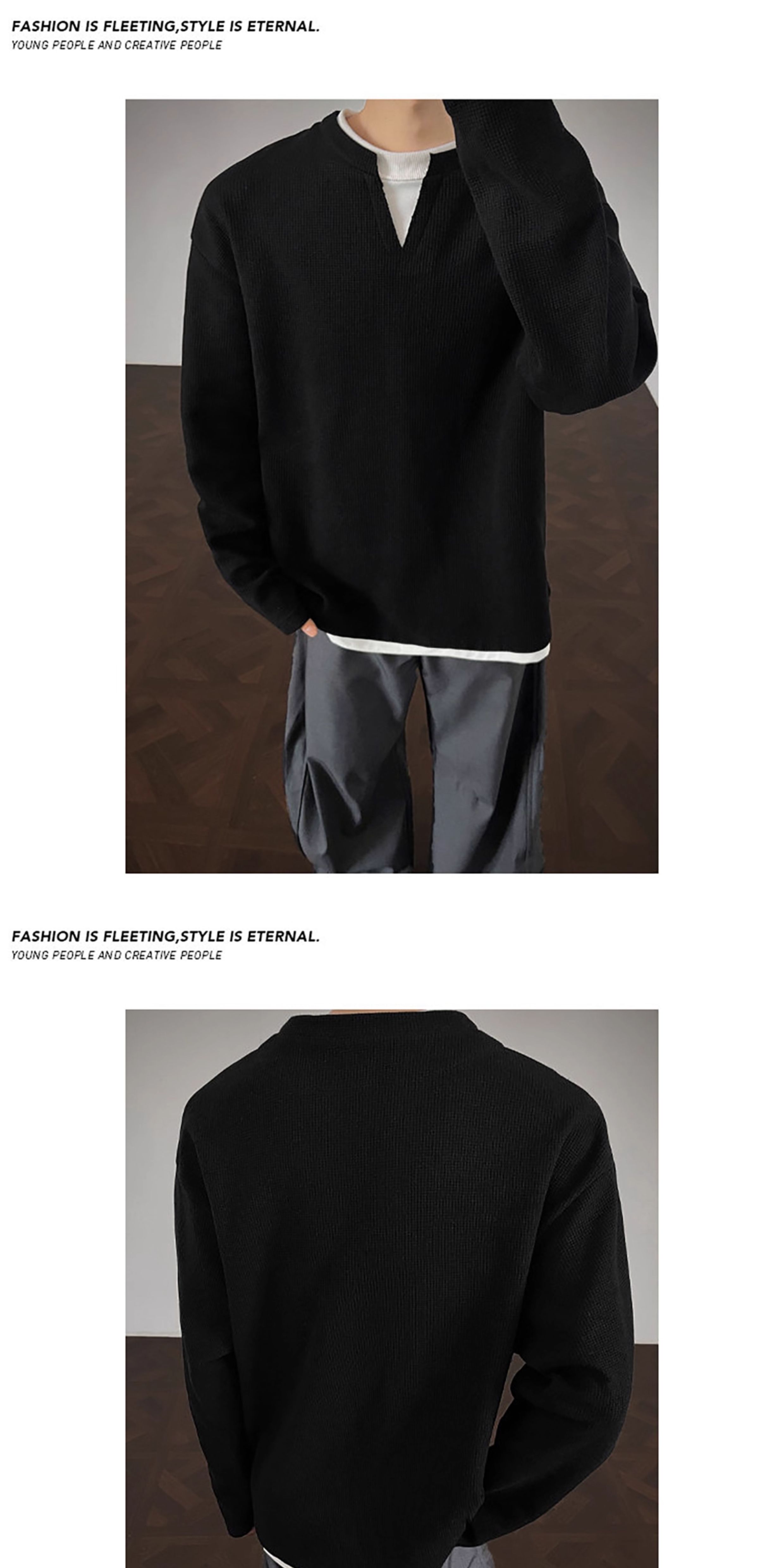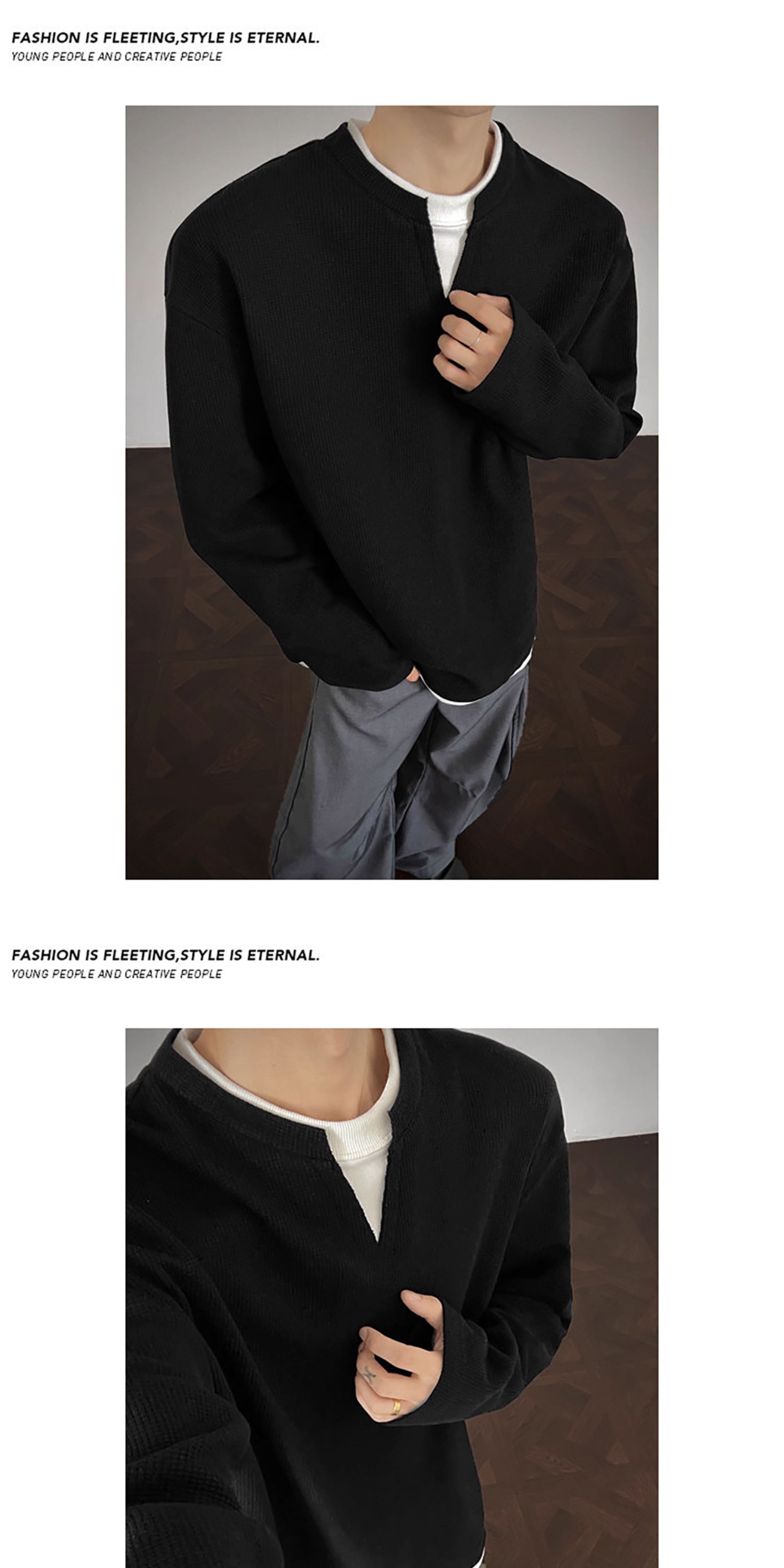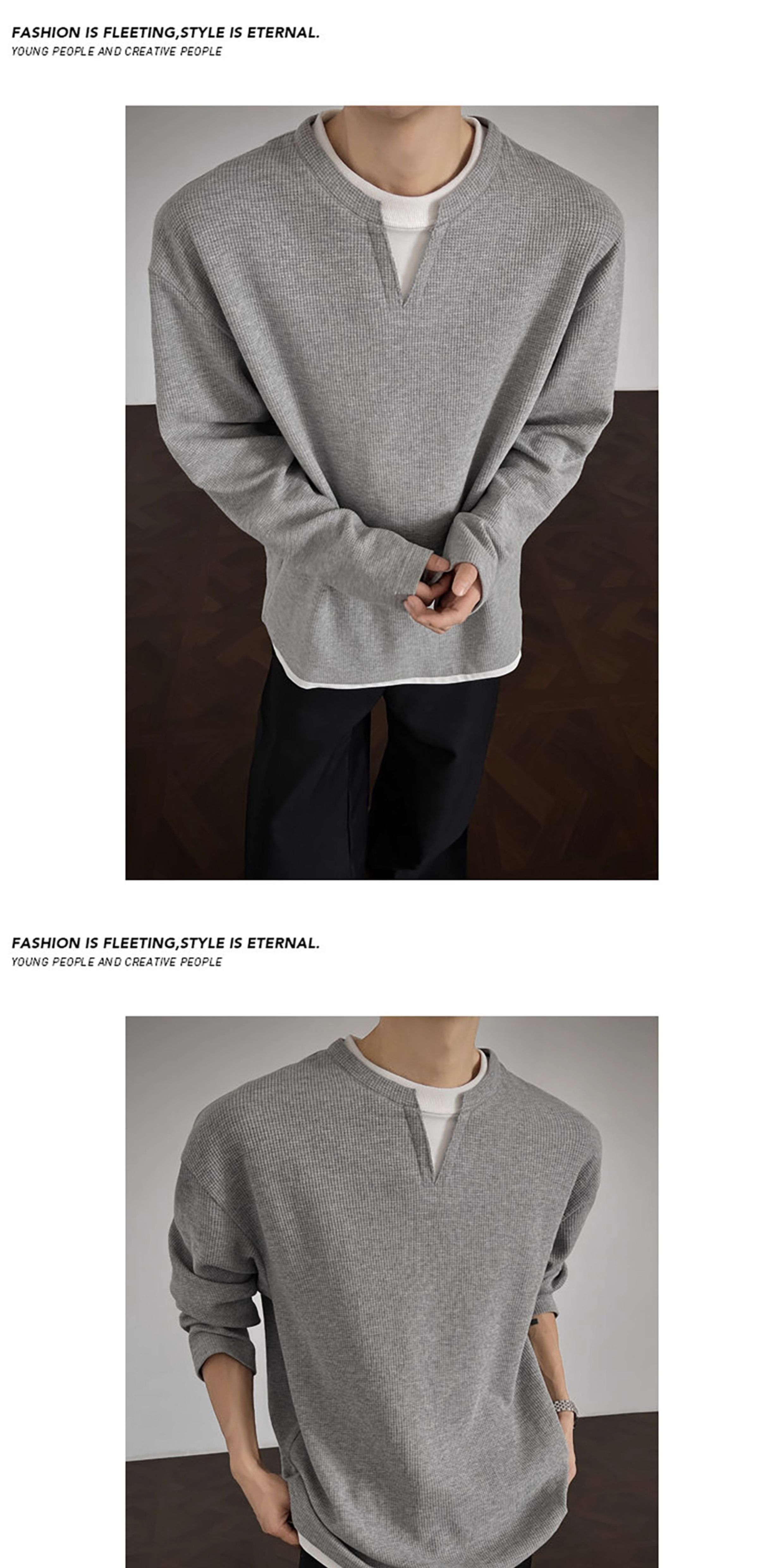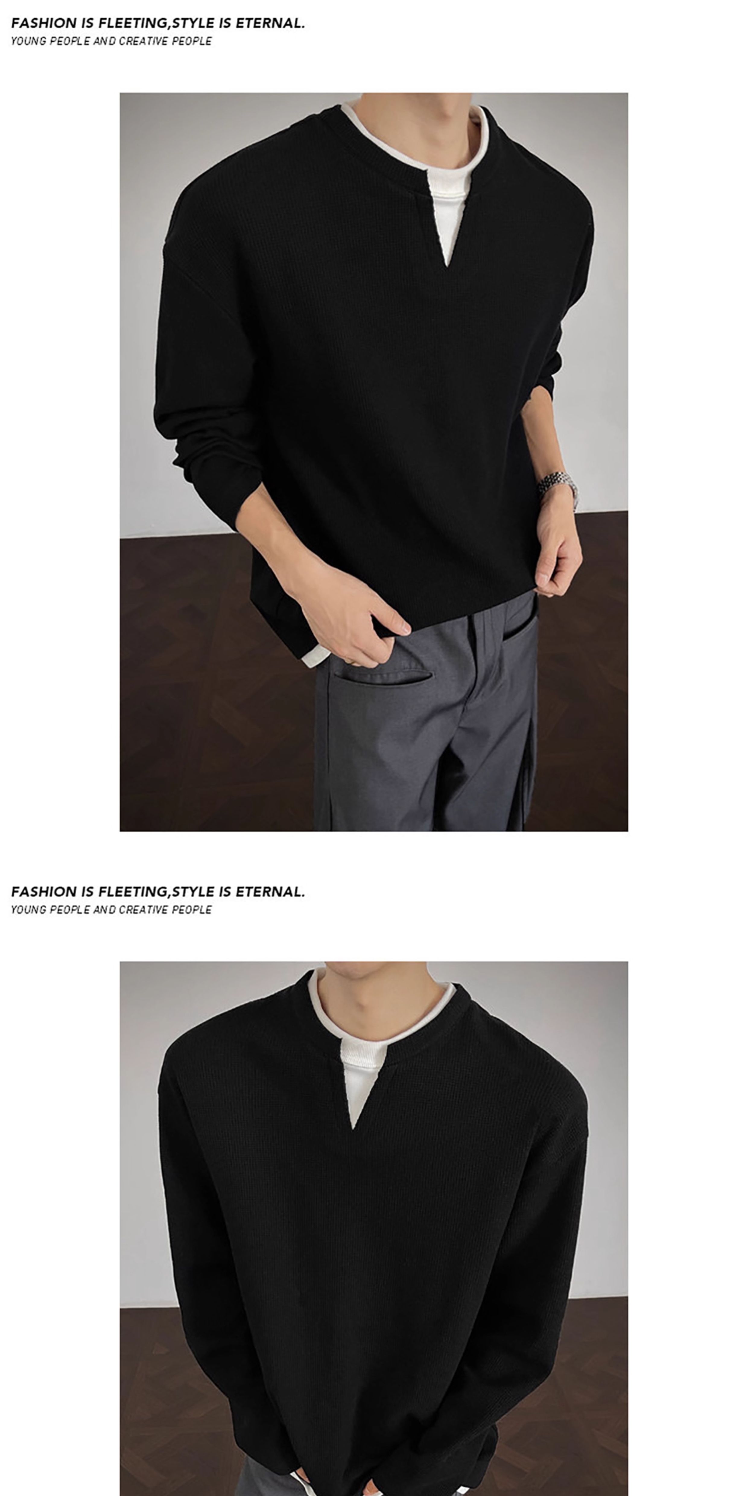 V37華夫格假兩件長袖T恤男秋美式純色V領打底衫高街休閒內搭上衣