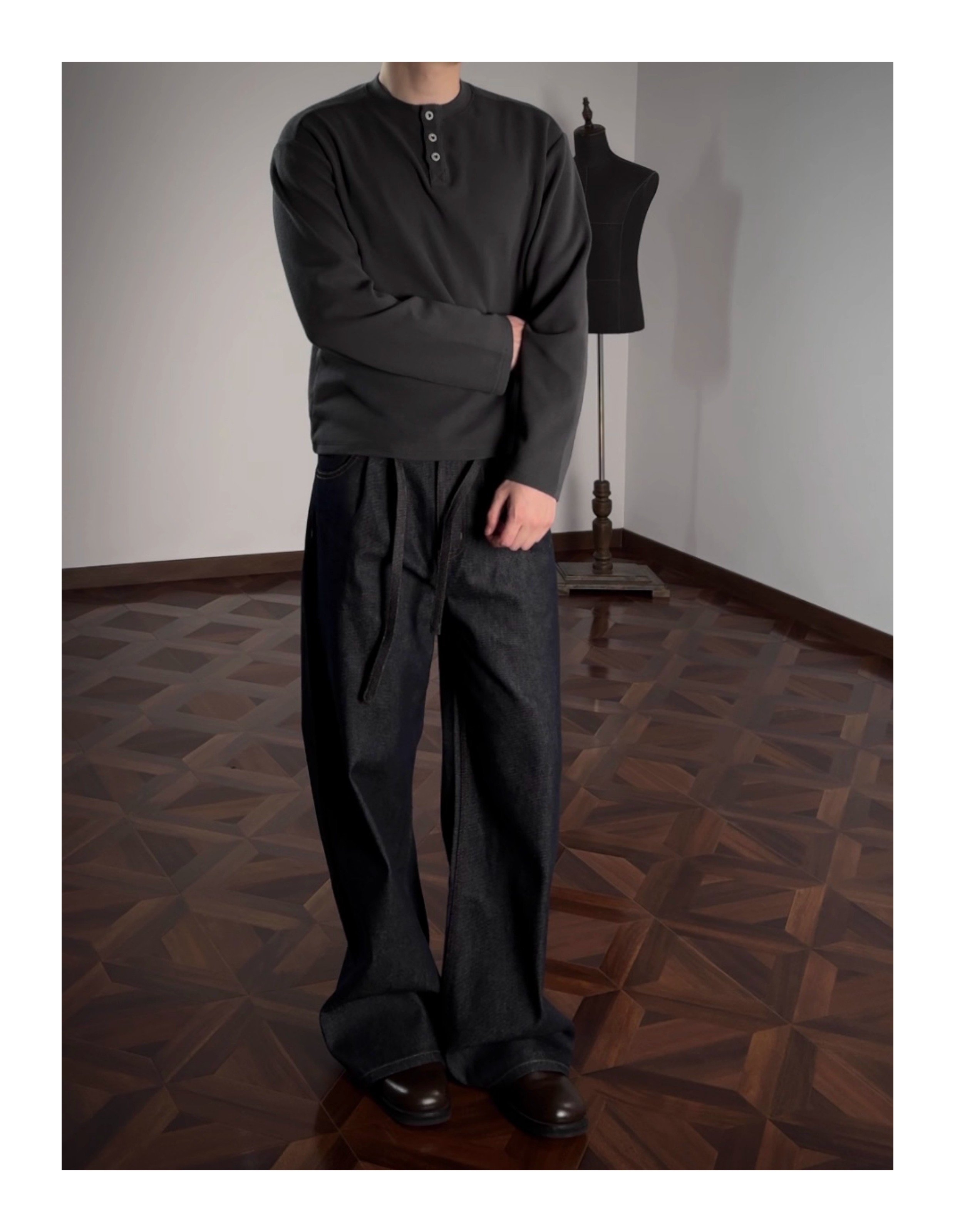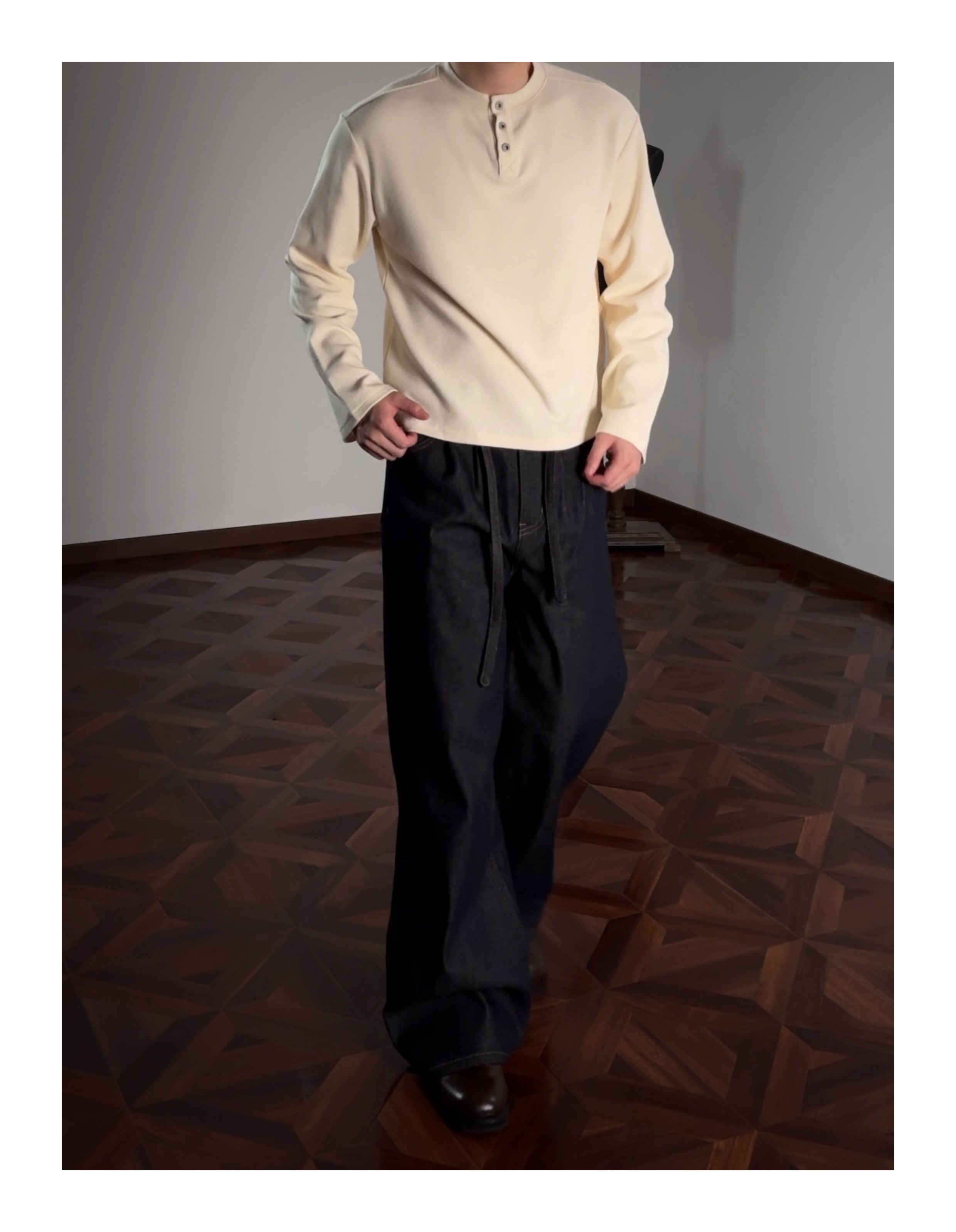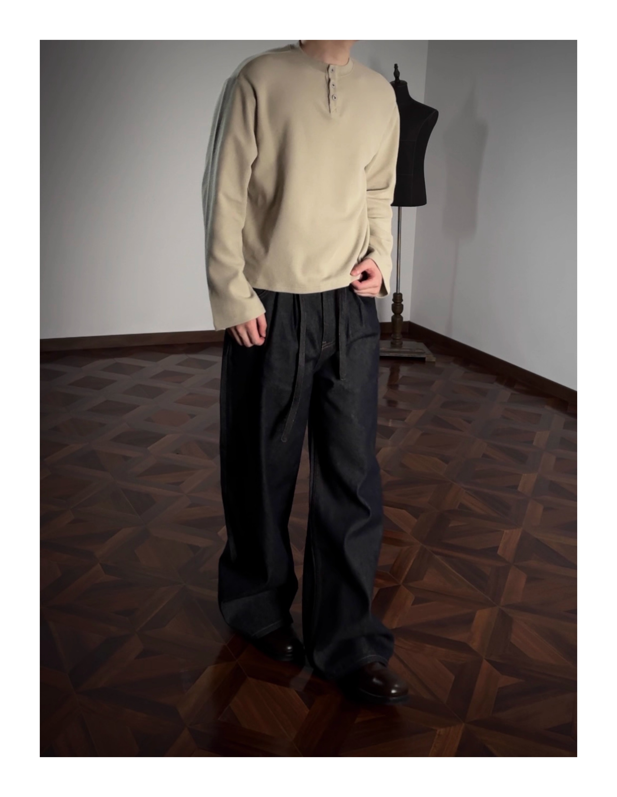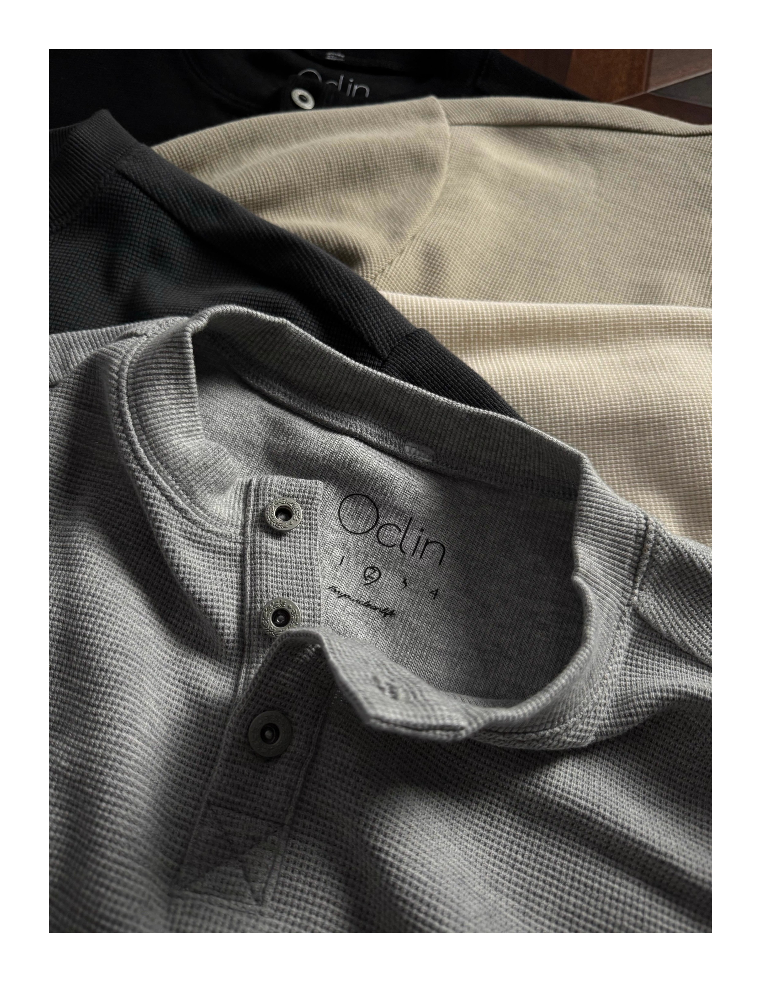 Oclin軟糯華夫格亨利領復古麥穗釦克羅風格基礎口糧長袖正肩微廓