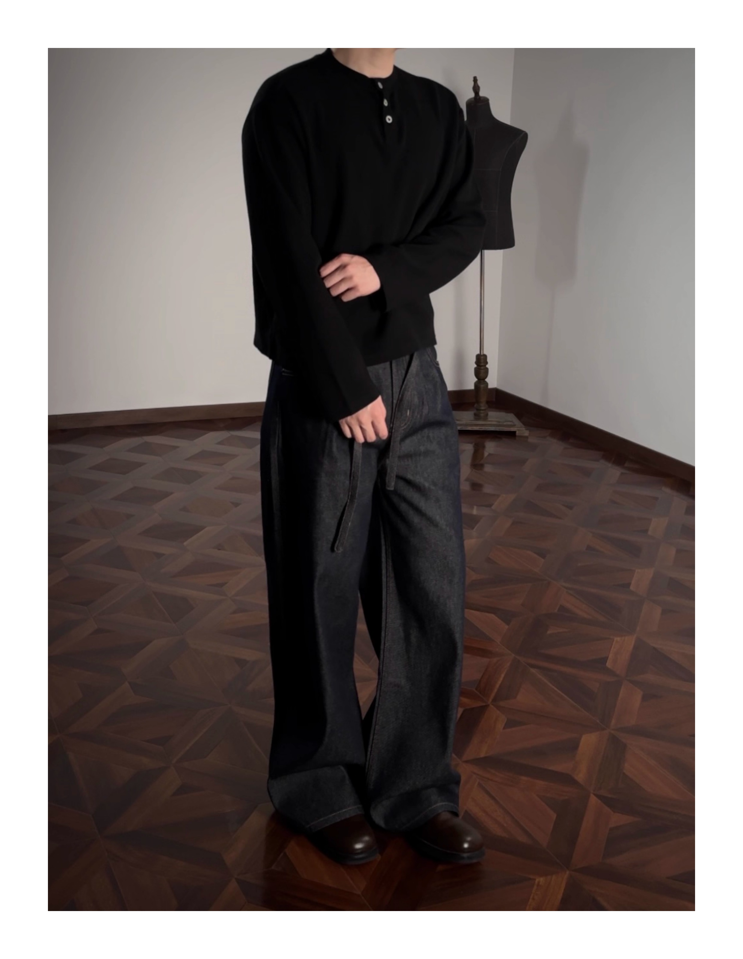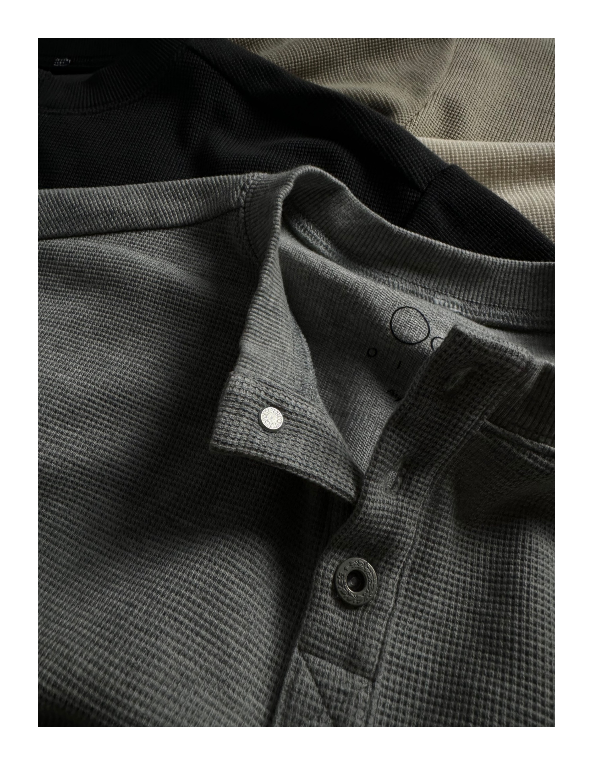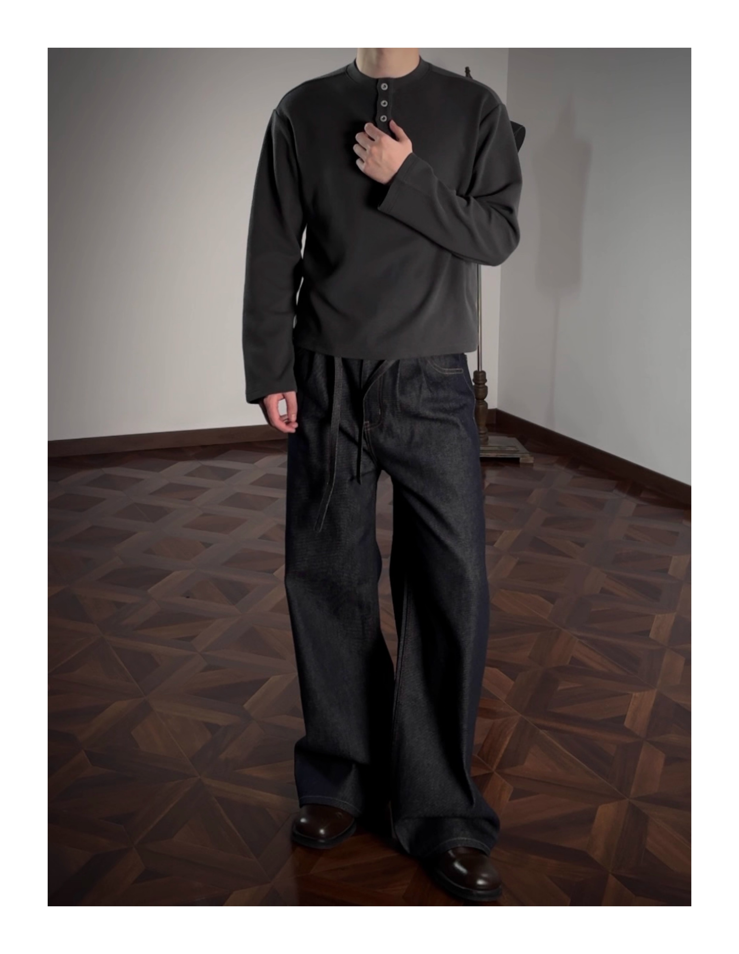 Oclin軟糯華夫格亨利領復古麥穗釦克羅風格基礎口糧長袖正肩微廓