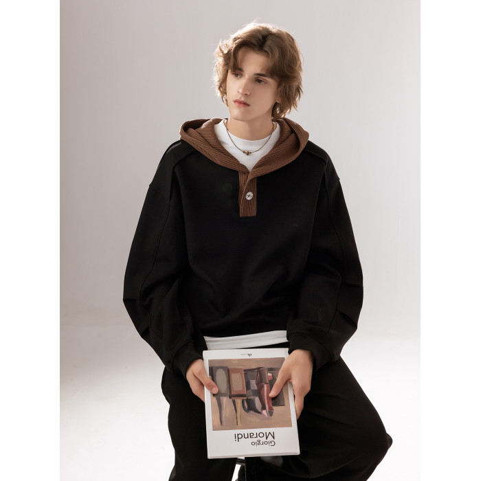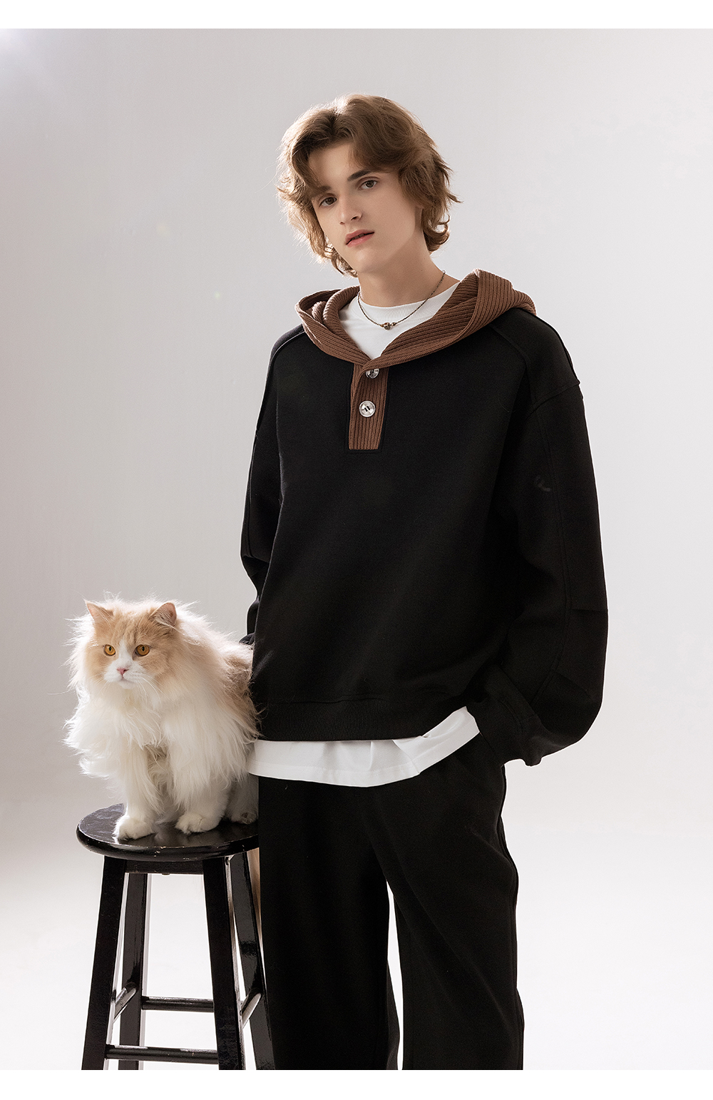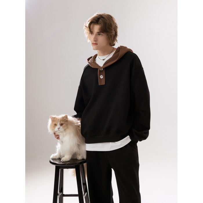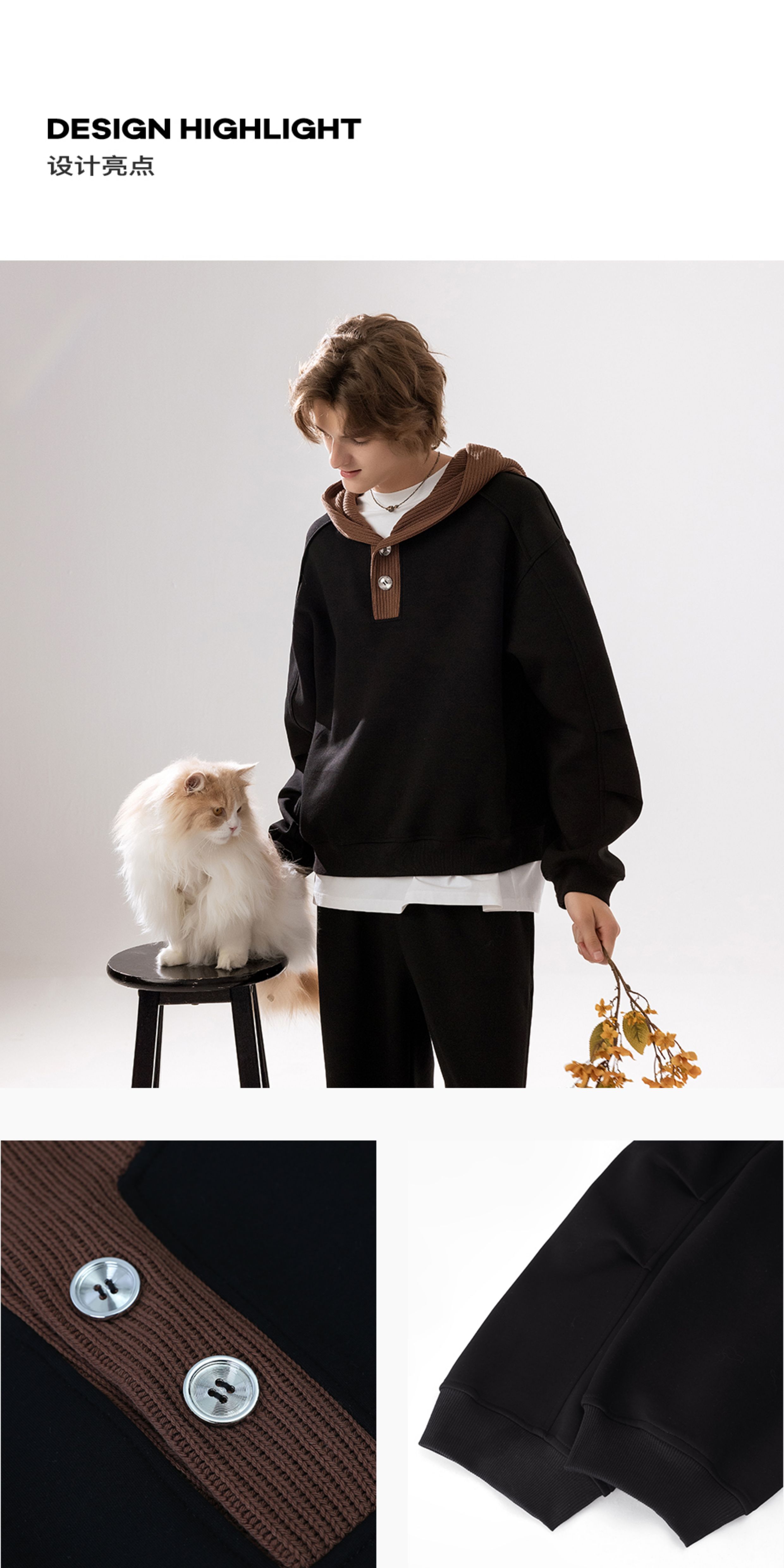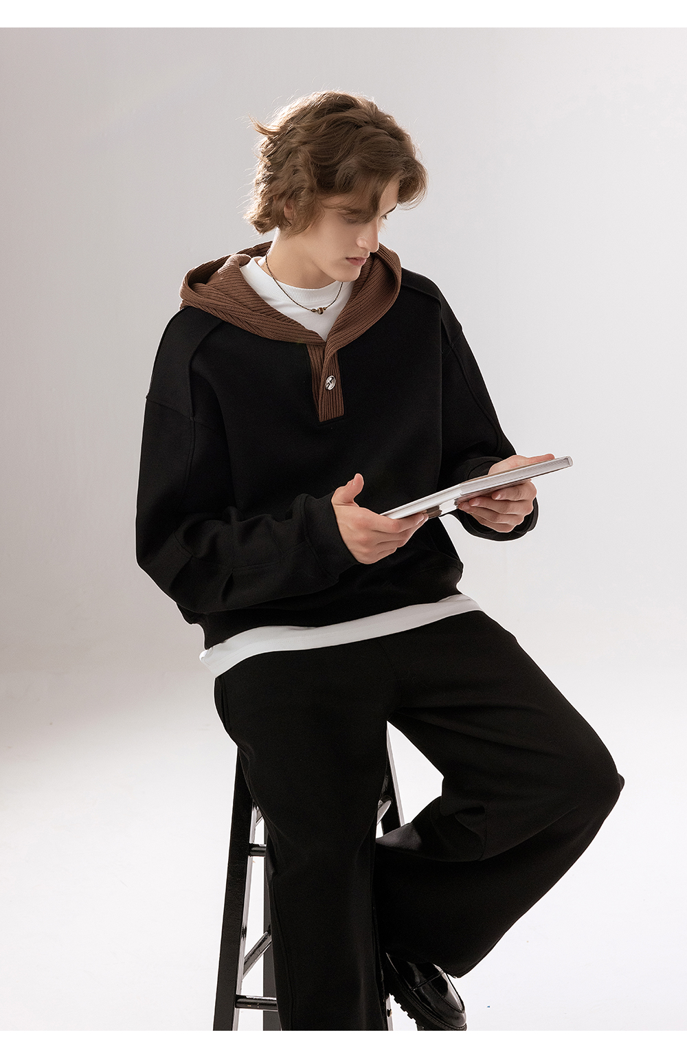 CHOR高級感休閒簡約半開襟連帽肌理針織拼色衛衣男生秋冬季上衣潮