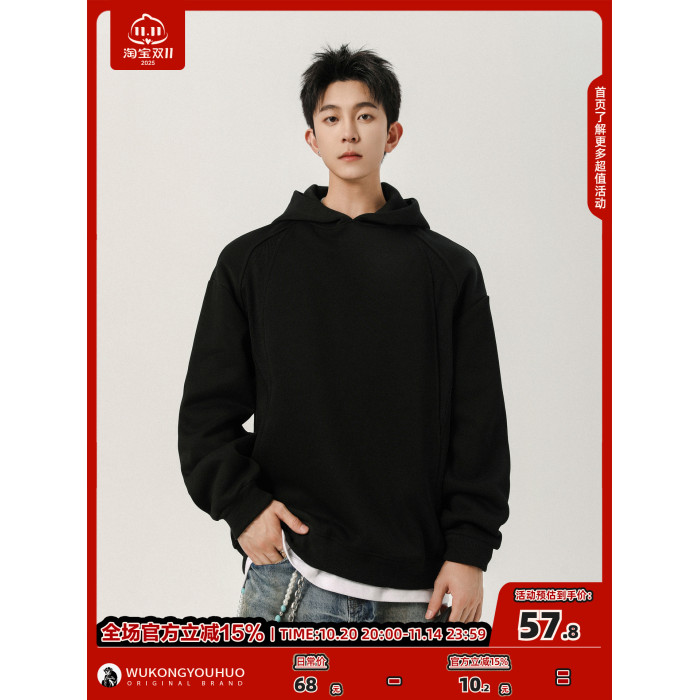 悟空有貨美式解搆空氣層灰色連帽衛衣男秋季潮牌簡約休閒運動帽衫