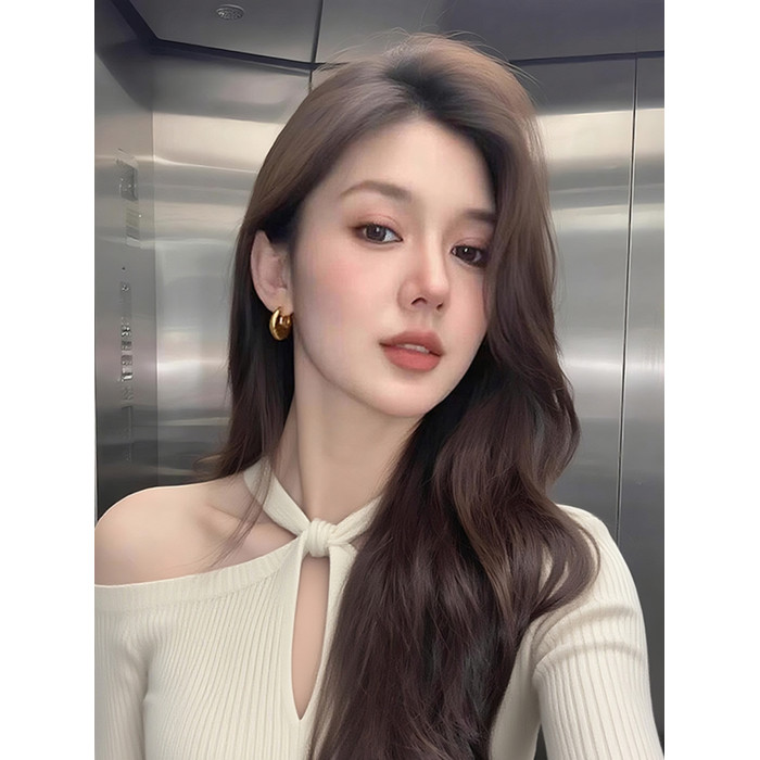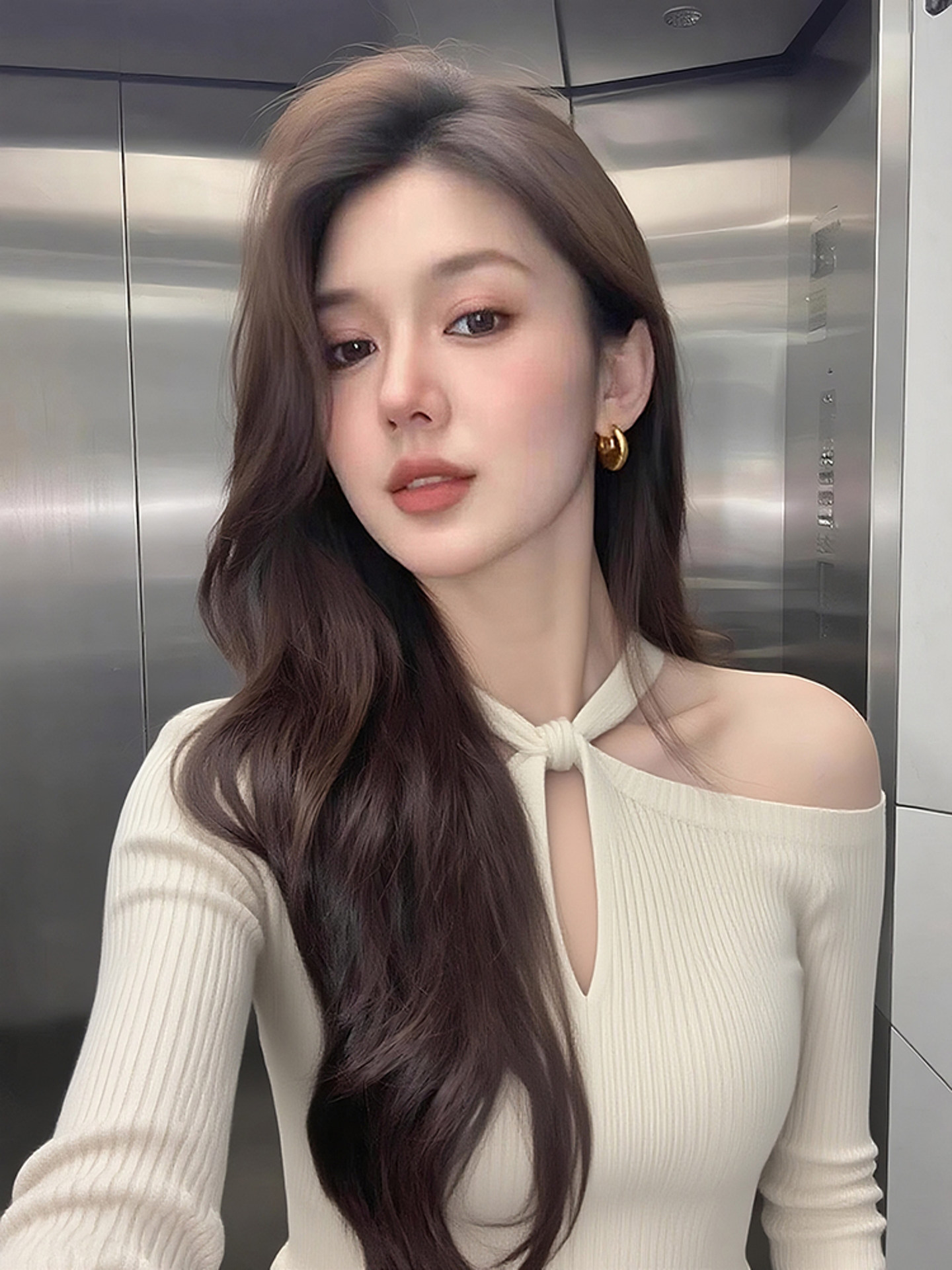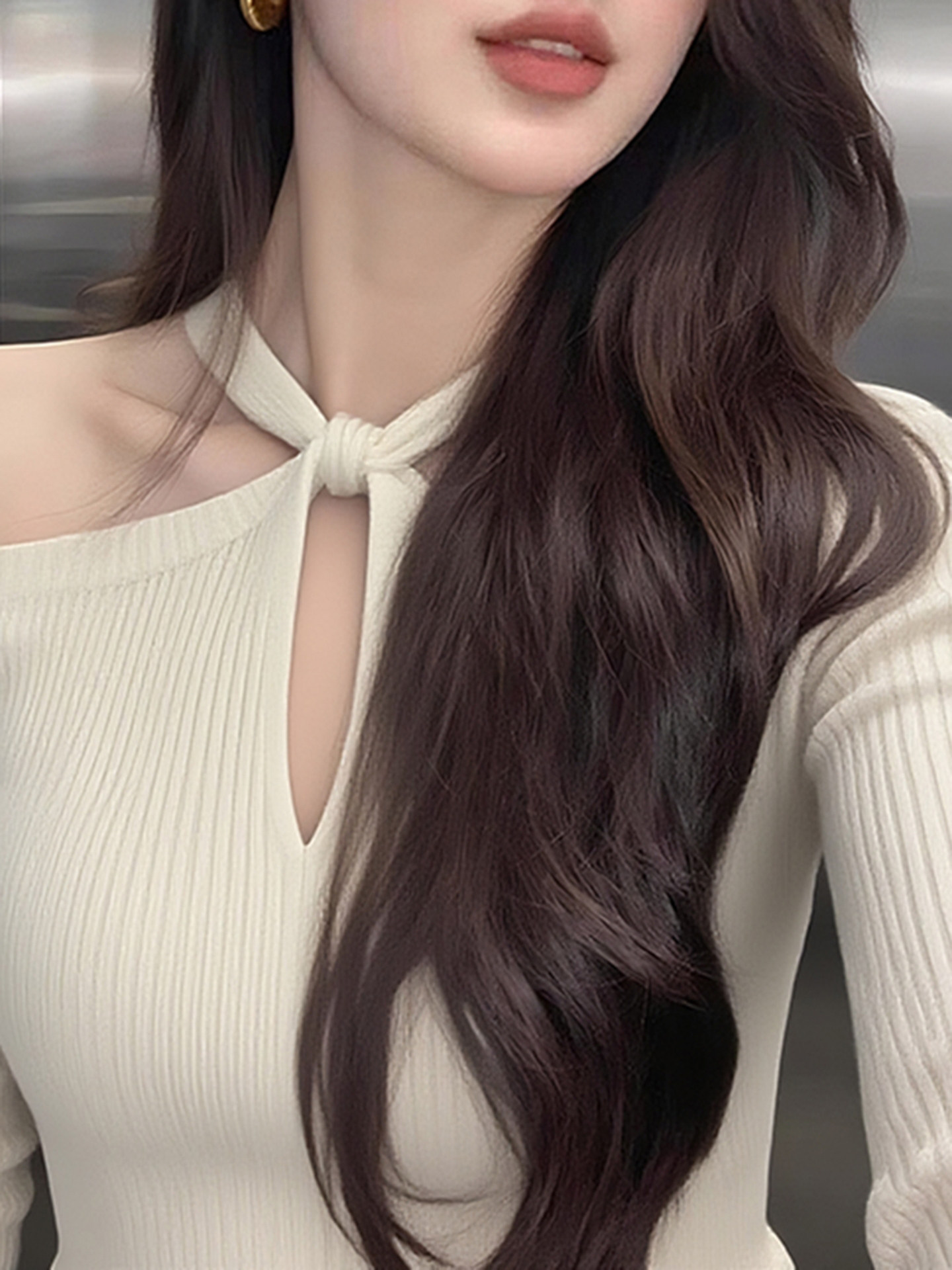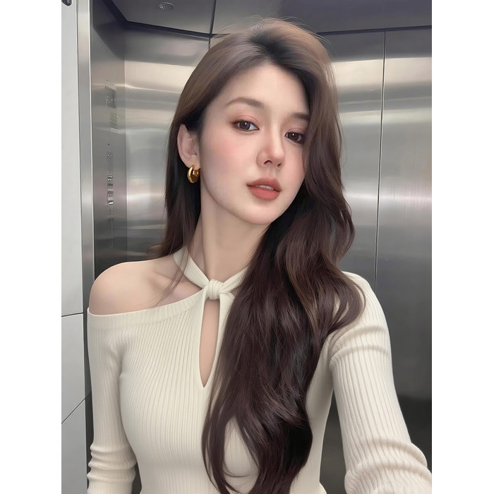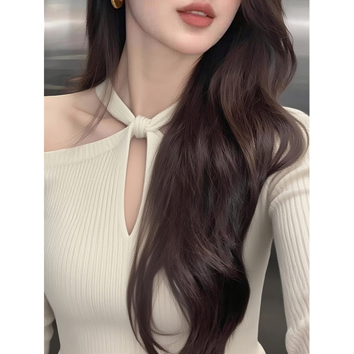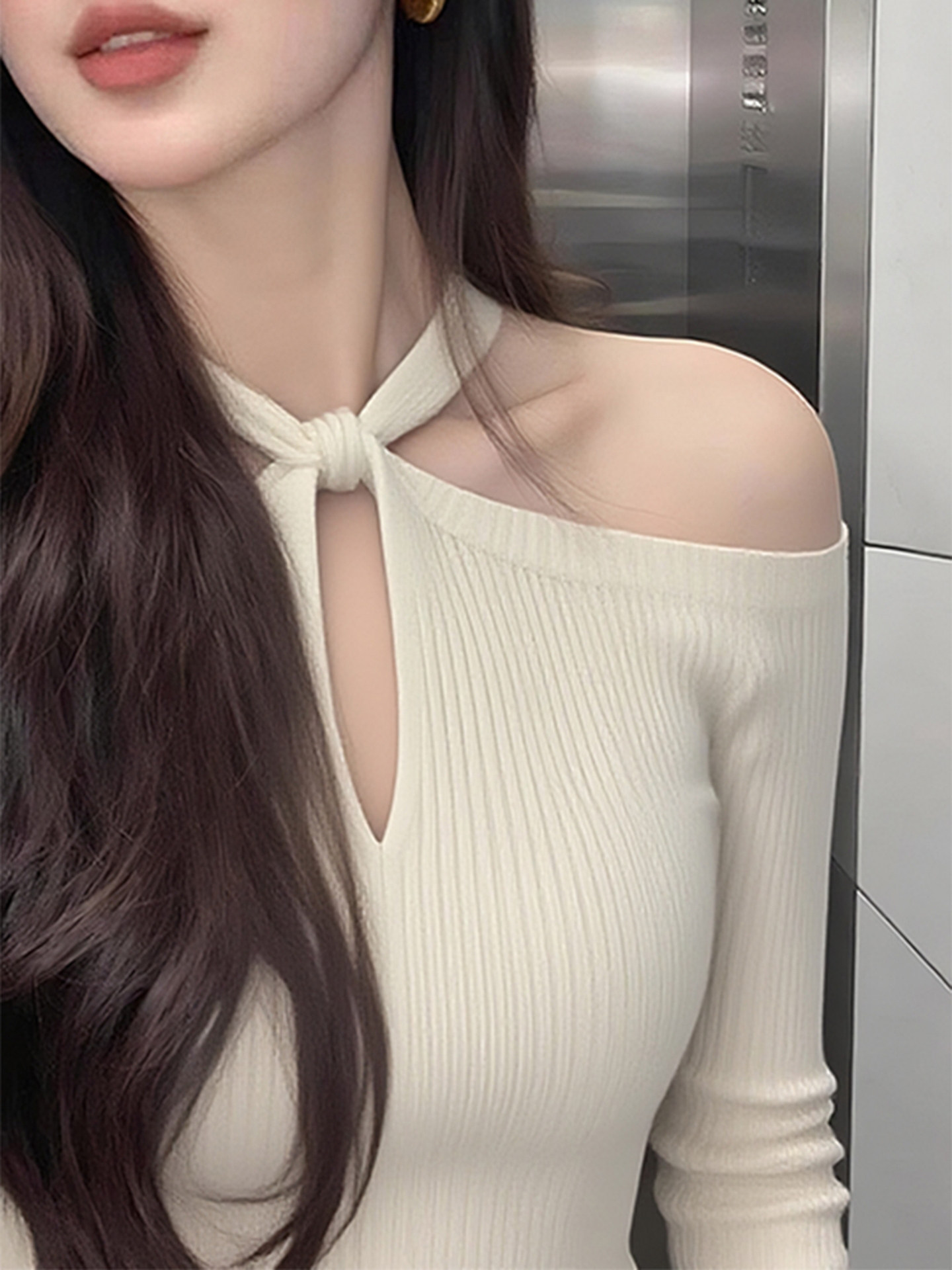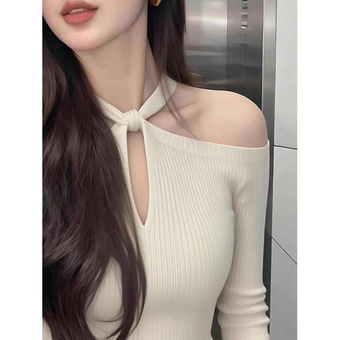 早秋冬輕熟甜辣妹露肩掛脖針織打底衫女士內搭設計感修身鏤空上衣