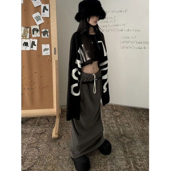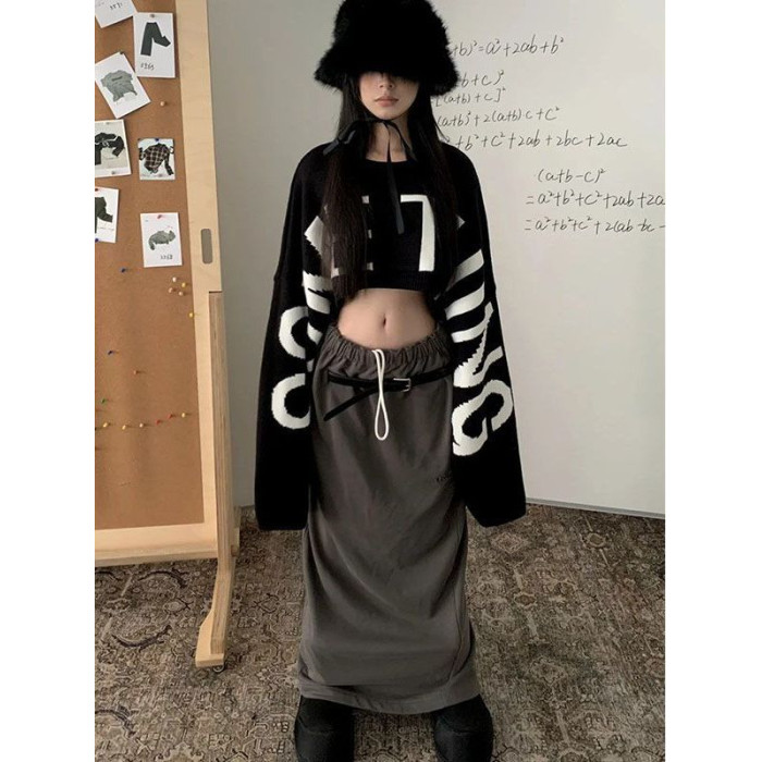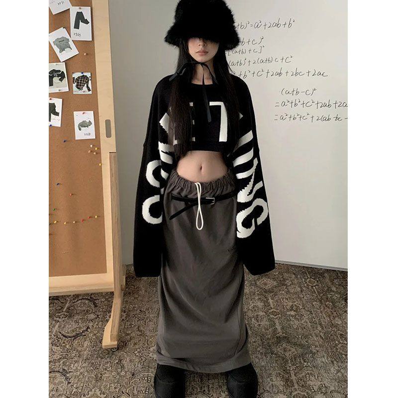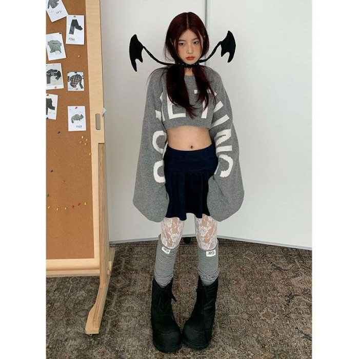 超大袖子字母印花休閒短款毛衣女秋季寬松顯瘦個性街頭針織衫上衣