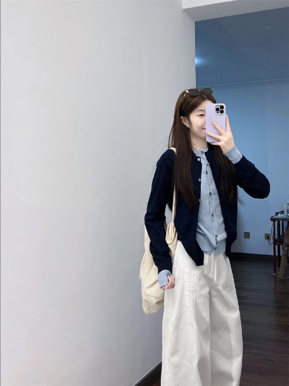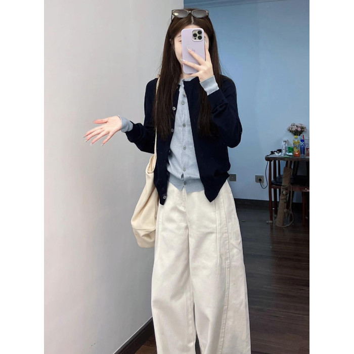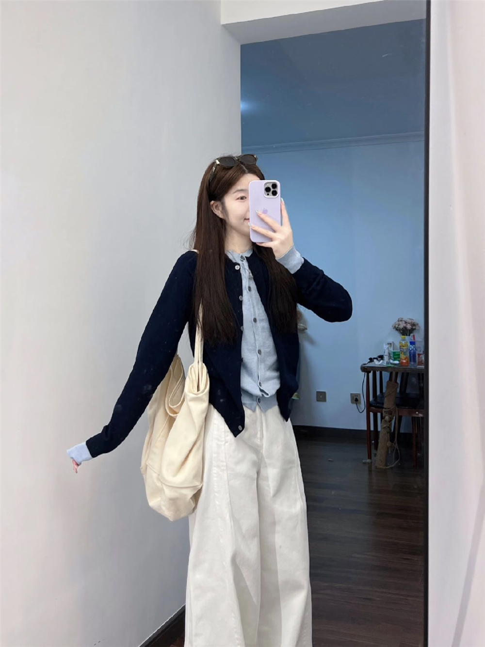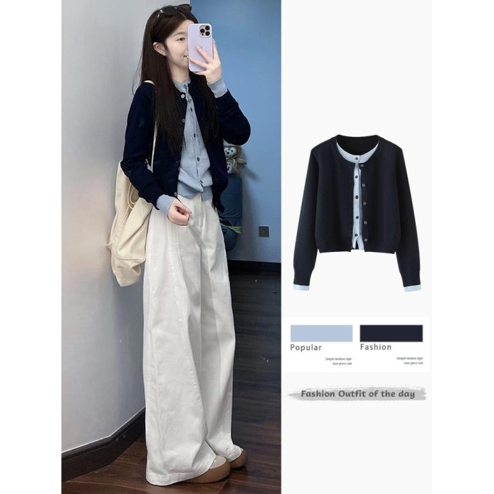 藏青色假兩件設計感薄針織開衫外套女2025新款早秋氛圍感穿搭上衣