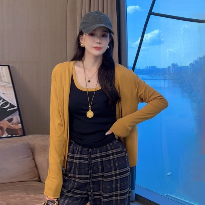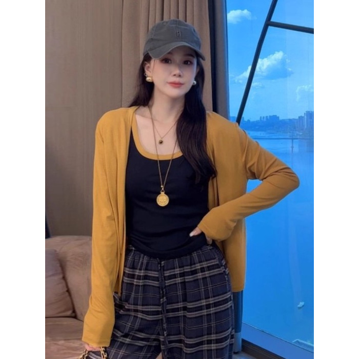 大碼胖mm韓系慵懶感撞色長袖針織開衫女秋冬上衣休閒風吊帶兩件套