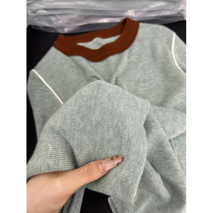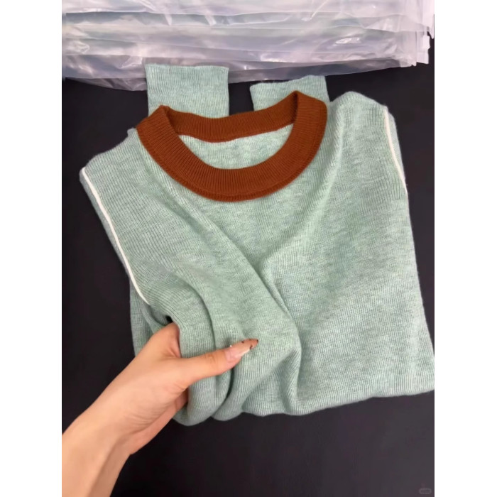 薄荷綠撞色拼接圓領針織衫毛衣女2025秋季軟糯修身設計感打底上衣