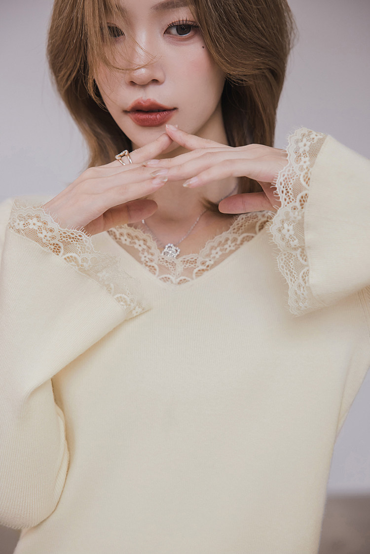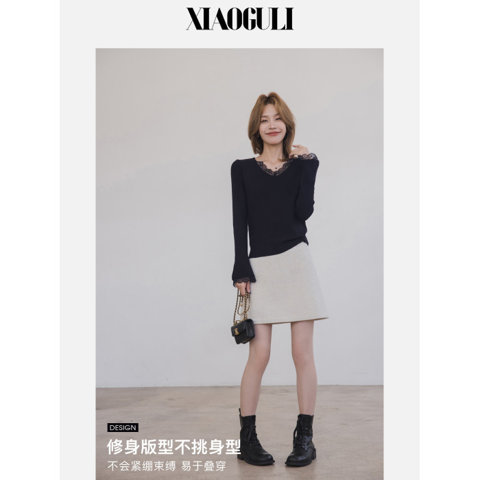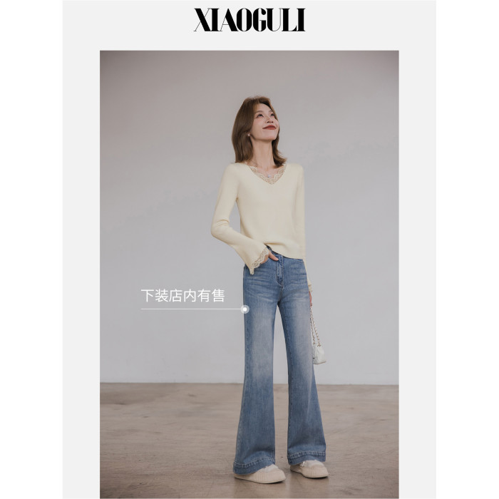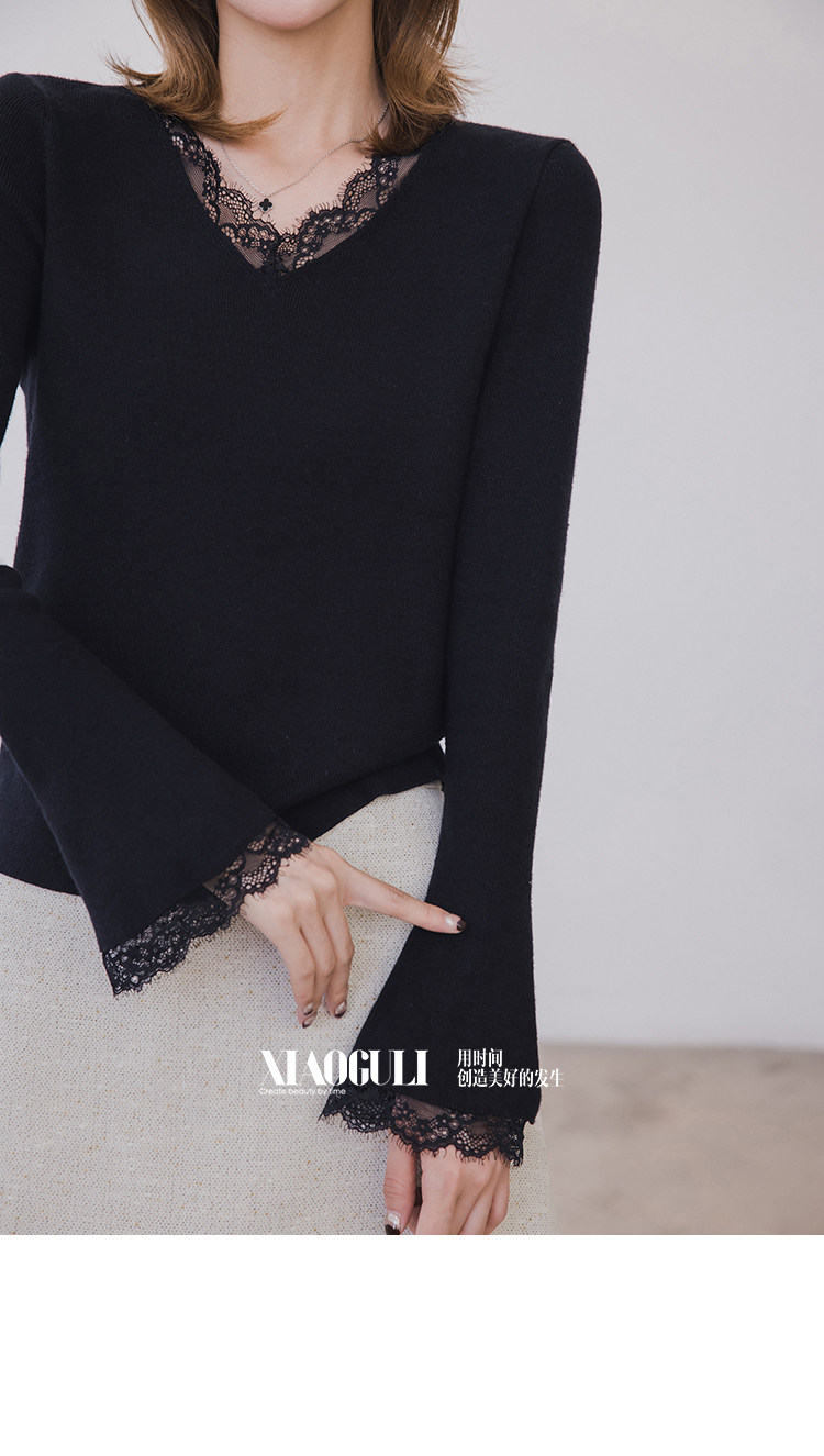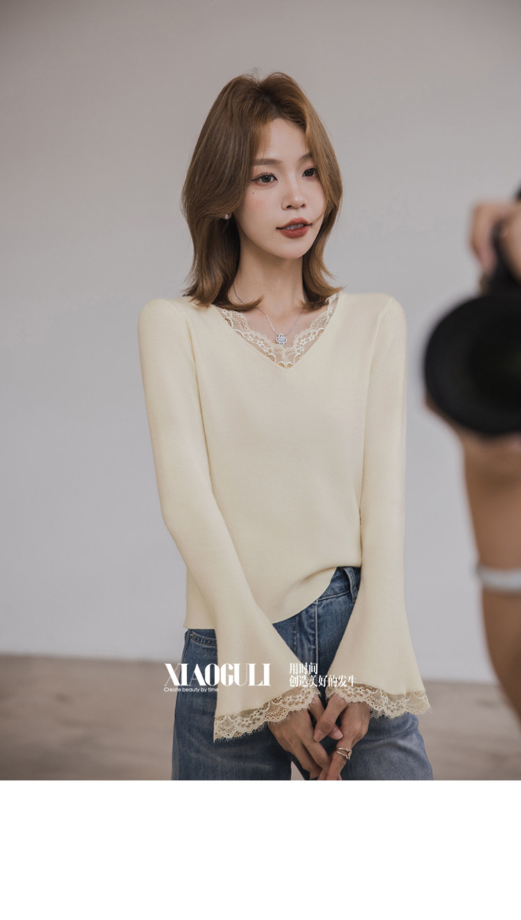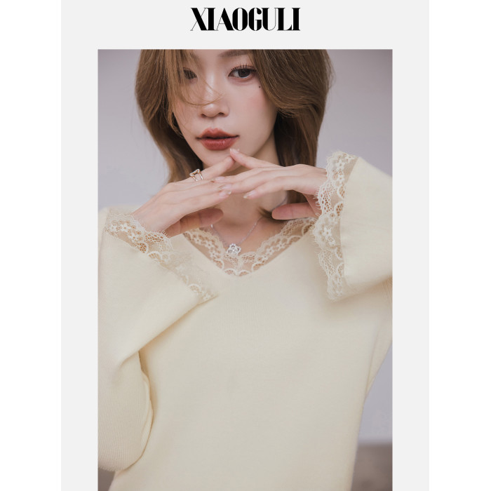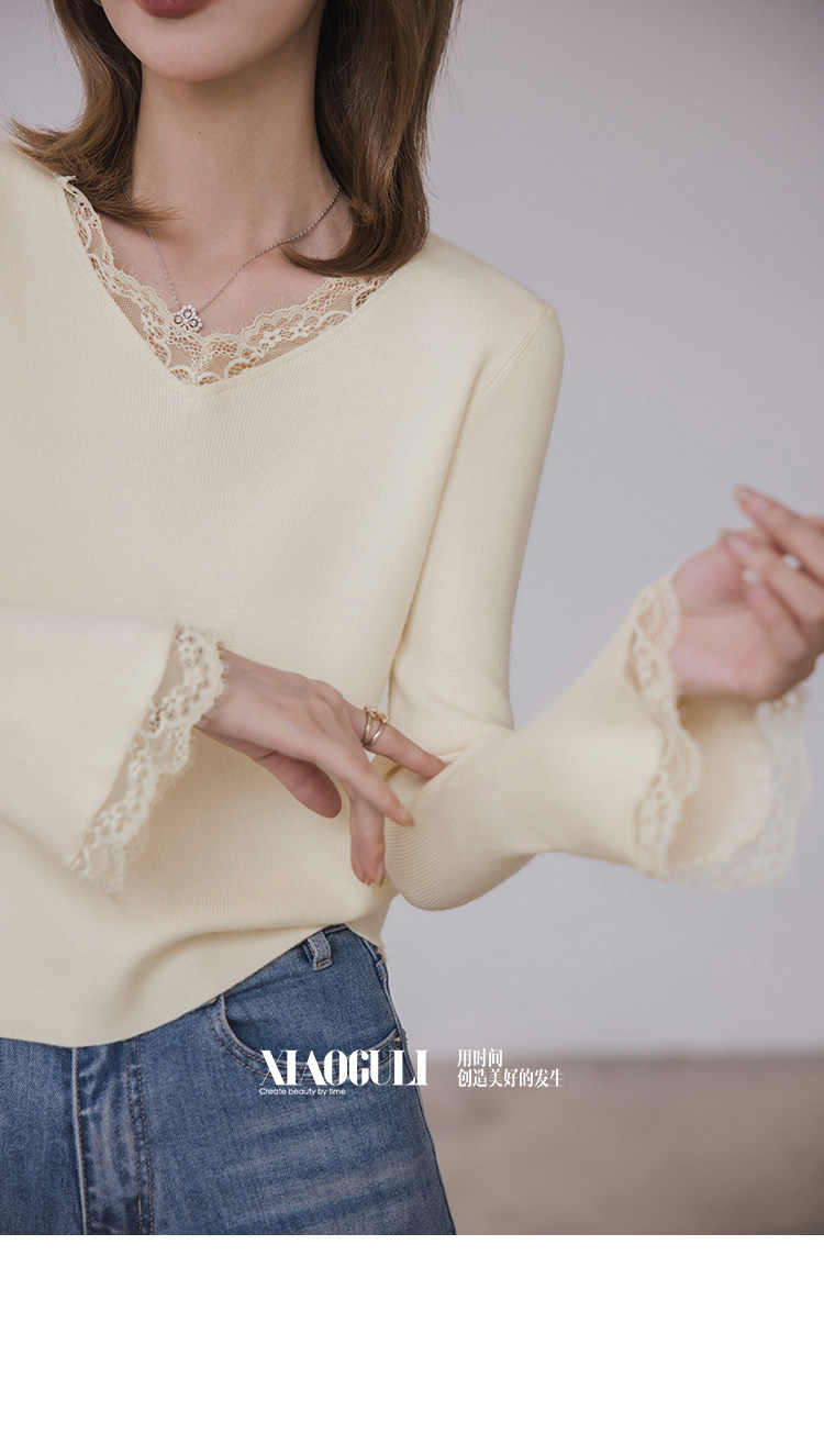 小穀粒氧氣針織衫 蕾絲邊設計感毛衣女秋季新款v領百搭顯瘦上衣