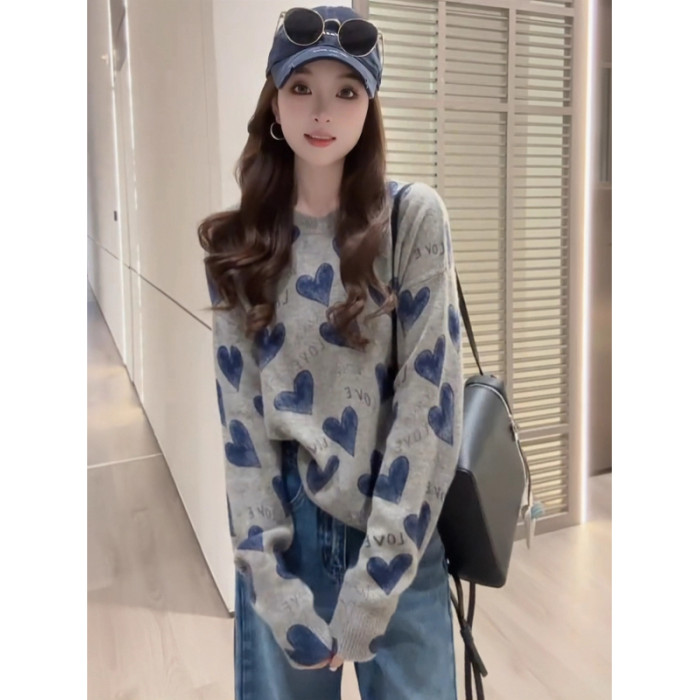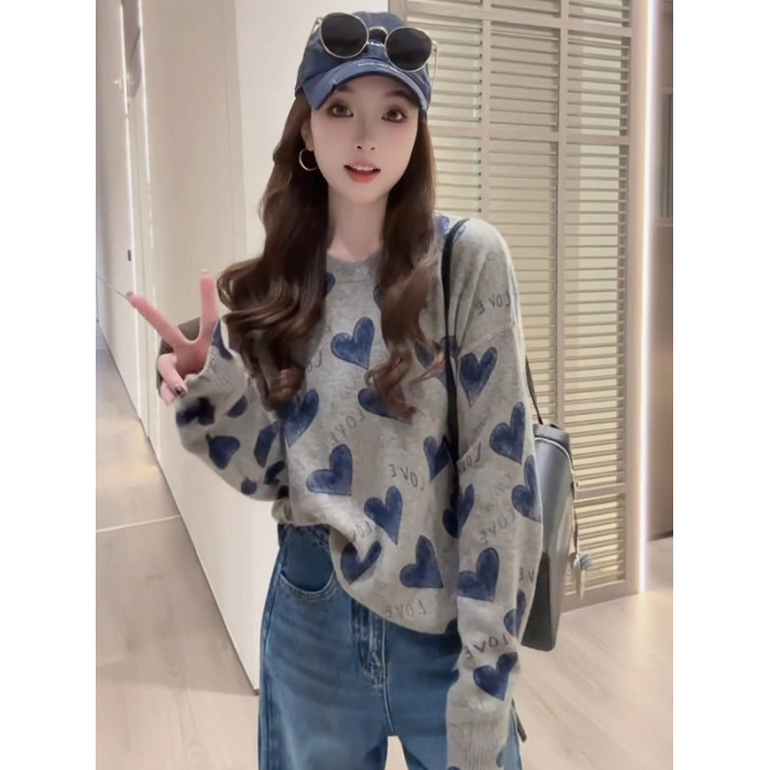 韓系氛圍感寬松愛心字母針織衫上衣女早秋慵懶風時尚減齡套頭毛衣