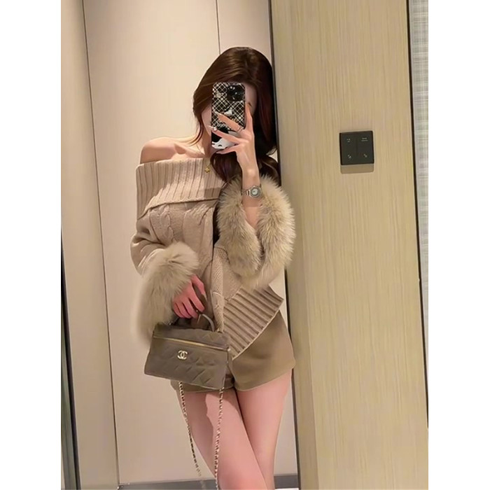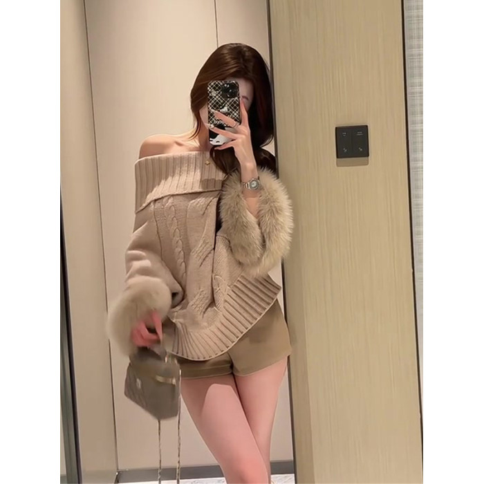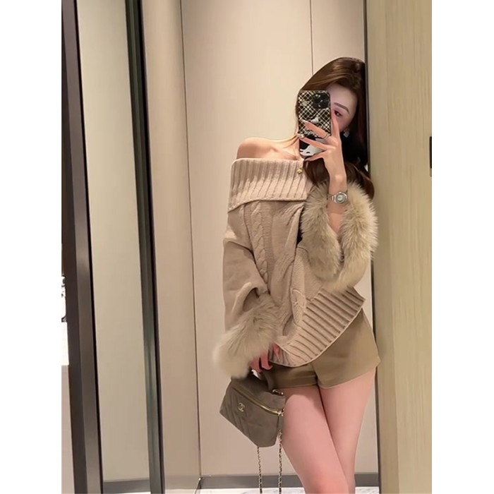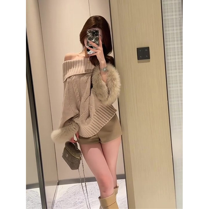 一字肩長袖鬭篷毛衣女秋季純欲千金風寬松顯瘦高級感辣妹露肩上衣