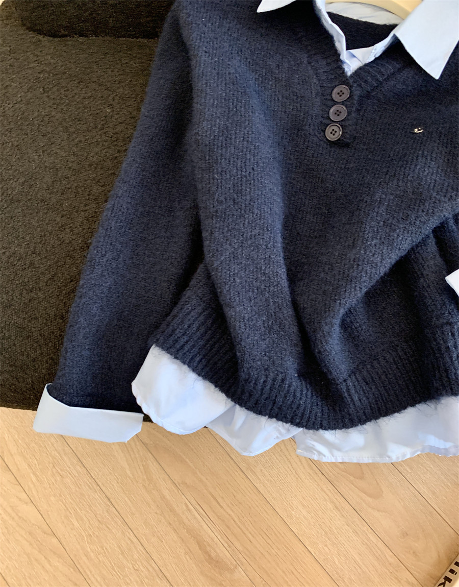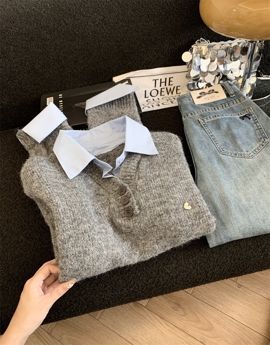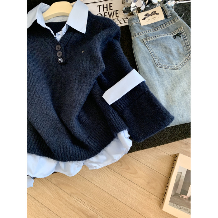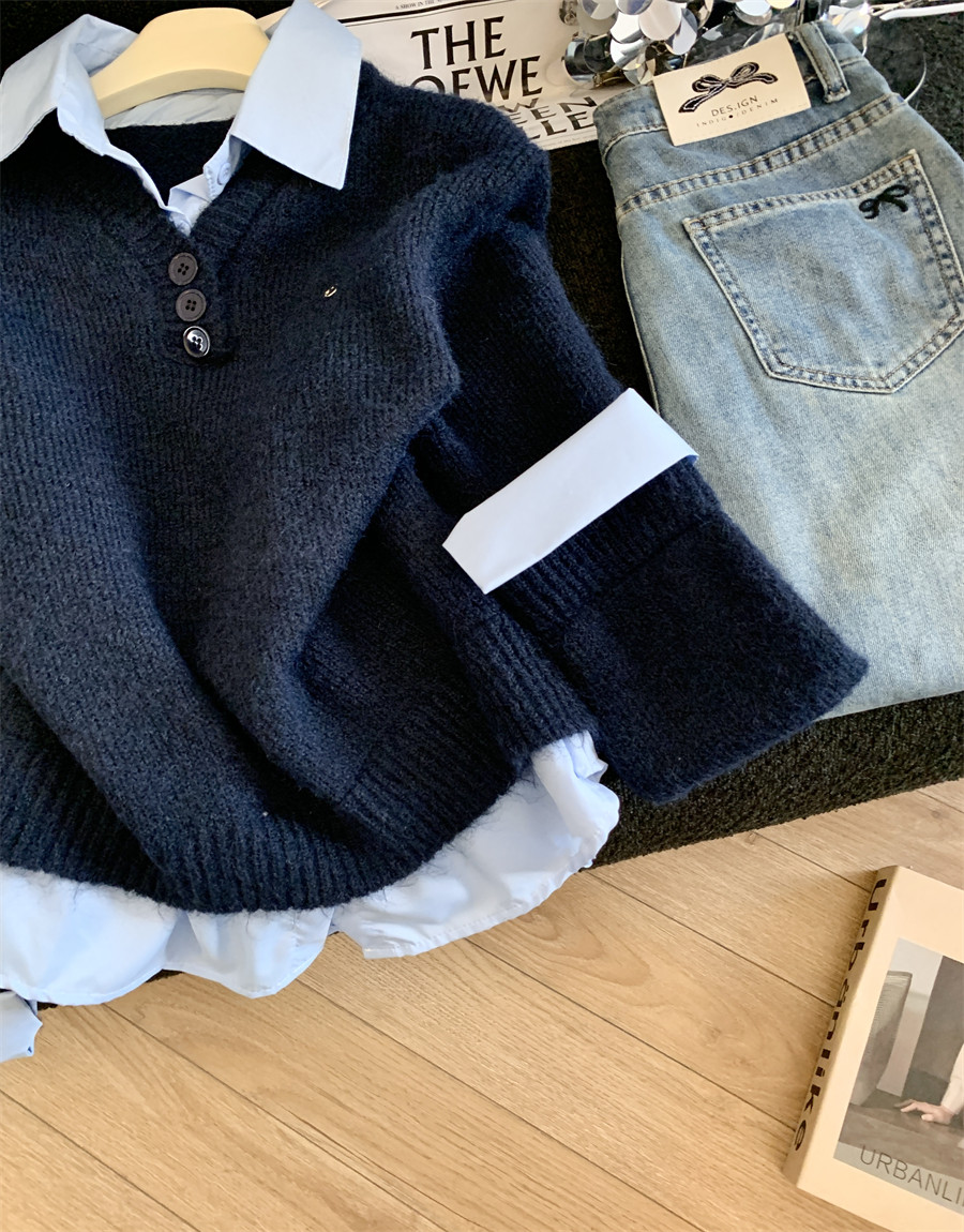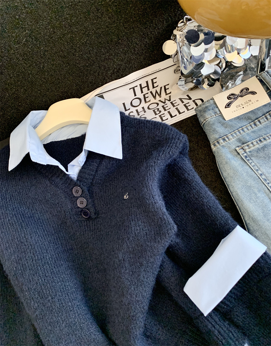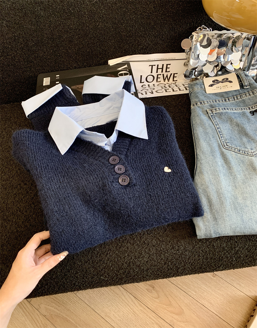 Jade Closet店推薦~美德拉甜美風翻領拼接長袖針織毛衣女秋冬