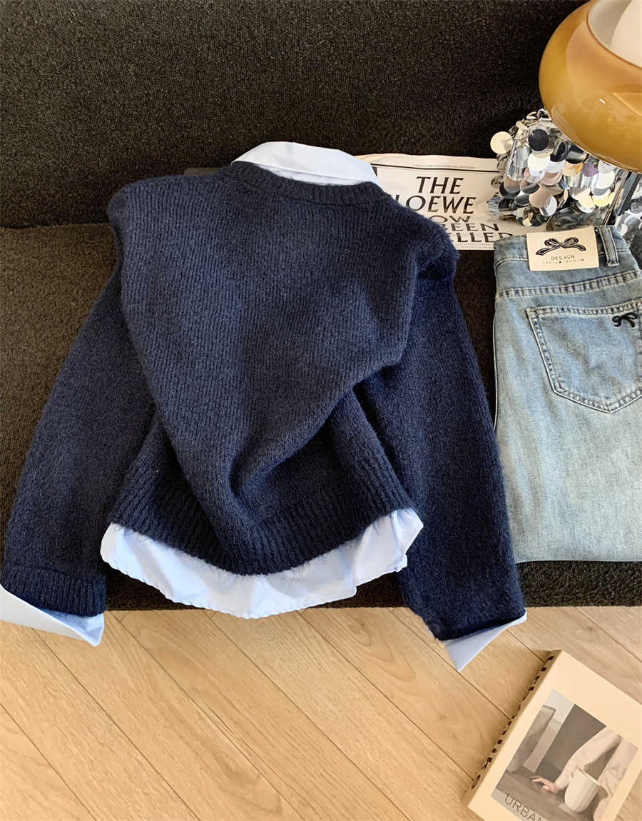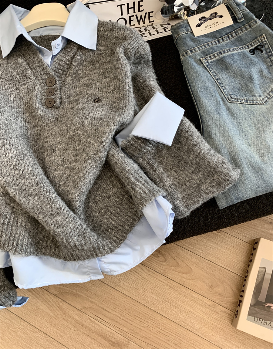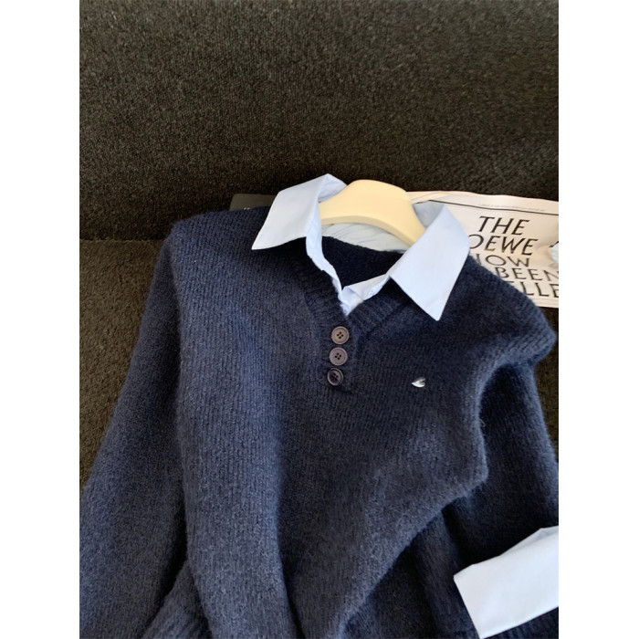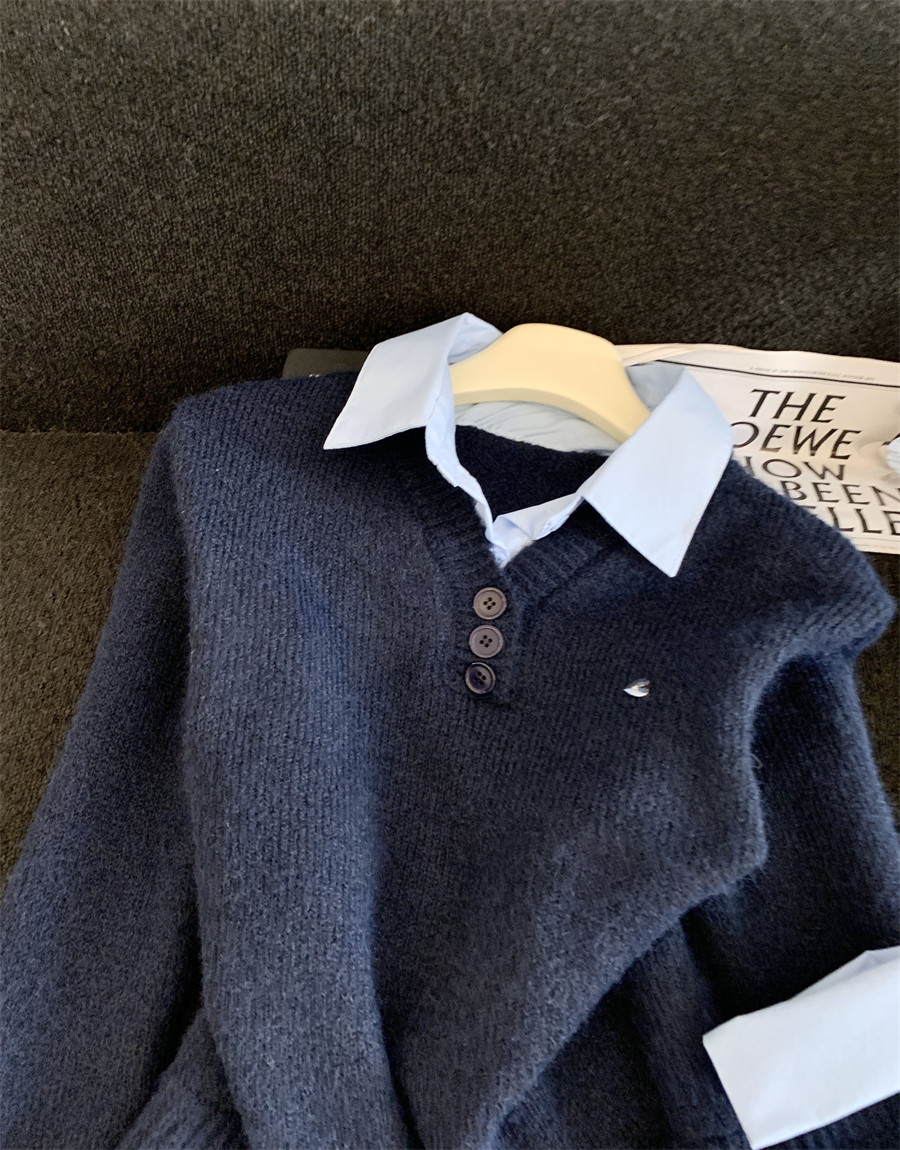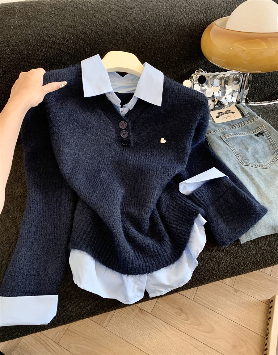 Jade Closet店推薦~美德拉甜美風翻領拼接長袖針織毛衣女秋冬