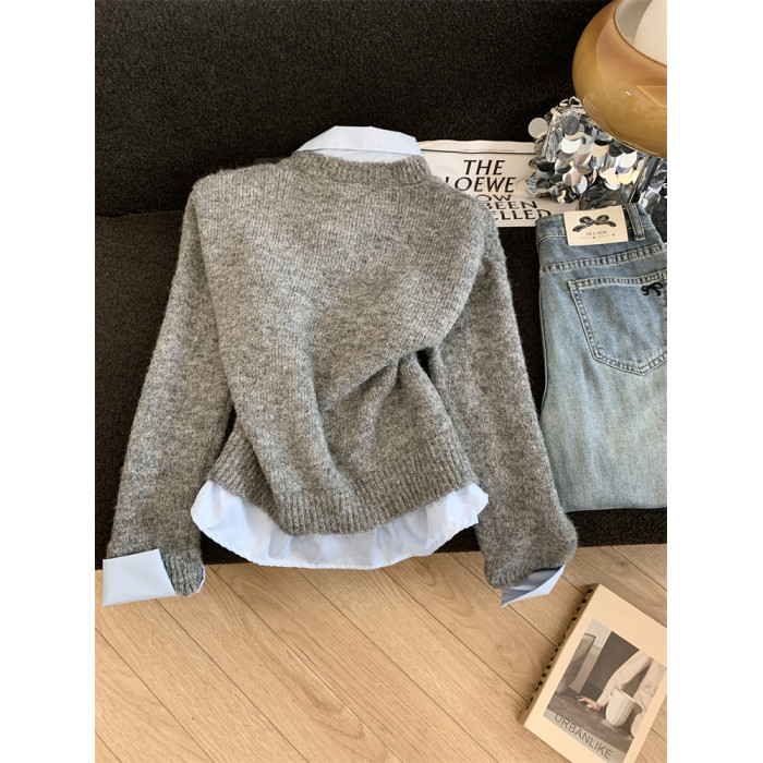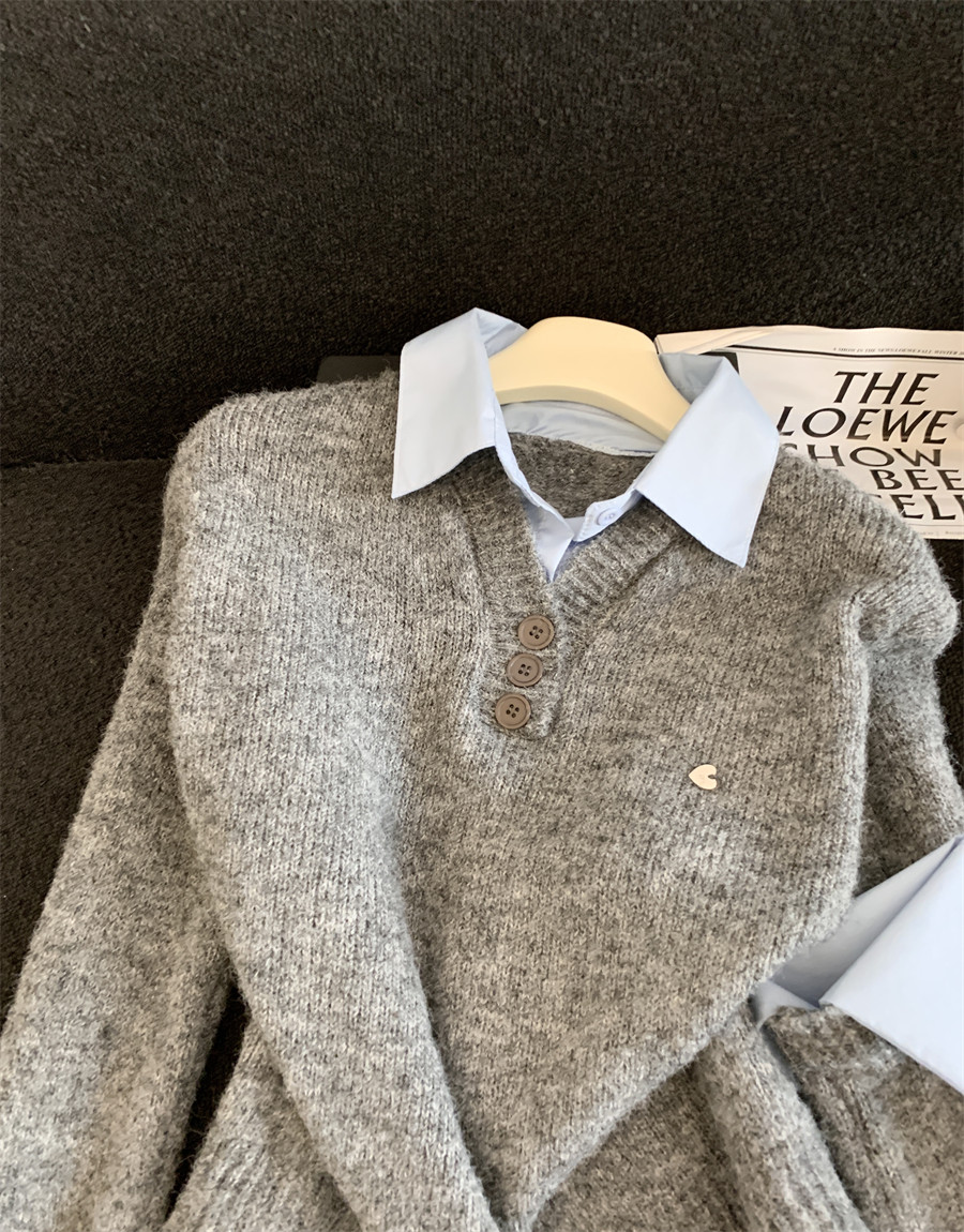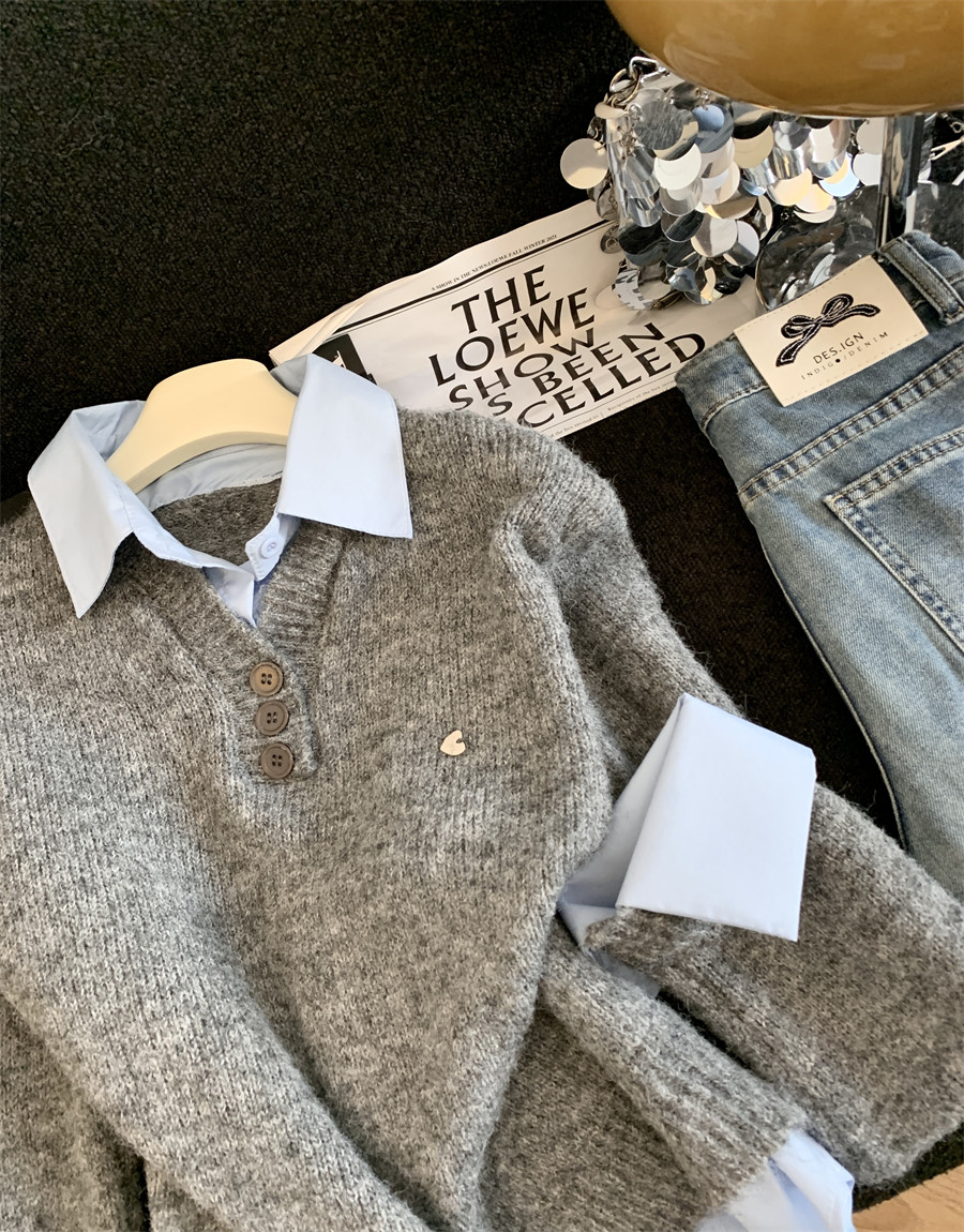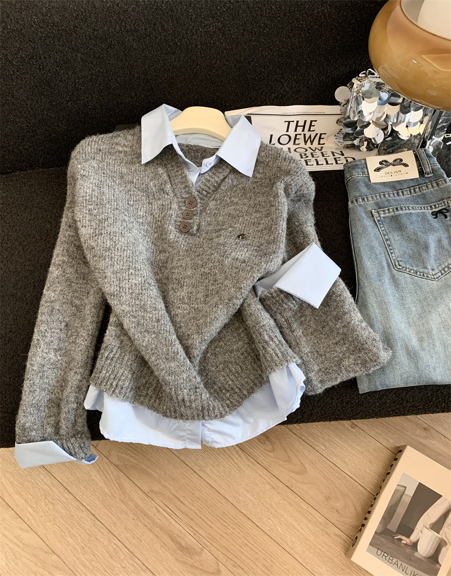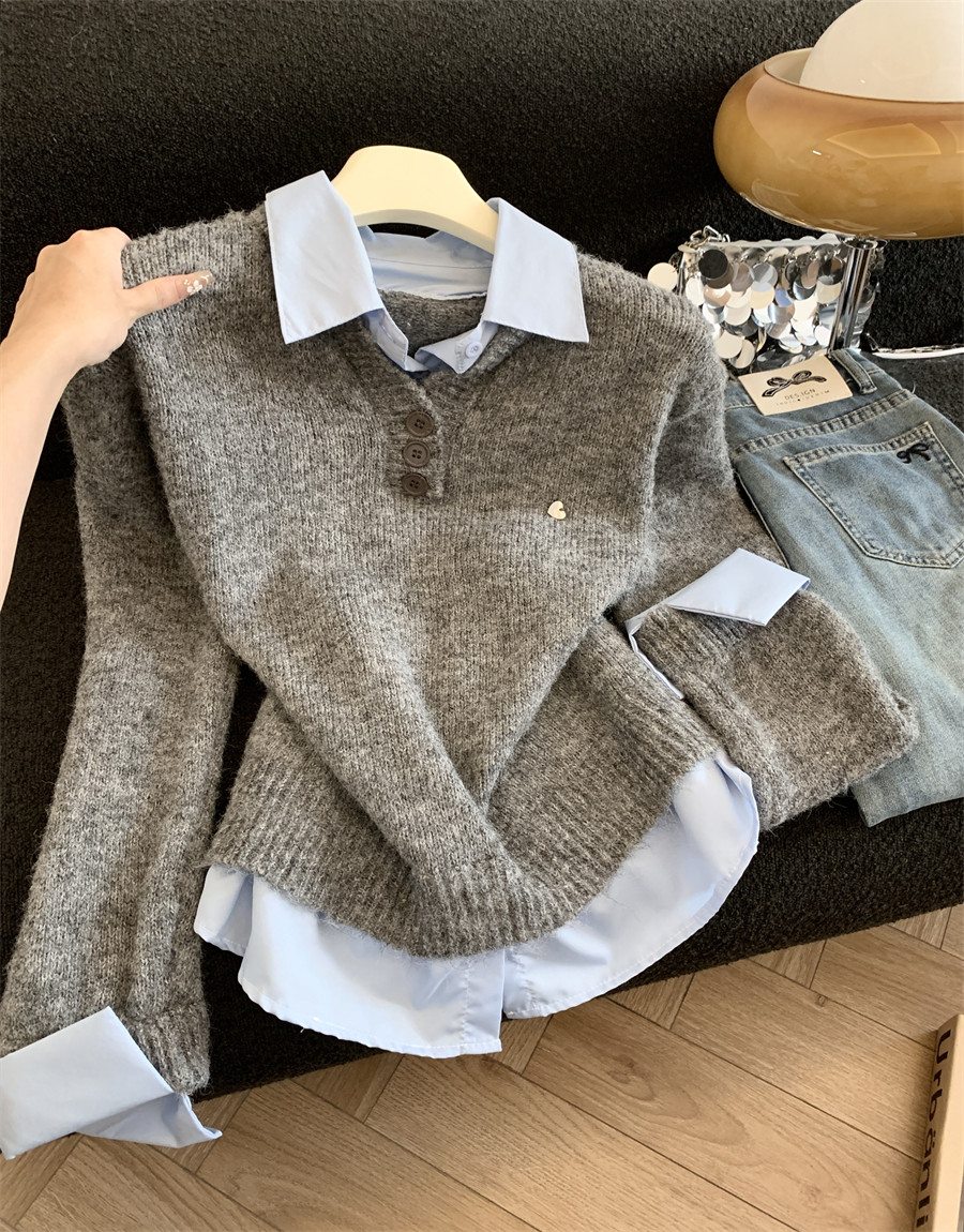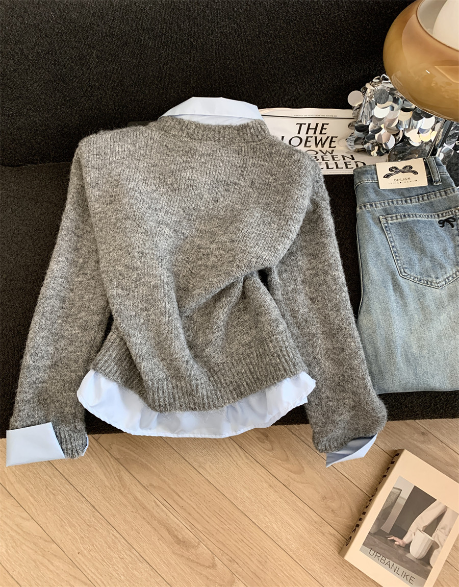 Jade Closet店推薦~美德拉甜美風翻領拼接長袖針織毛衣女秋冬