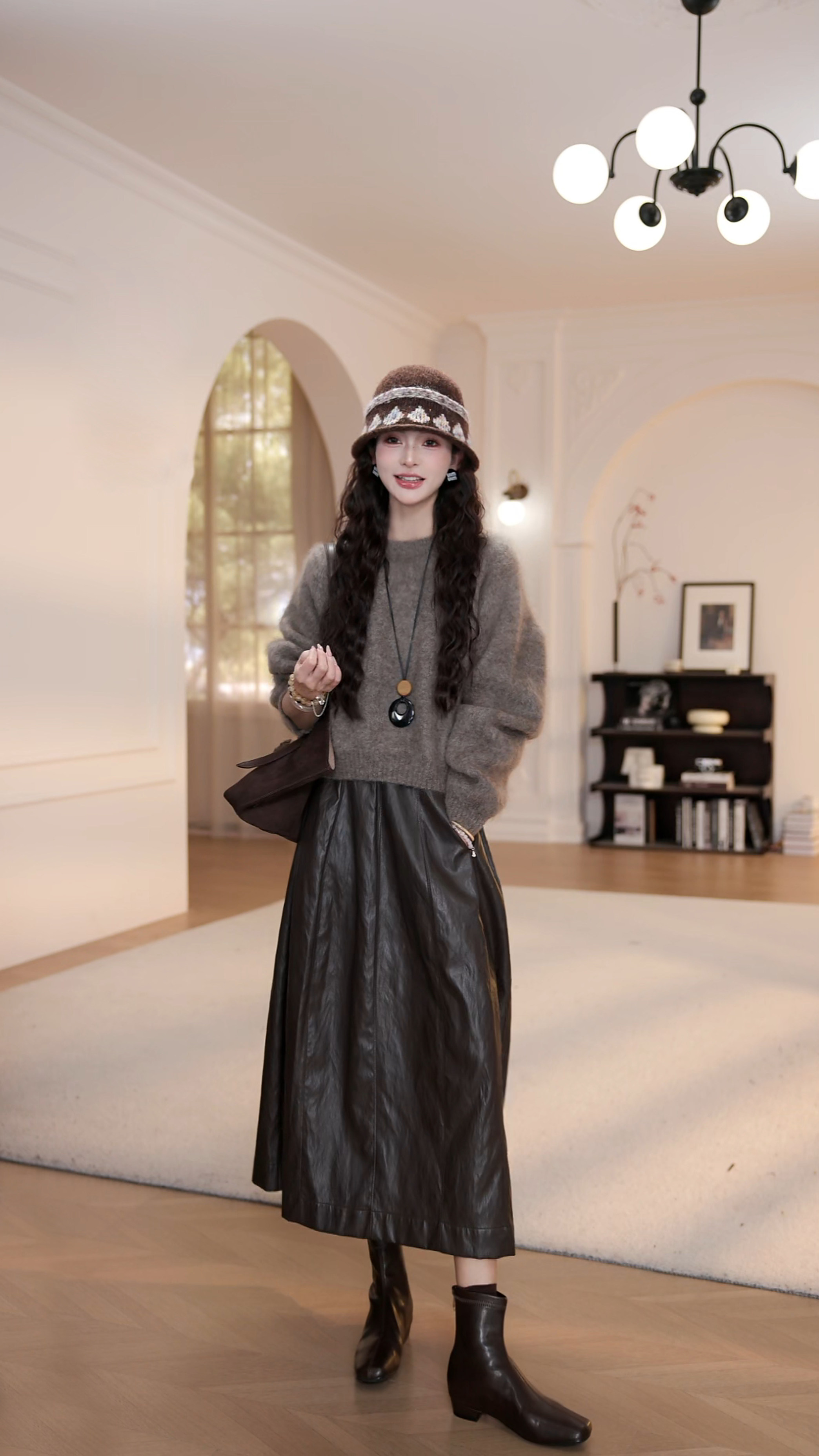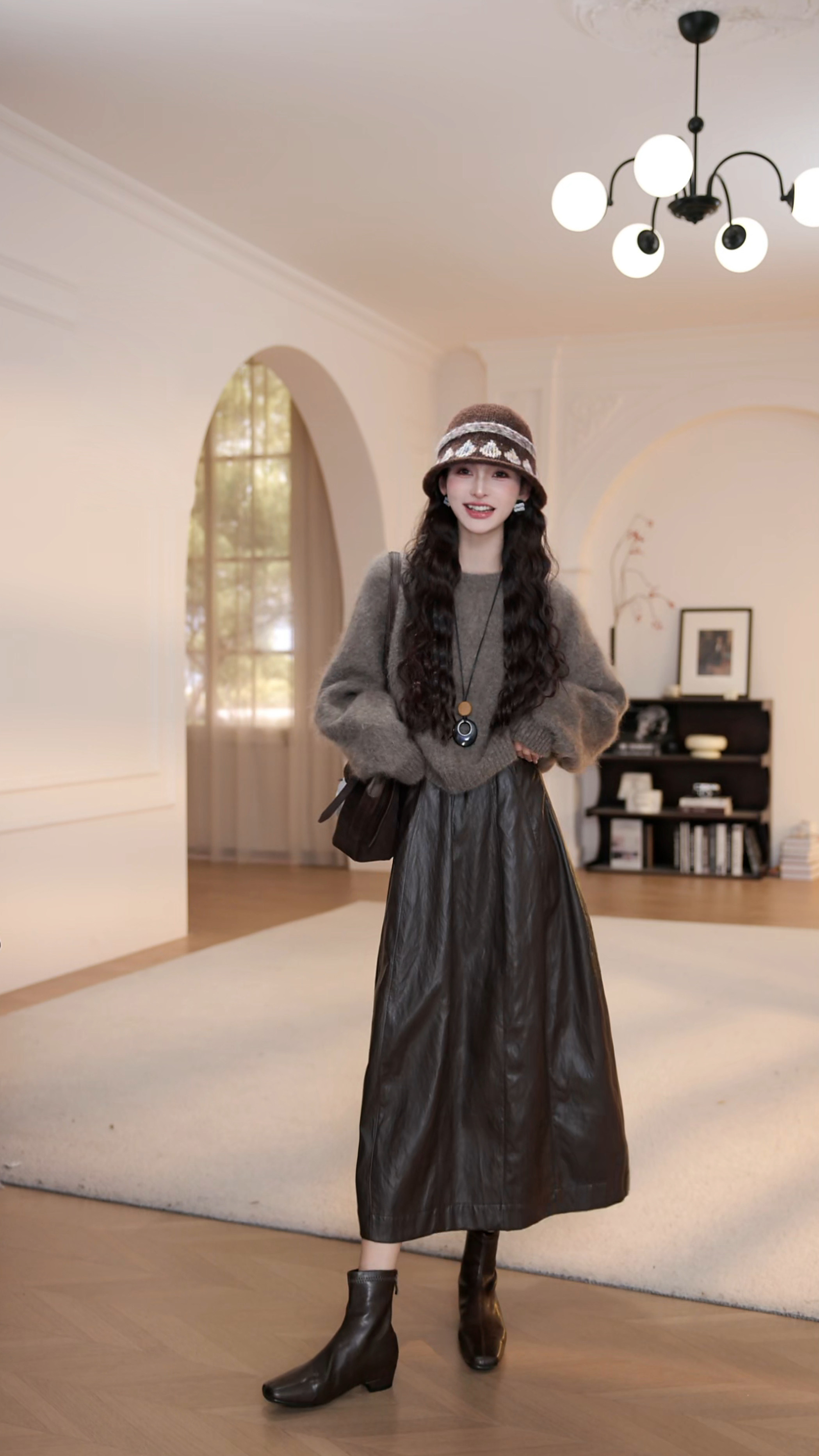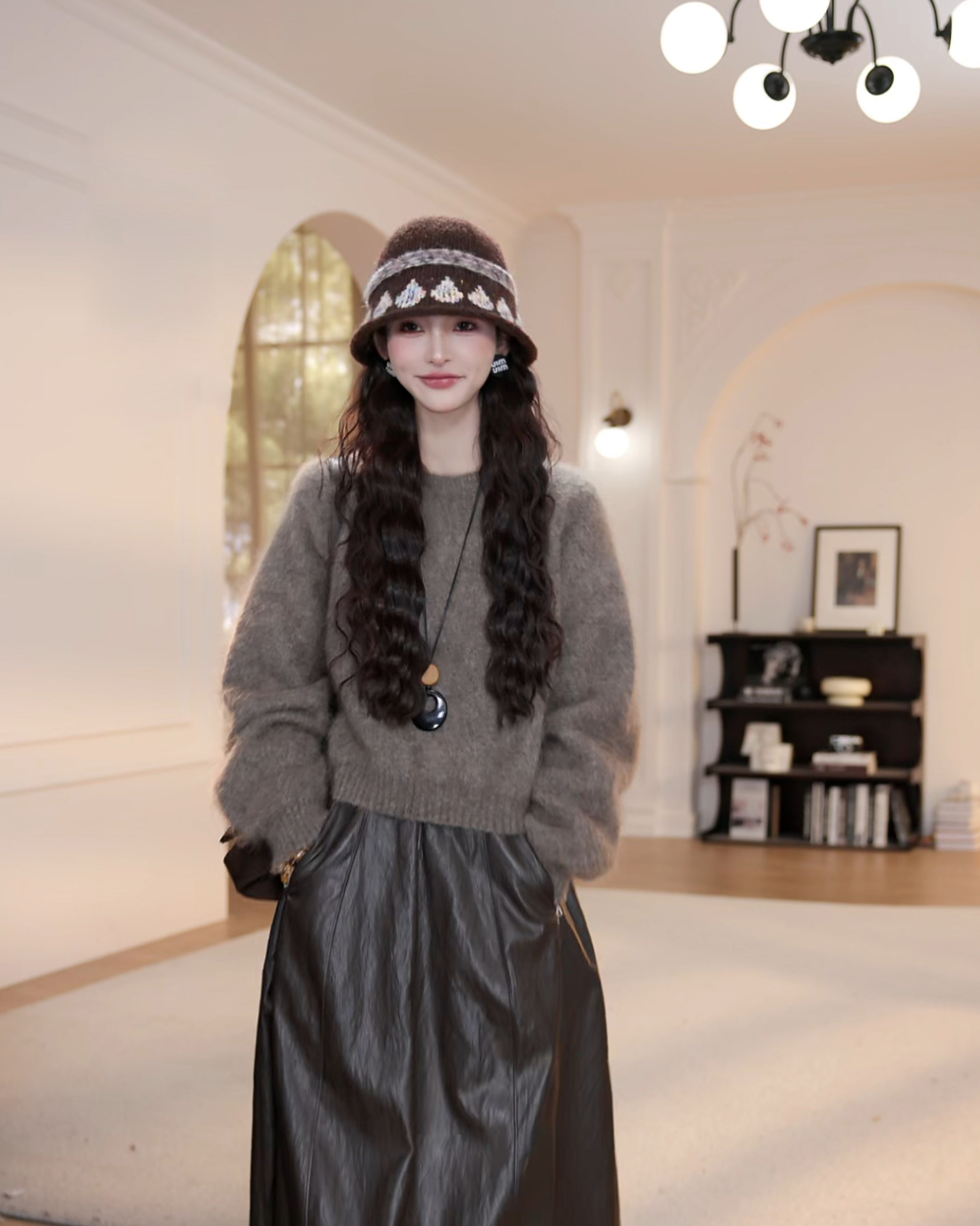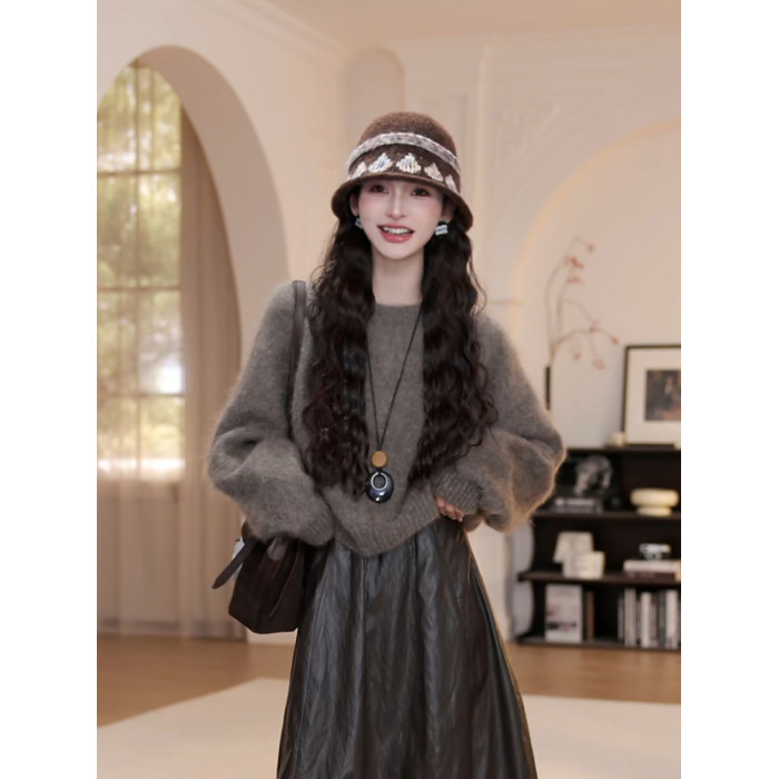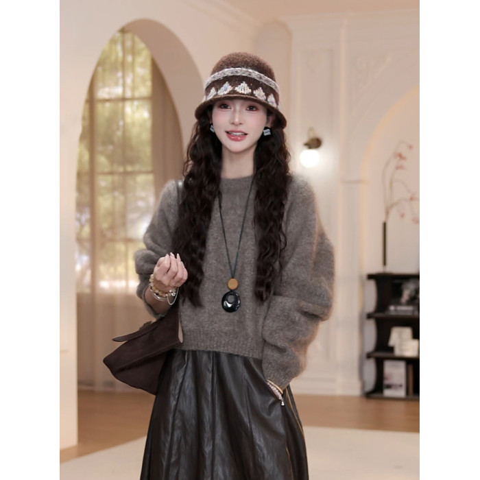 wYANYAN咖色圓領毛衣女秋季新款寬鬆顯瘦長袖慵嬾風衫8947