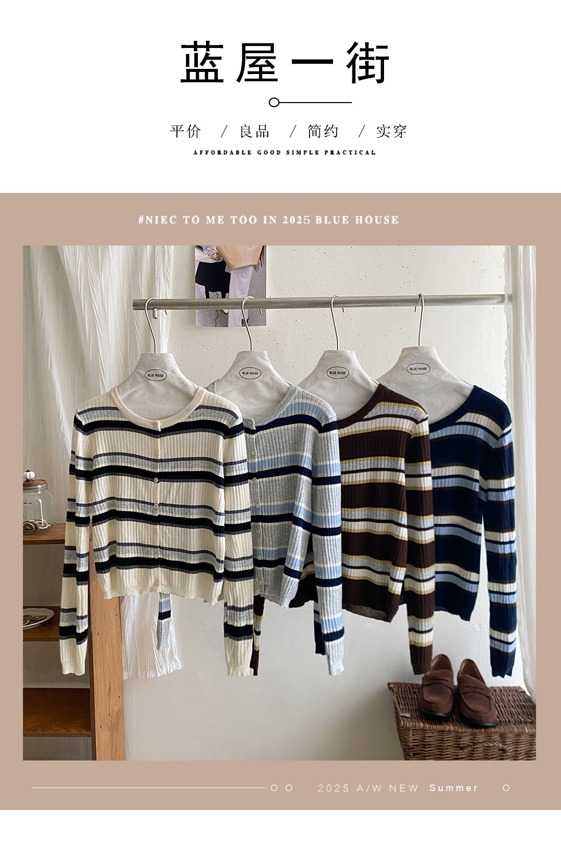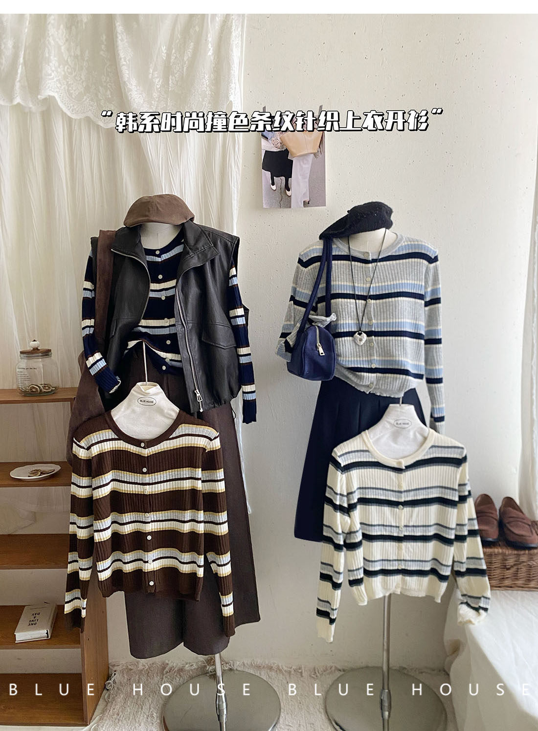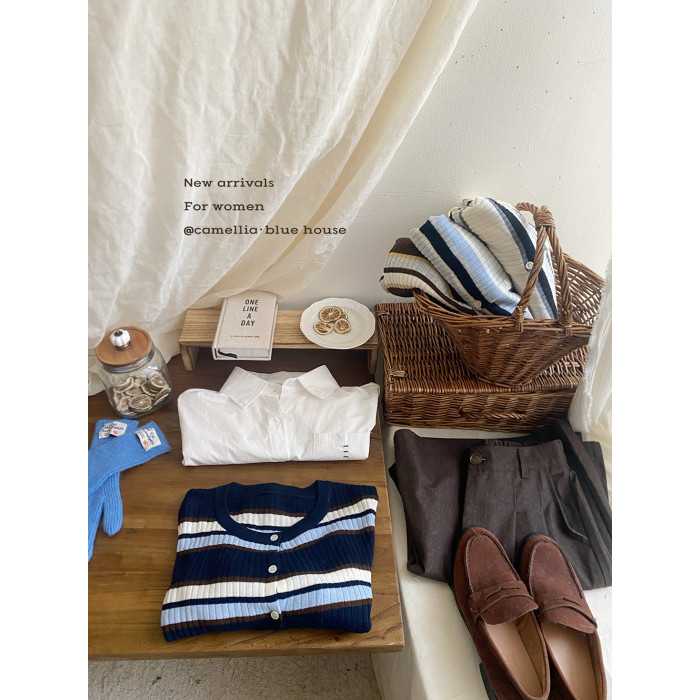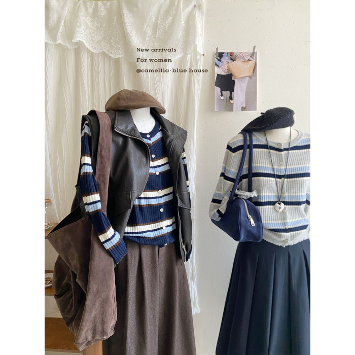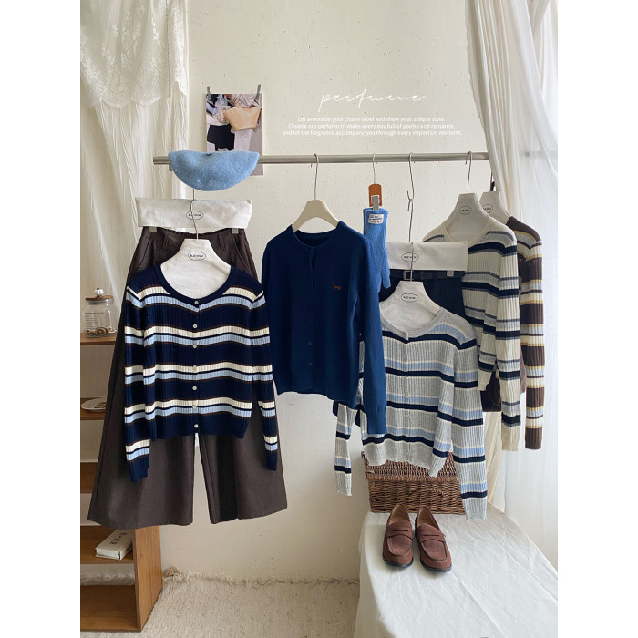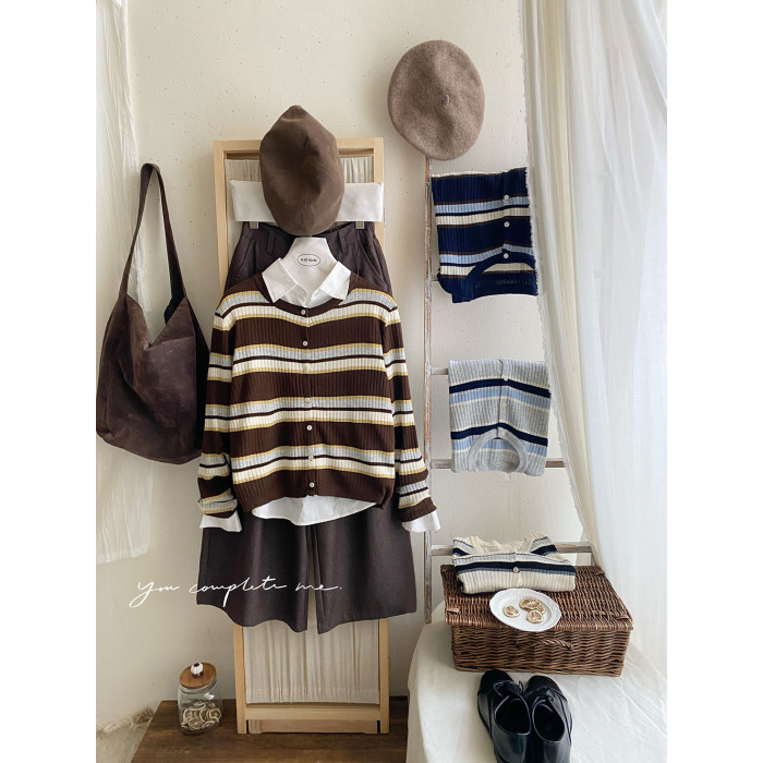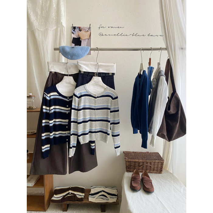 復古撞色條紋單排釦針織開衫女秋韓系圓領顯瘦氣質薄款小外套上衣