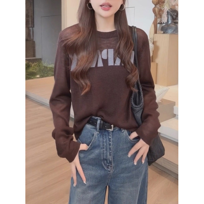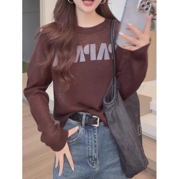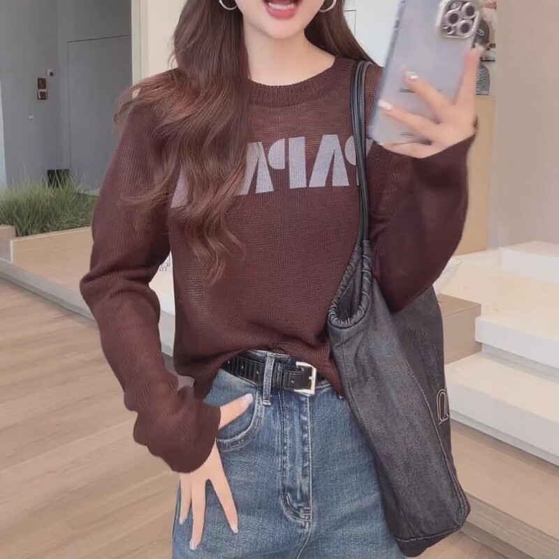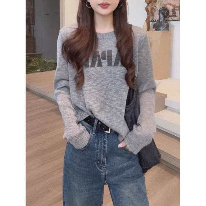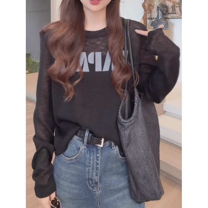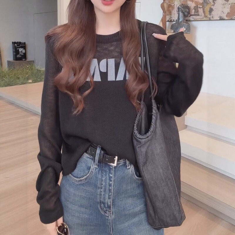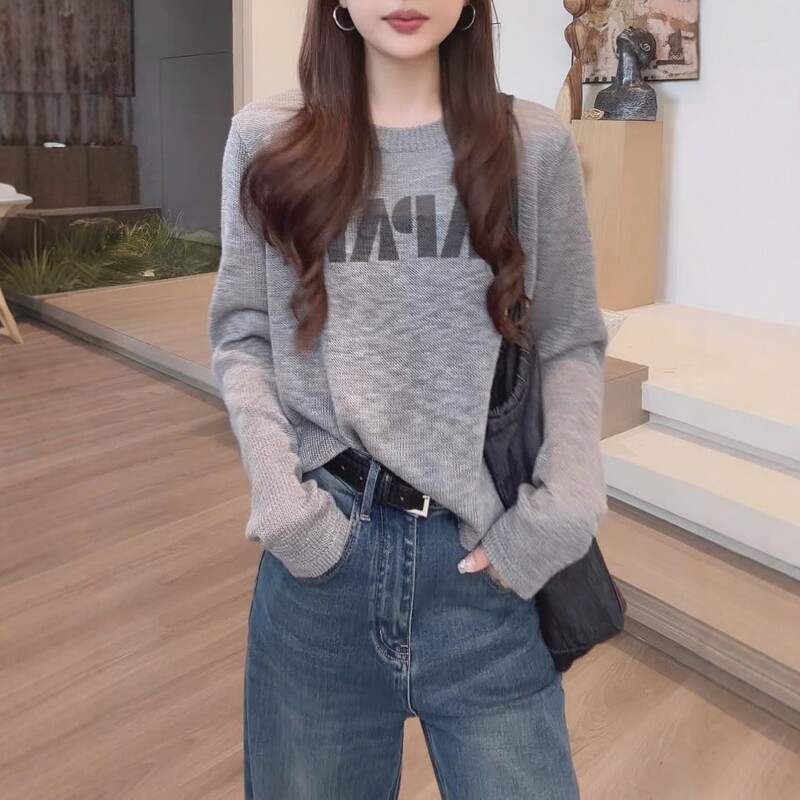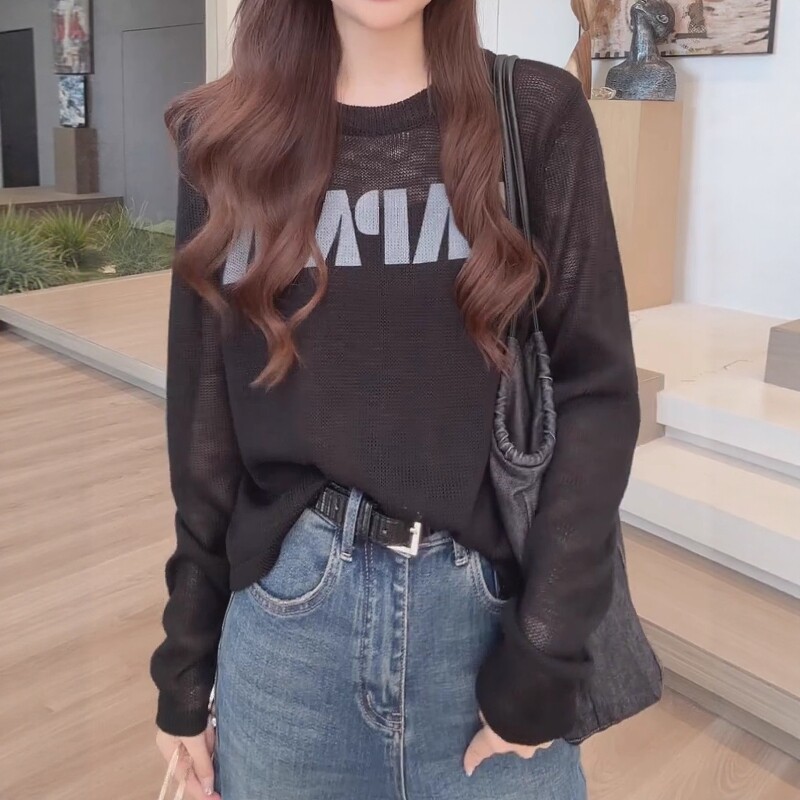 黑色字母印花長袖針織衫女大碼胖mm寬松百搭慵懶風顯瘦設計感上衣