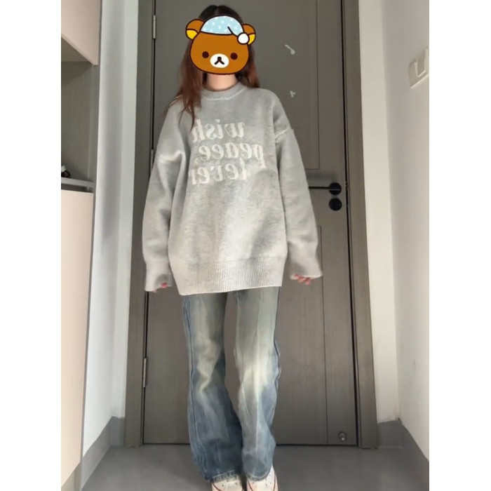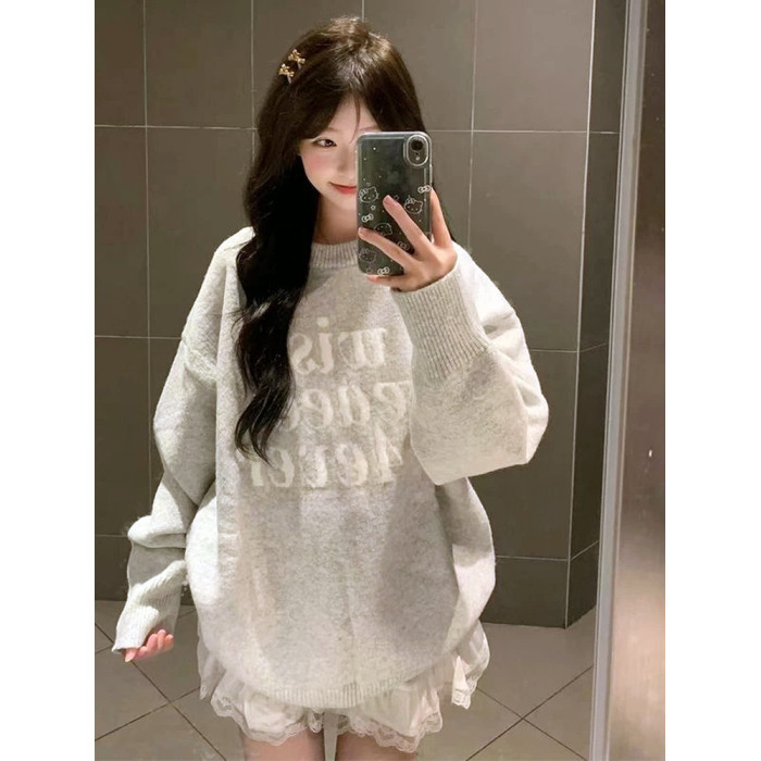 美式復古軟糯灰色字母毛衣女秋冬季寬松慵懶風oversize針織衫上衣