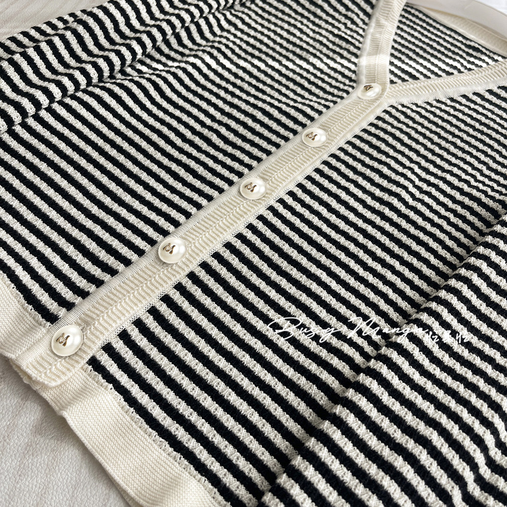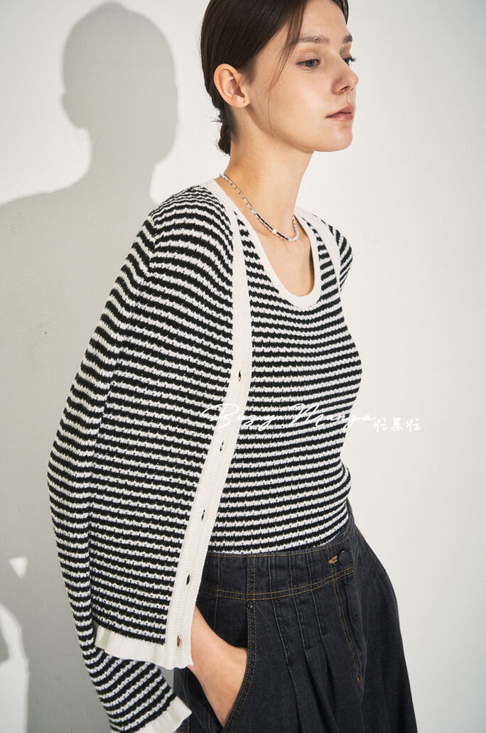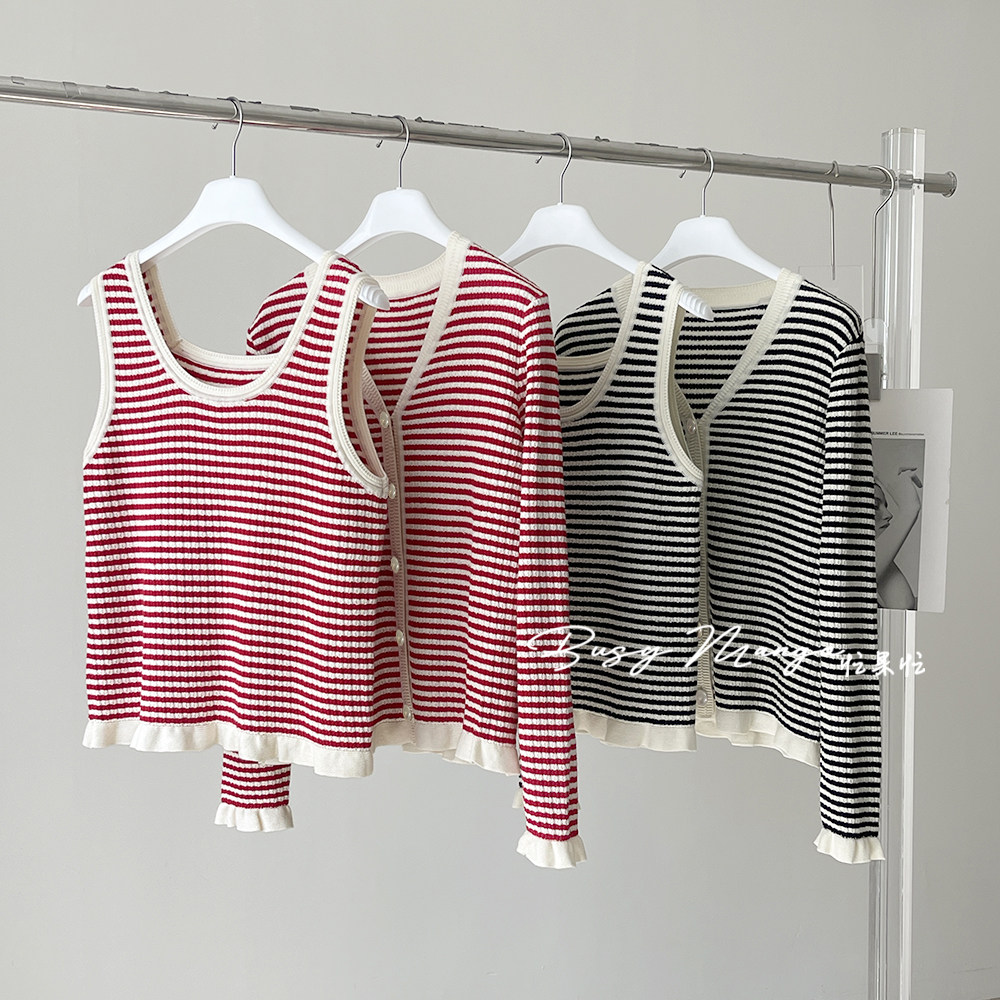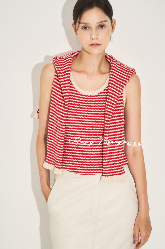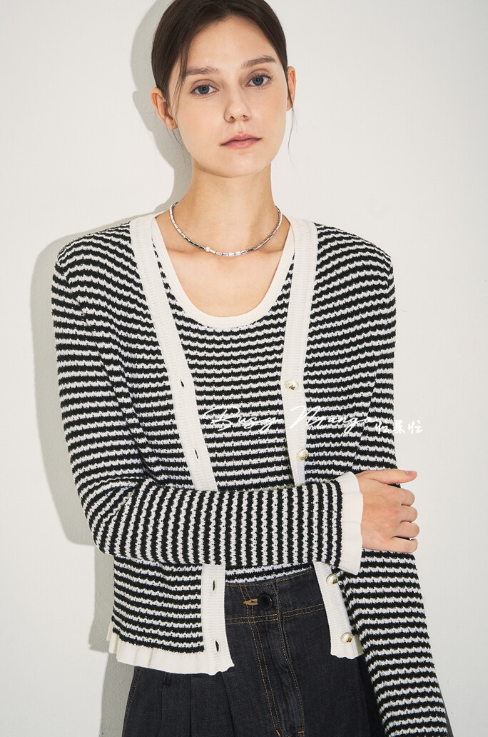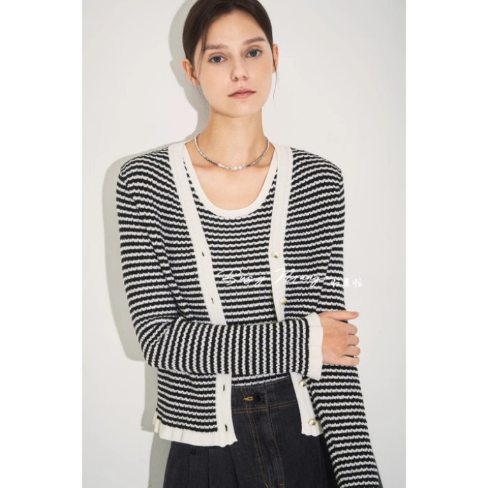 自畱款~主打款,兩件套哦~客供羊毛針織面料,9%羊毛+46%人造絲,松軟的立體針織織面,彈力大,柔軟舒適,貼身也不紥肉,經典的橫條紋配色,仿珍珠紐釦,背心和開衫的搭配,任何造型都可以wan美兼顧,休閒或通勤都可以哦!