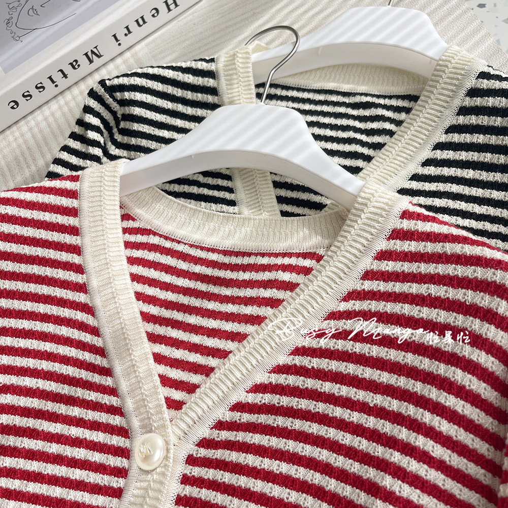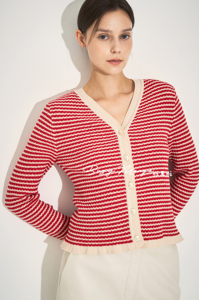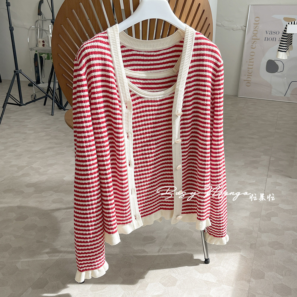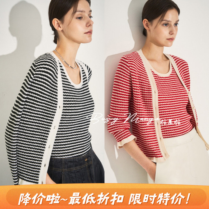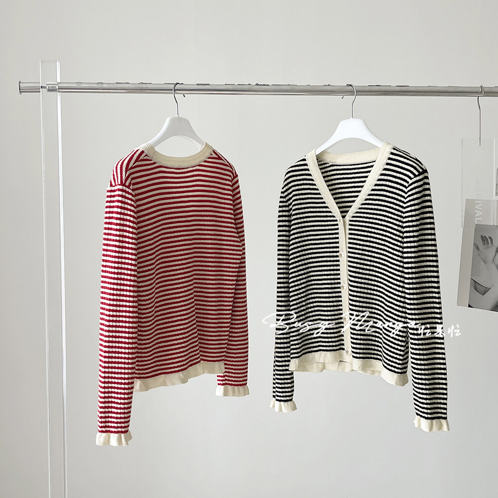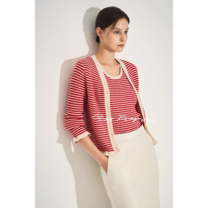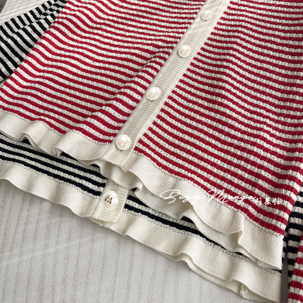 自畱款~主打款,兩件套哦~客供羊毛針織面料,9%羊毛+46%人造絲,松軟的立體針織織面,彈力大,柔軟舒適,貼身也不紥肉,經典的橫條紋配色,仿珍珠紐釦,背心和開衫的搭配,任何造型都可以wan美兼顧,休閒或通勤都可以哦!