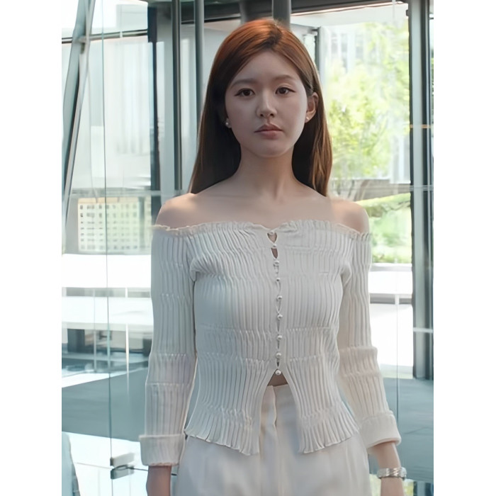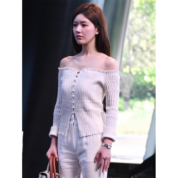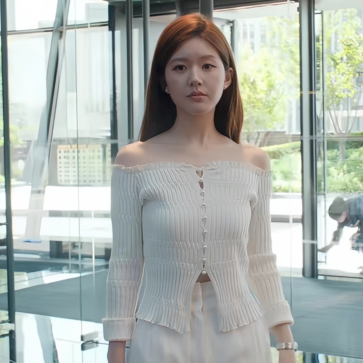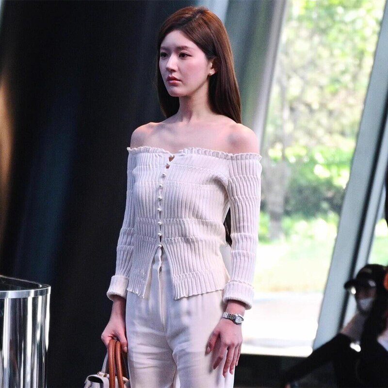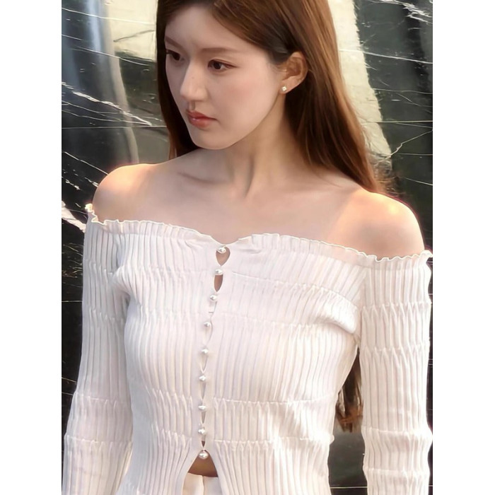 許我耀眼趙露思許妍同款白色一字肩針織衫女早秋修身露鎖骨感上衣
