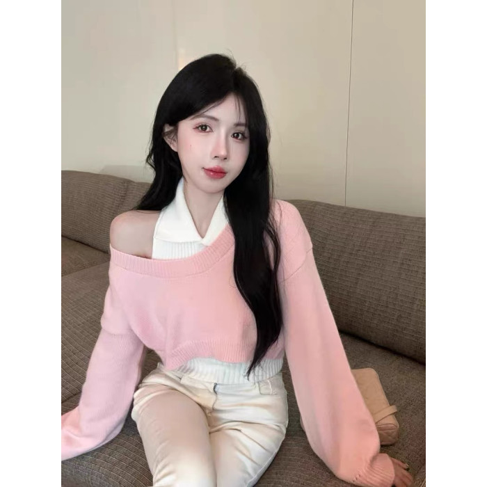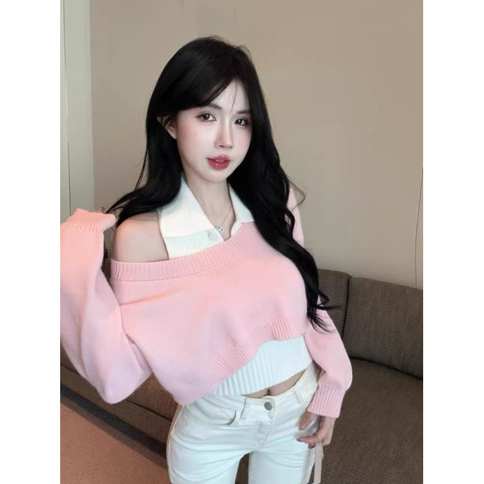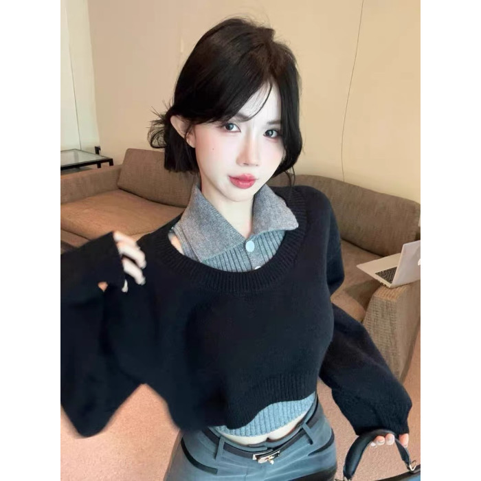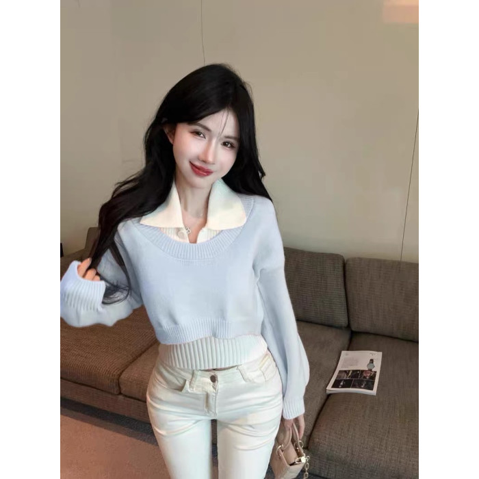 學院風polo領毛衣女秋季新款短款針織兩件套裝慵懶翻領小個子上衣