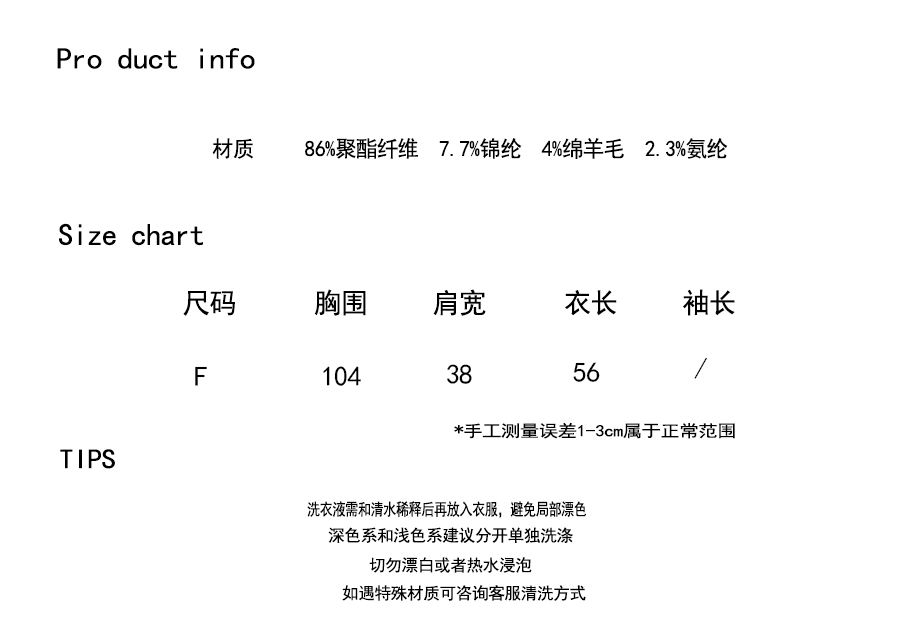 | 材質成分 | 聚對苯二甲酸乙二酯(滌綸)86% 聚醯胺纖維(錦綸)7.7% 綿羊毛4% 聚氨酯彈性纖維(氨綸)2.3% |