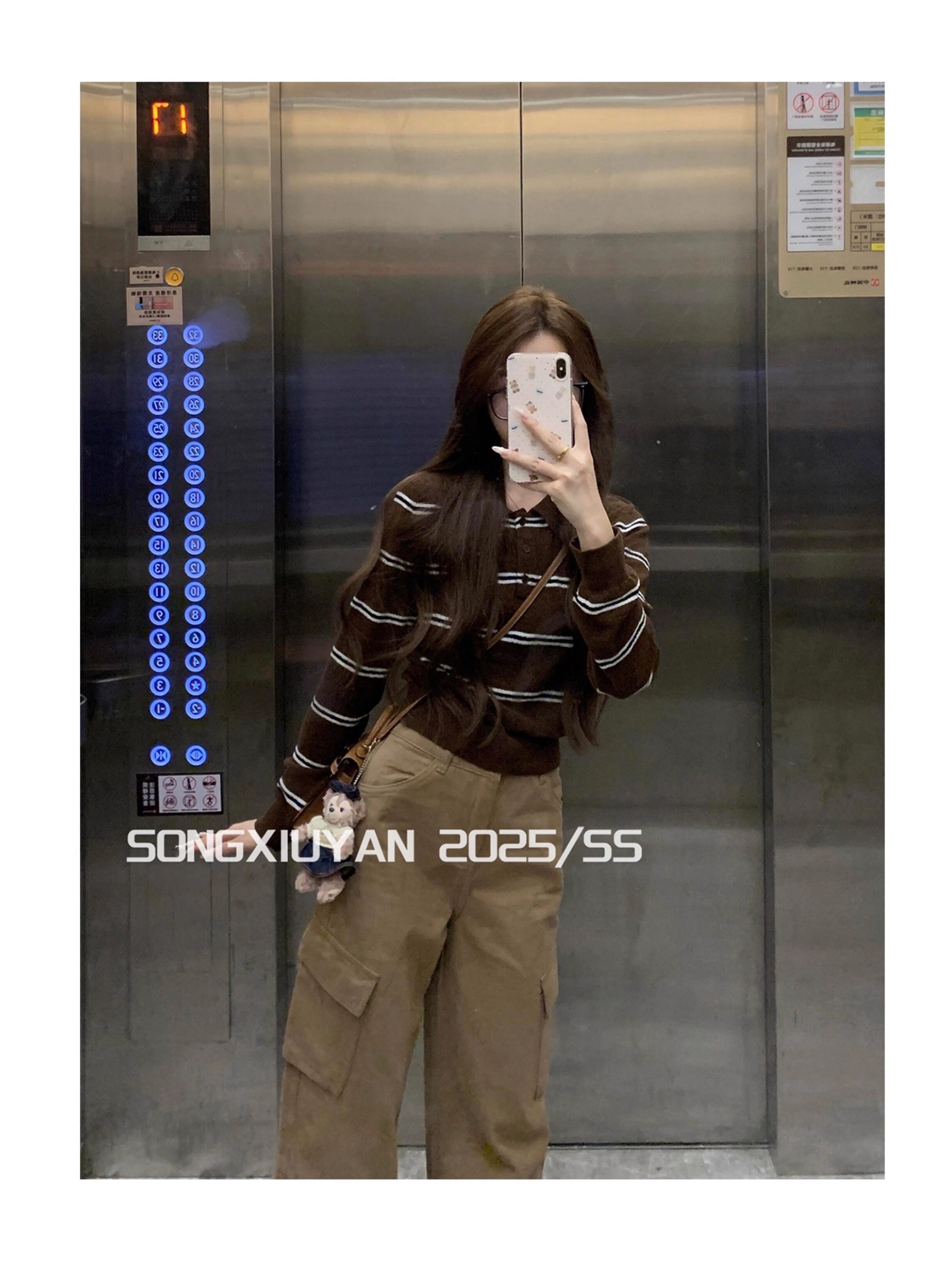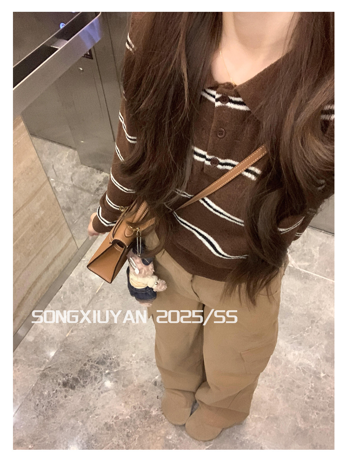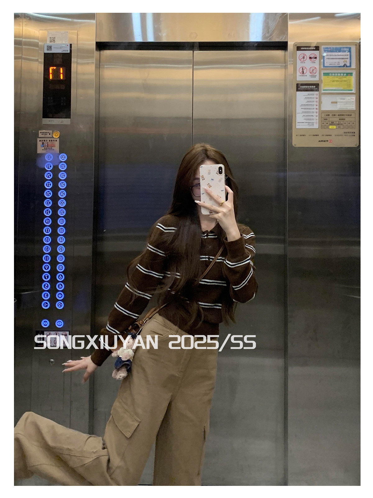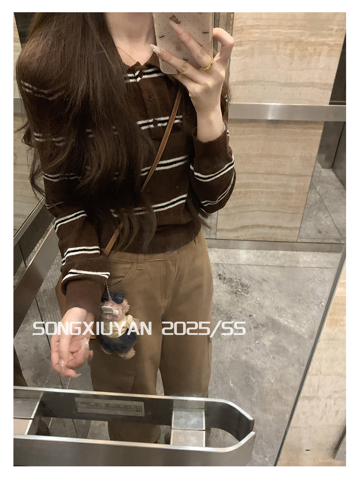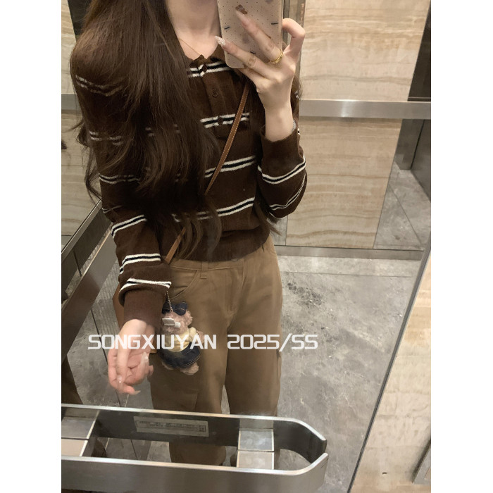 宋秀妍 SENIORS韓系學院風棕色條紋針織polo衫慵懶風長袖短款上衣