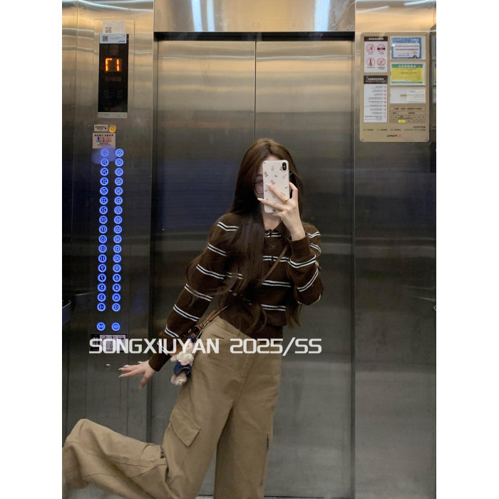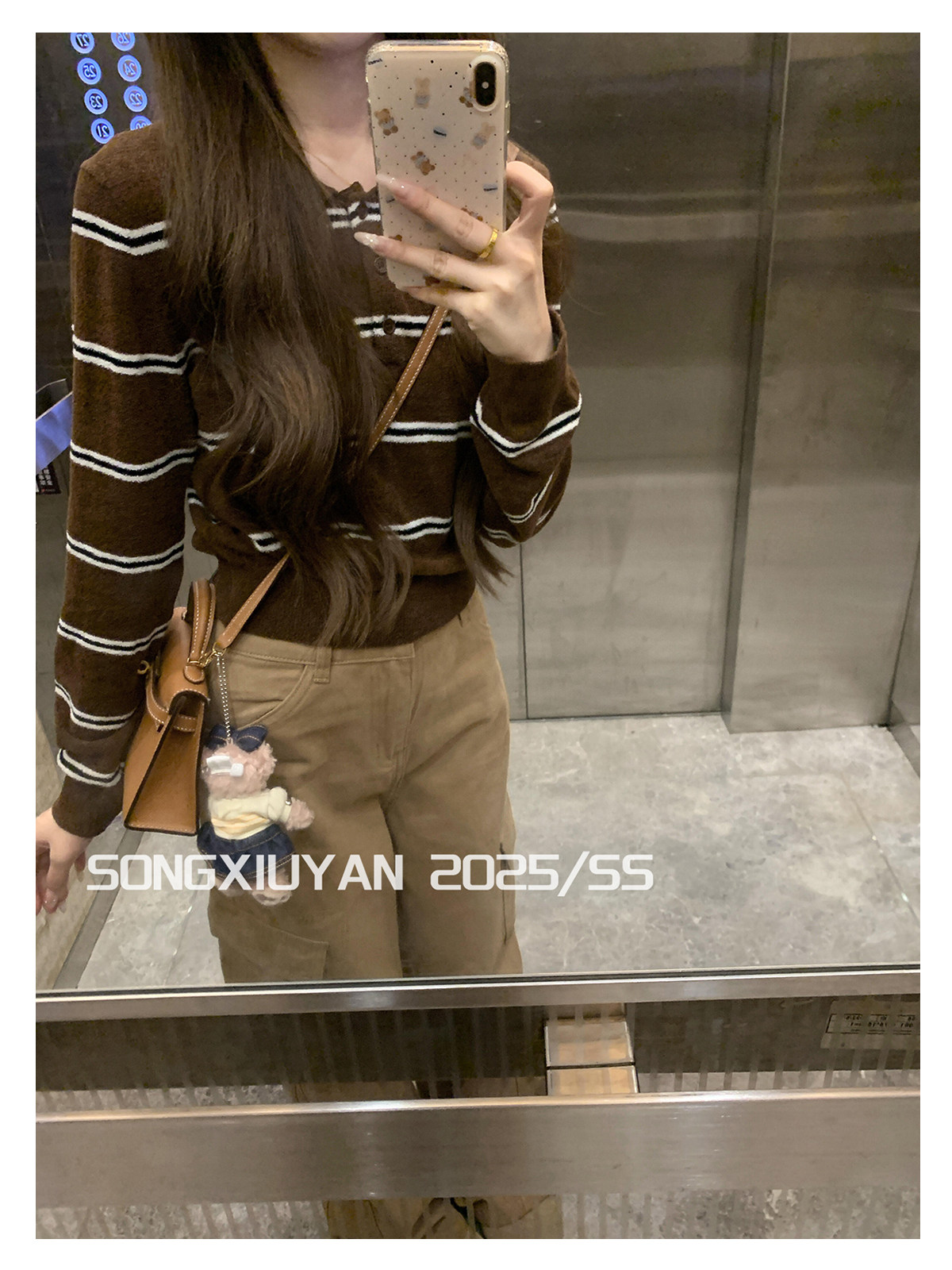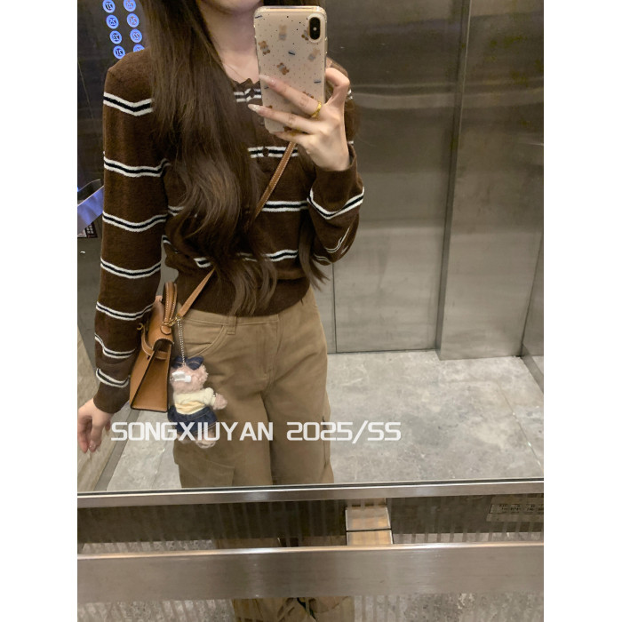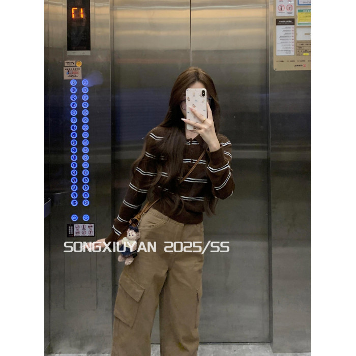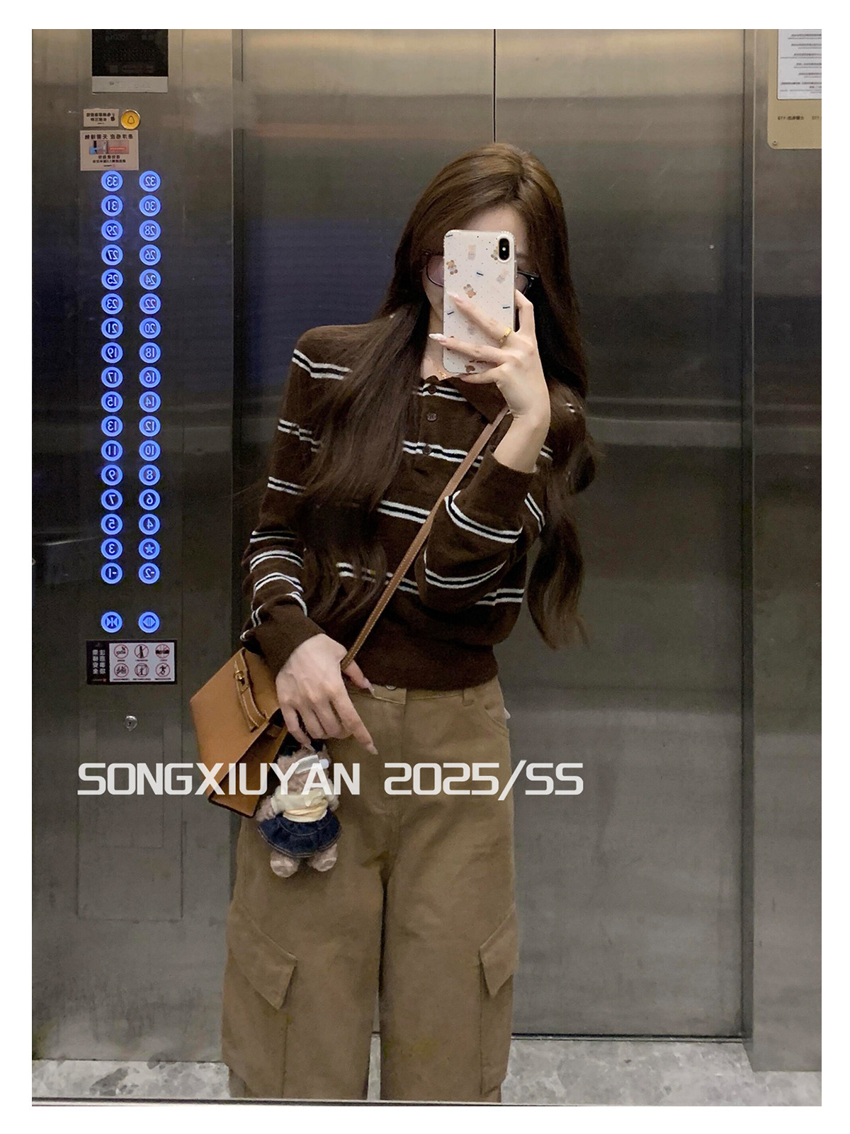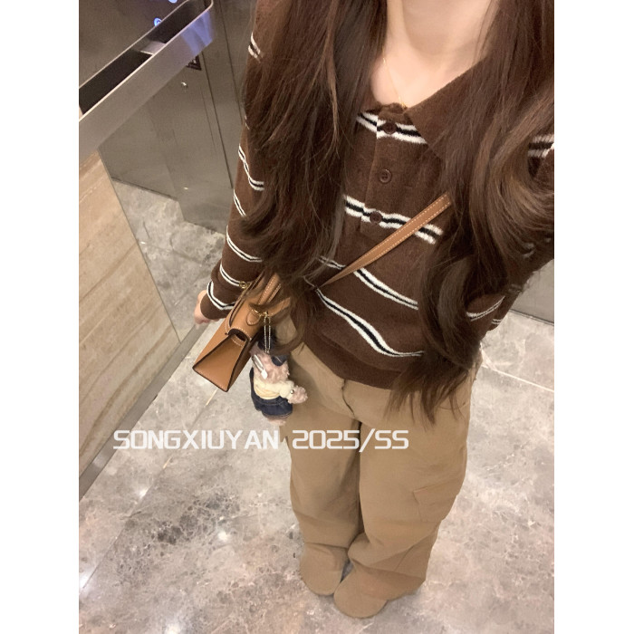 宋秀妍 SENIORS韓系學院風棕色條紋針織polo衫慵懶風長袖短款上衣