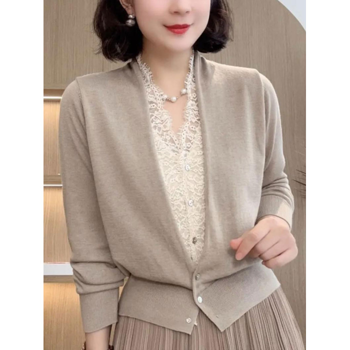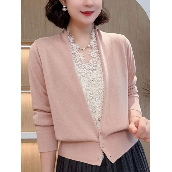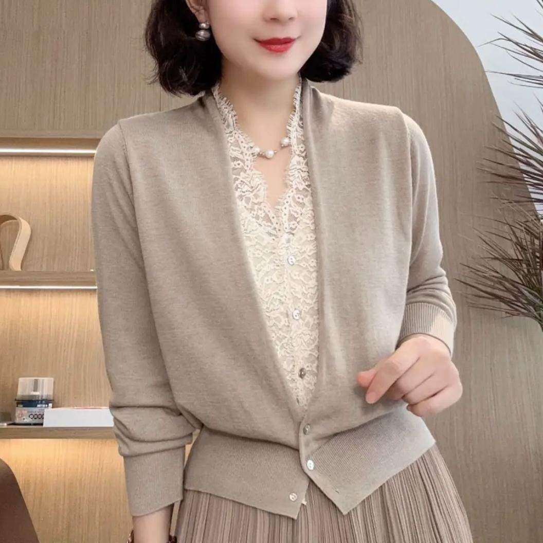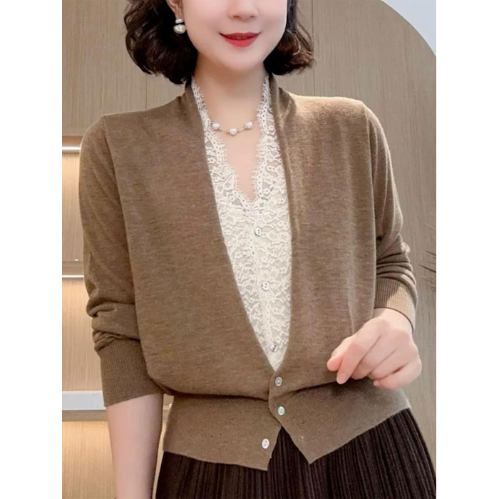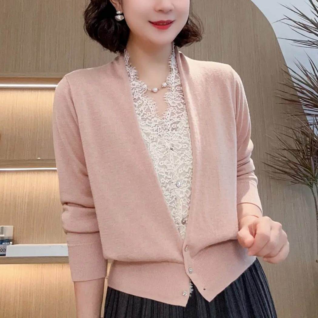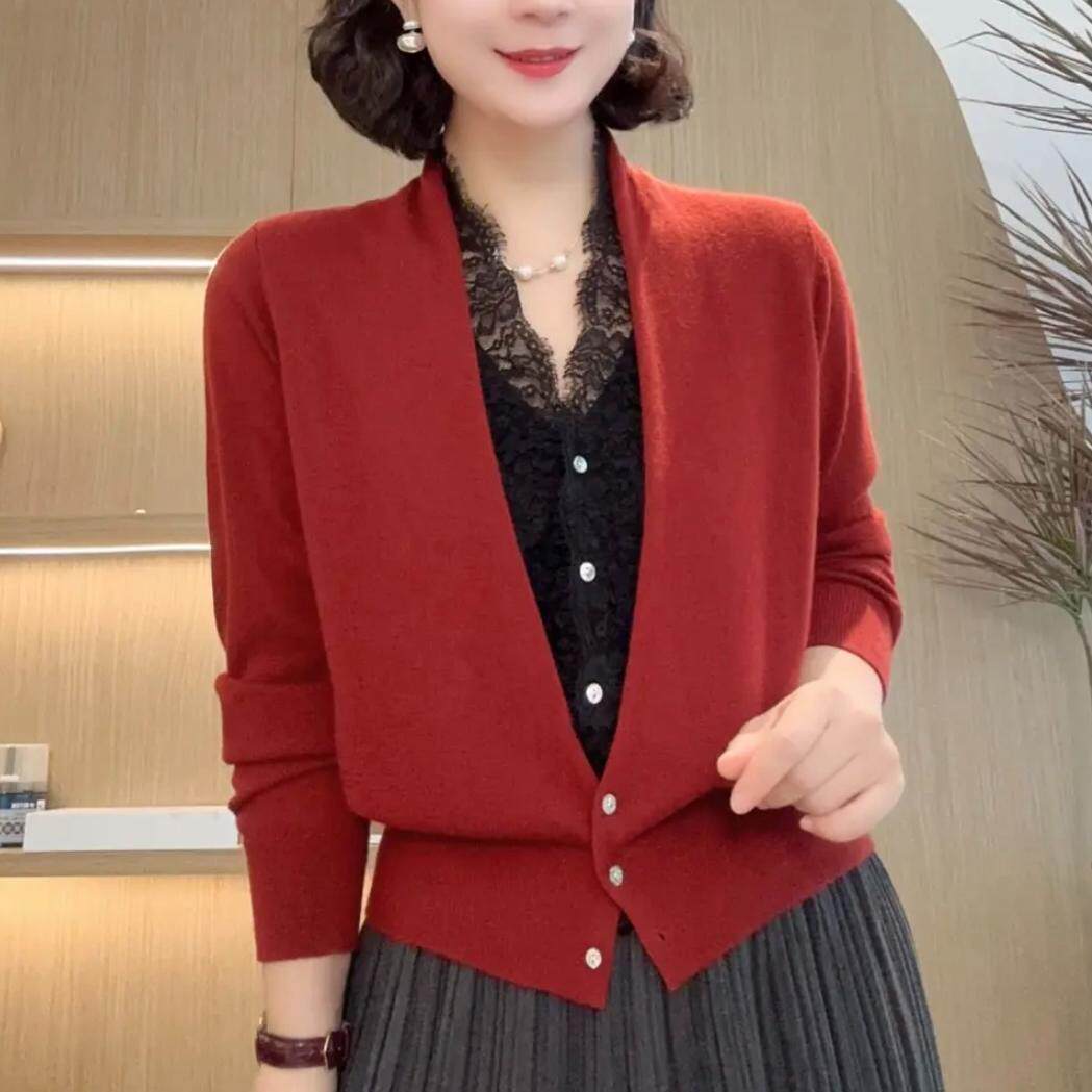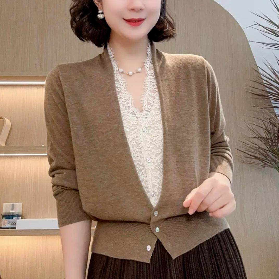 2025秋季新款時尚洋氣媽媽裝假兩件蕾絲拼接針織衫女寬松顯瘦上衣