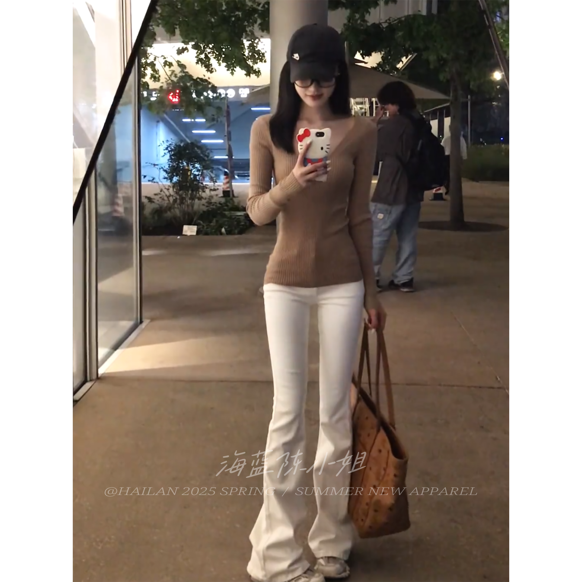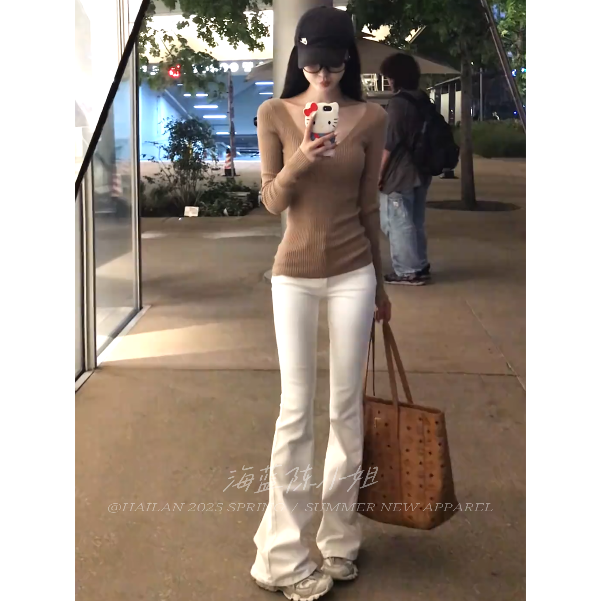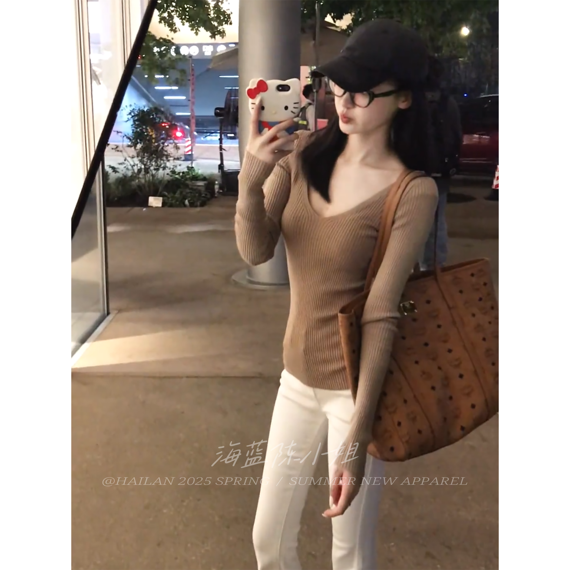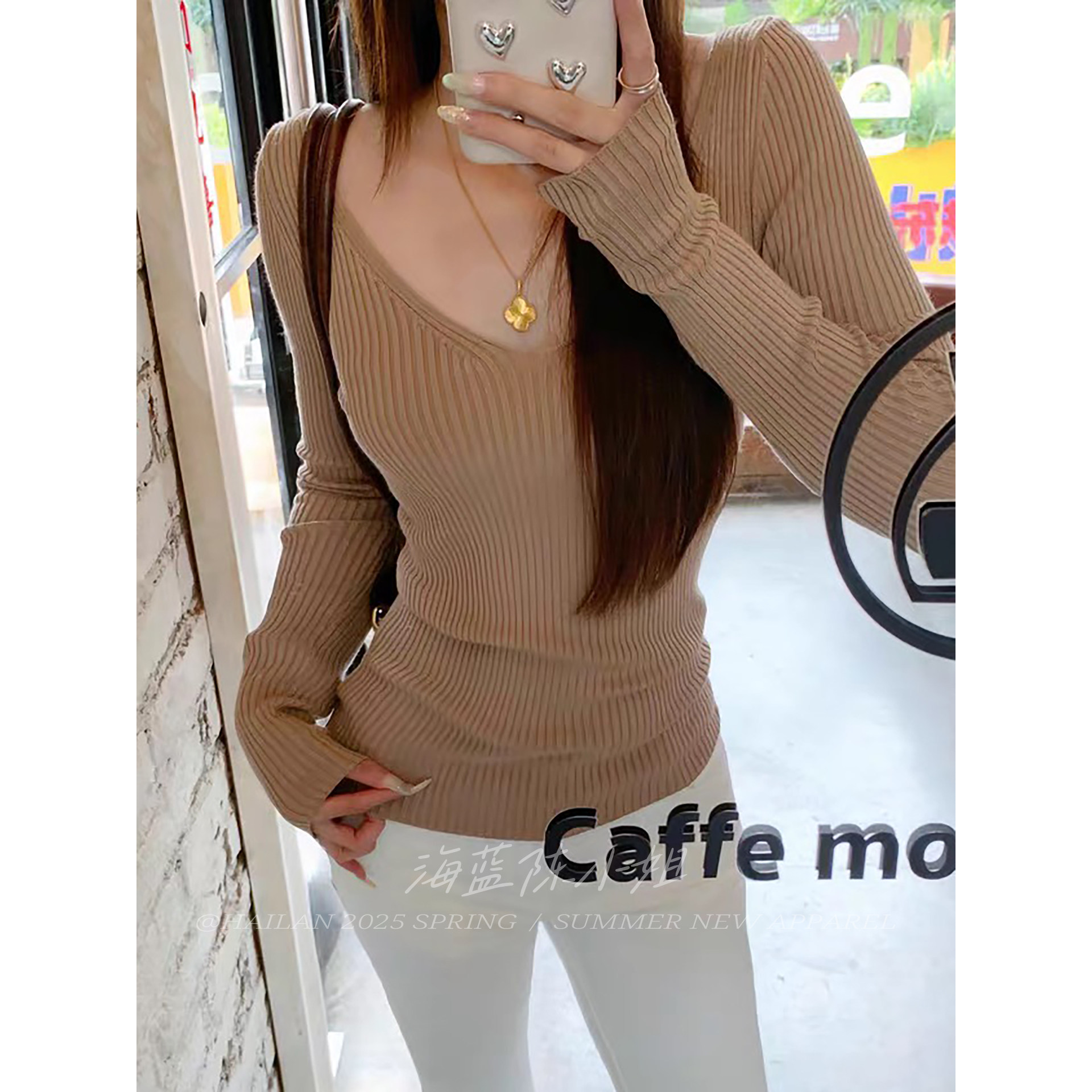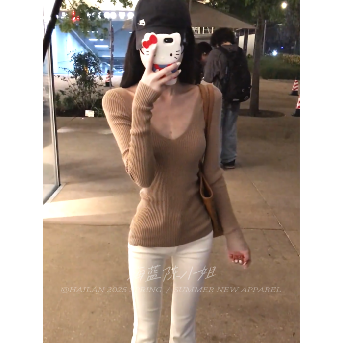 秋季新款溫柔風卡其色V領長袖針織衫女修身顯瘦高級感打底衫上衣