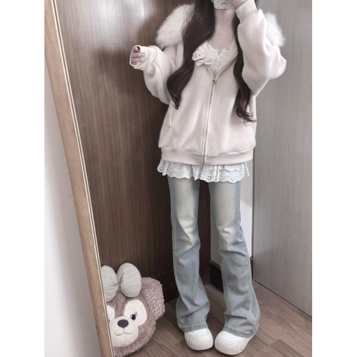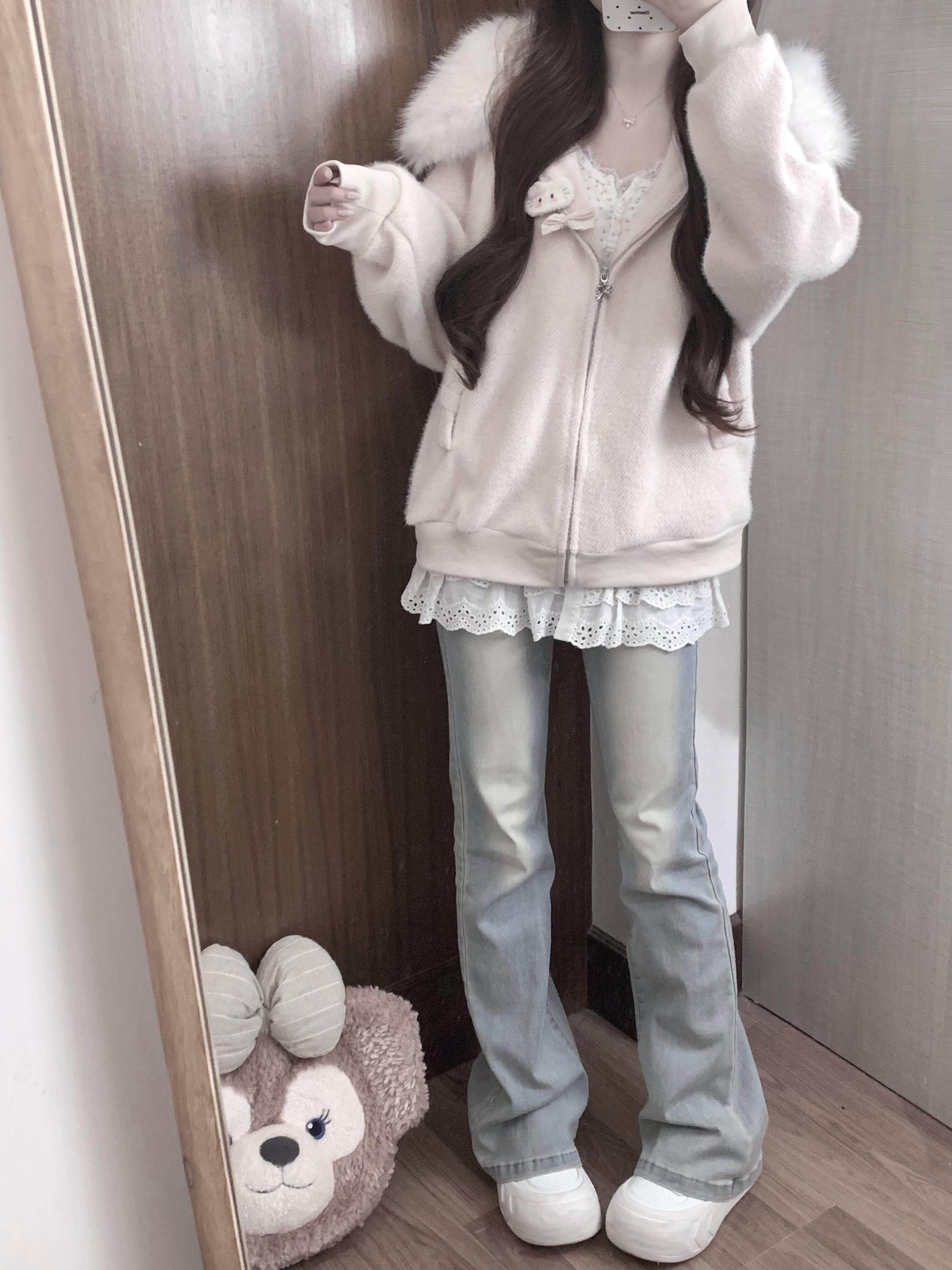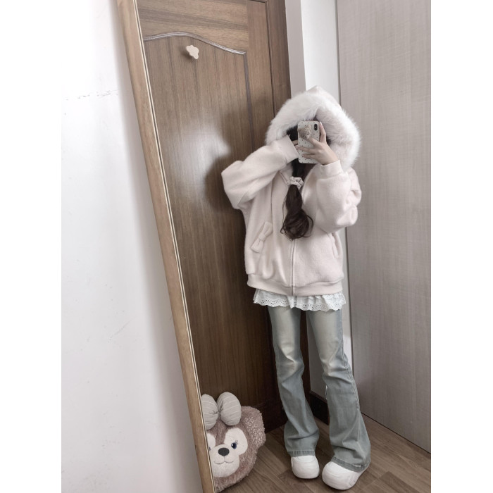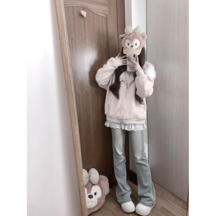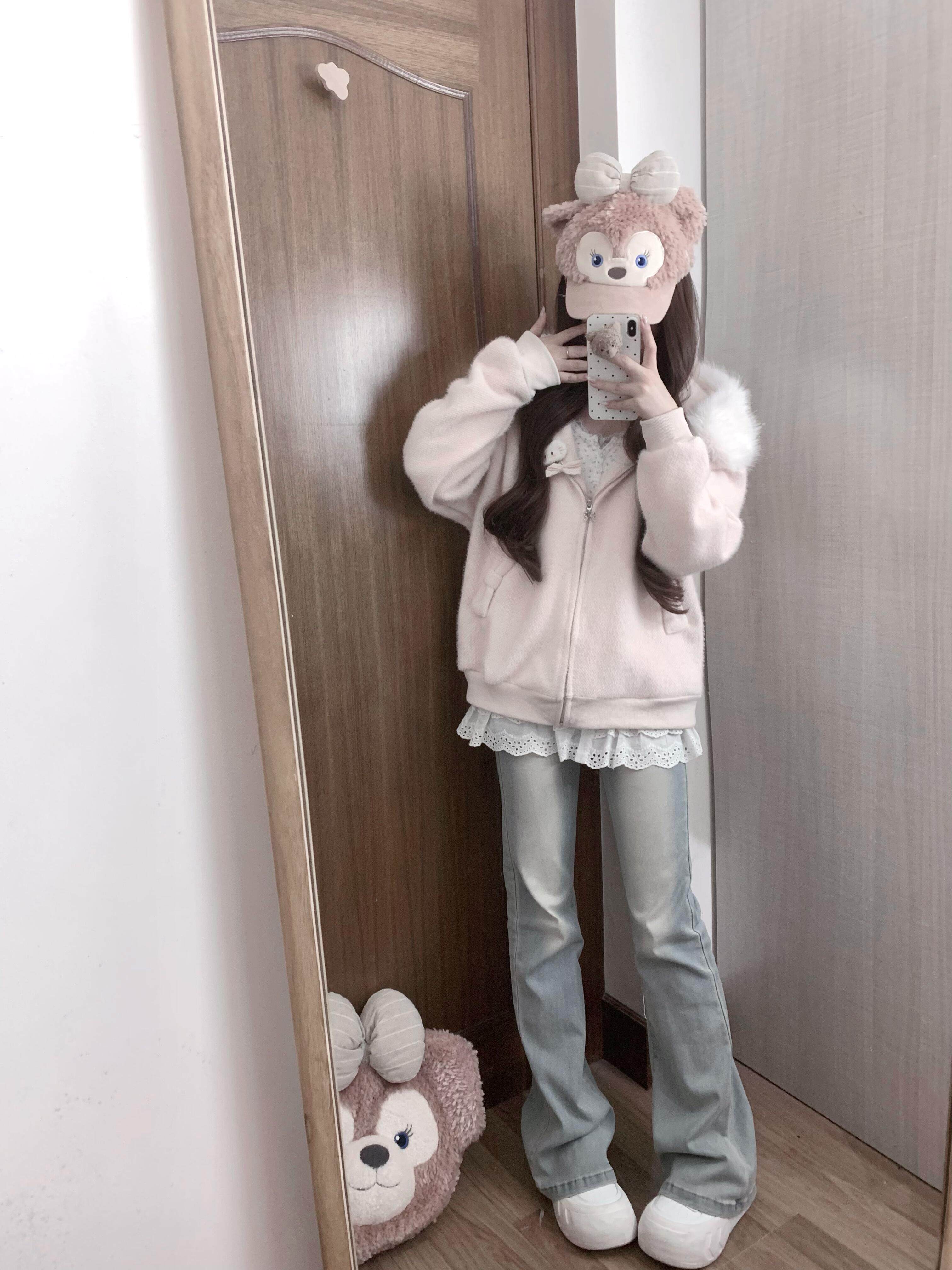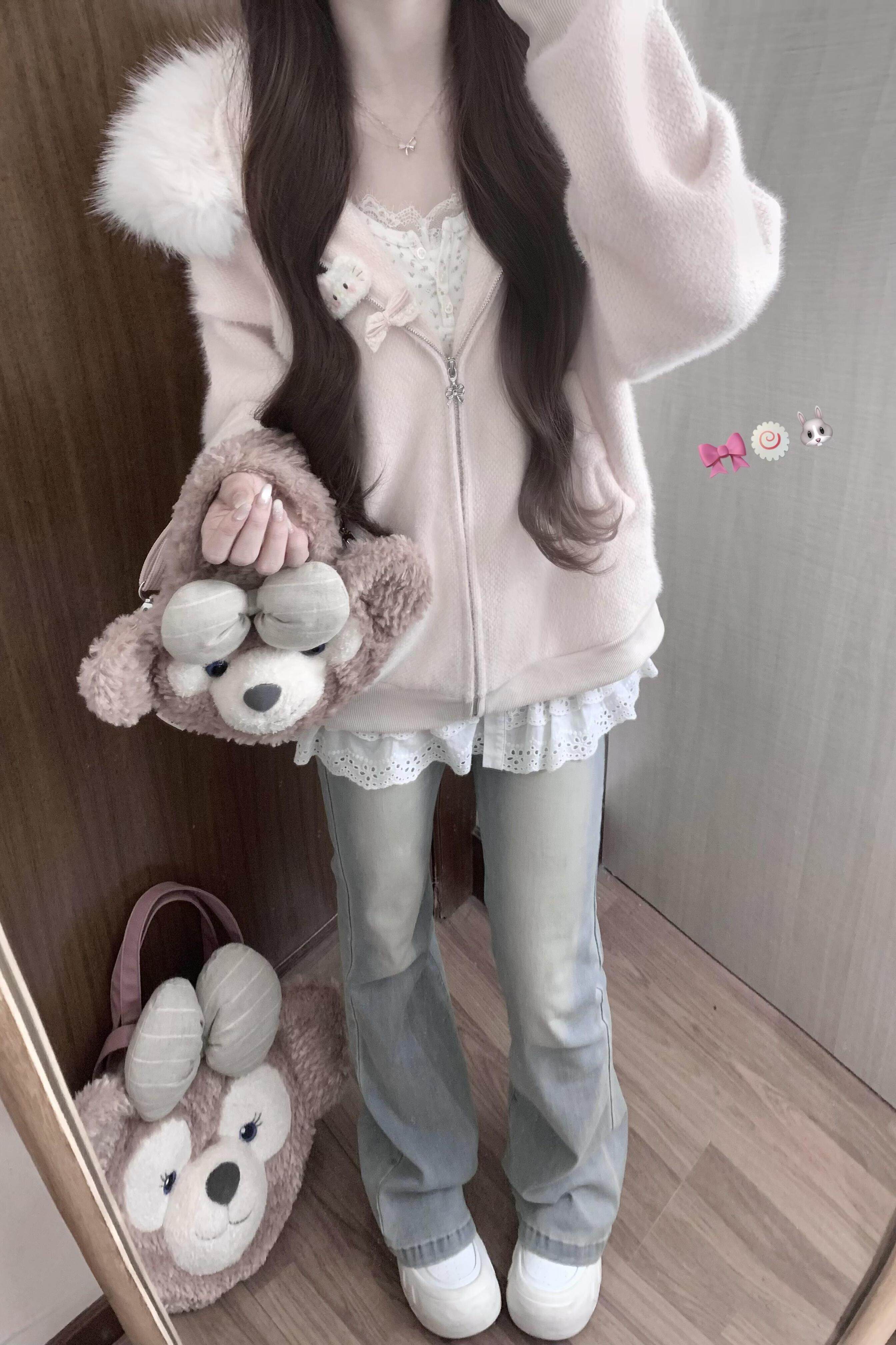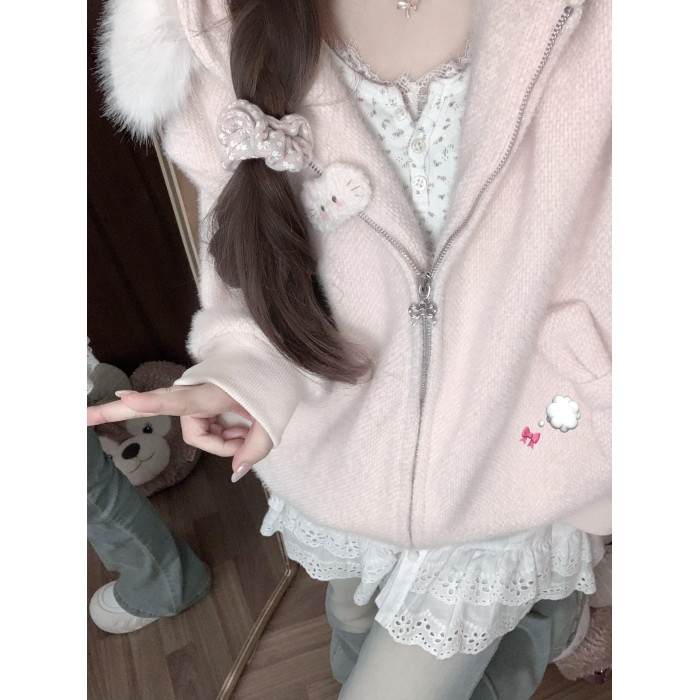 韓系高級感甜美粉色大毛領連帽針織開衫毛衣女秋冬季慵懶外套上衣